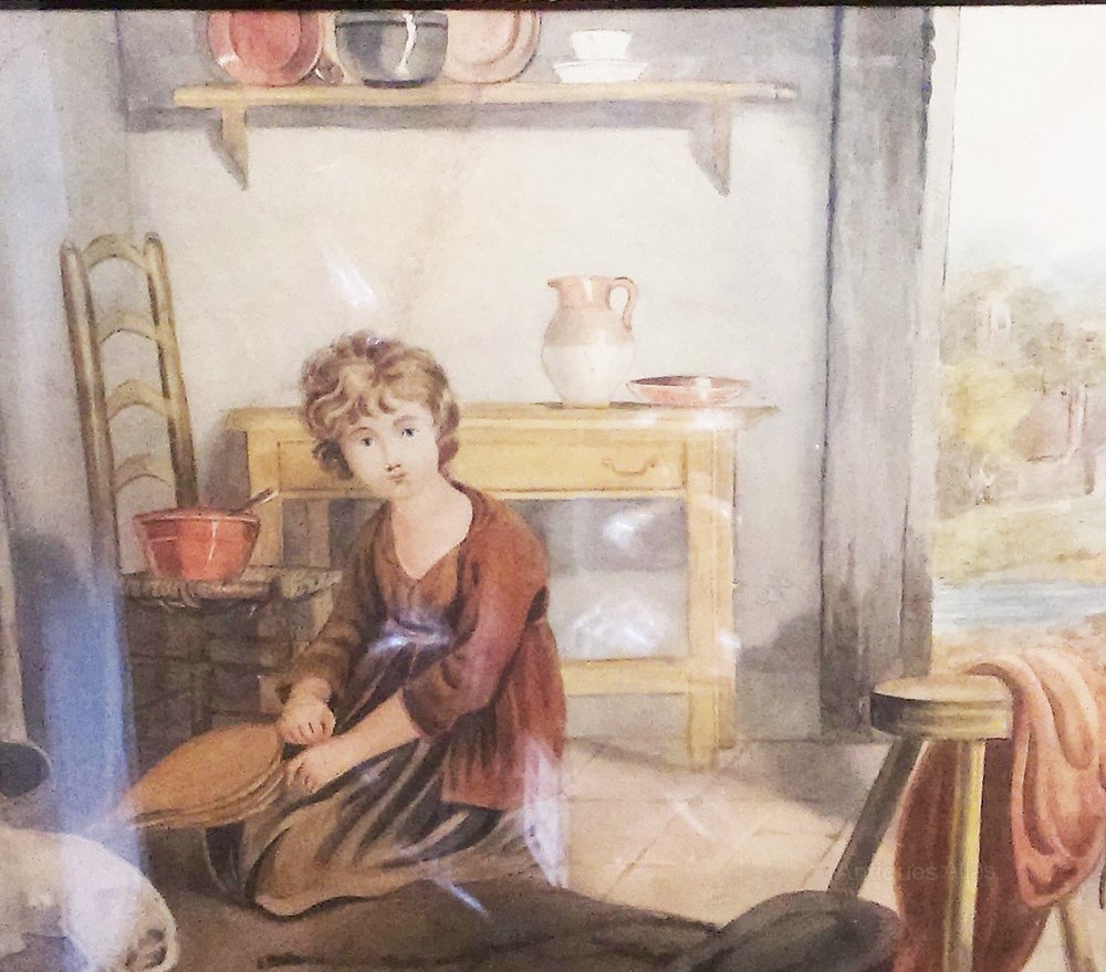 I find this an absolutely charming and unusual watercolour of a little girl kneeling by the fire in a cottage interior.I particularly like the unaffected simplicity shown in the little girls face and the period detail of the cottage interior and its primitive country furniture.