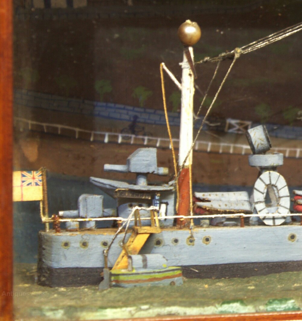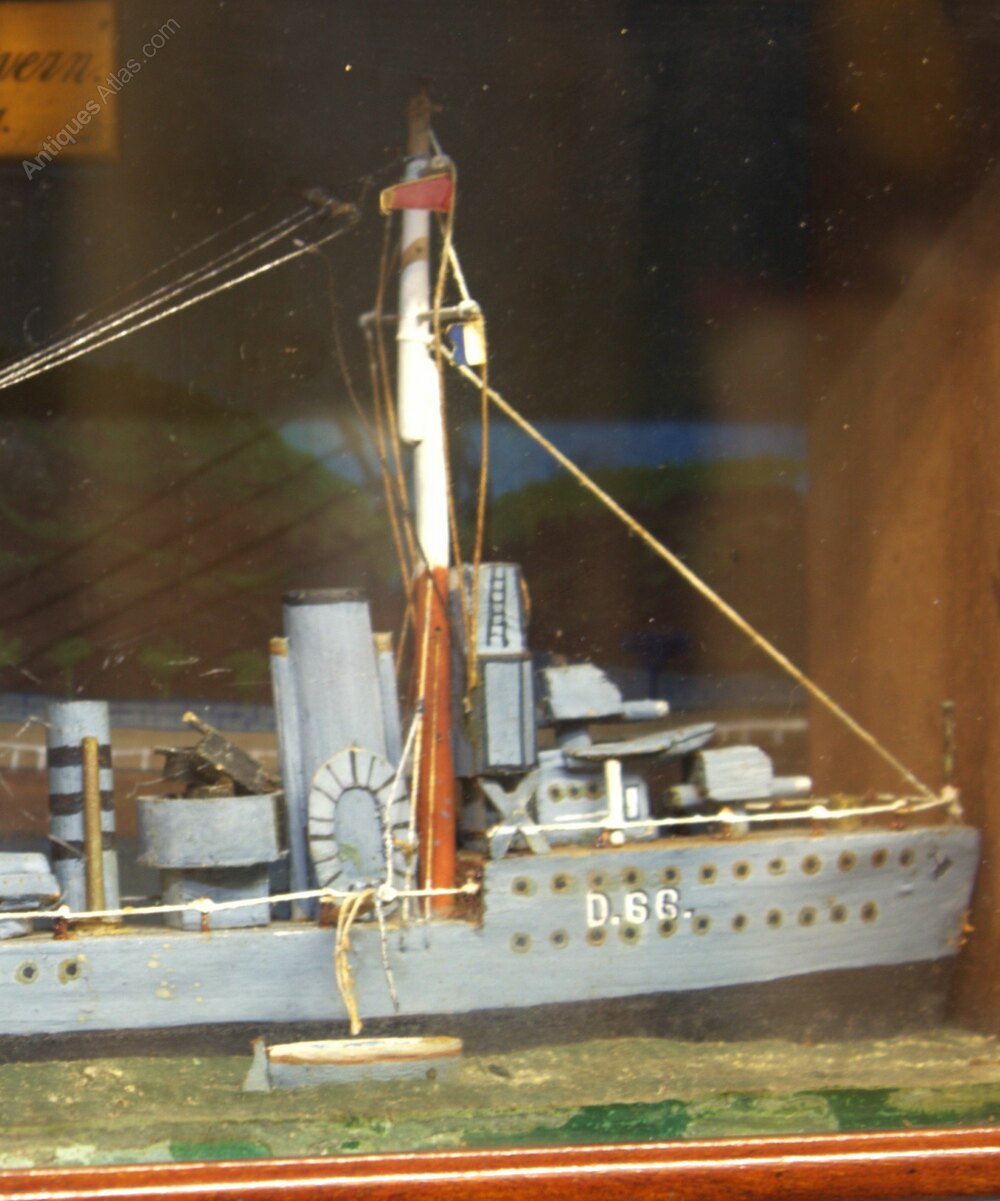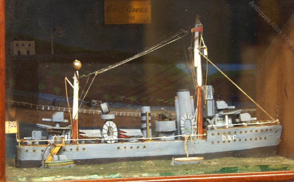 It is mounted in its original mahogany case. The back panel is painted with a charming landscape backdrop to the diorama, and has a brass plaque engraved with HMS Wyvern 1921.