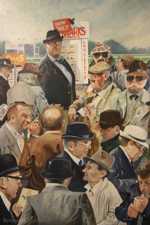 Dating from the 1980's, this betting painting is very well done and probably refers directly to real characters at the racecourse.