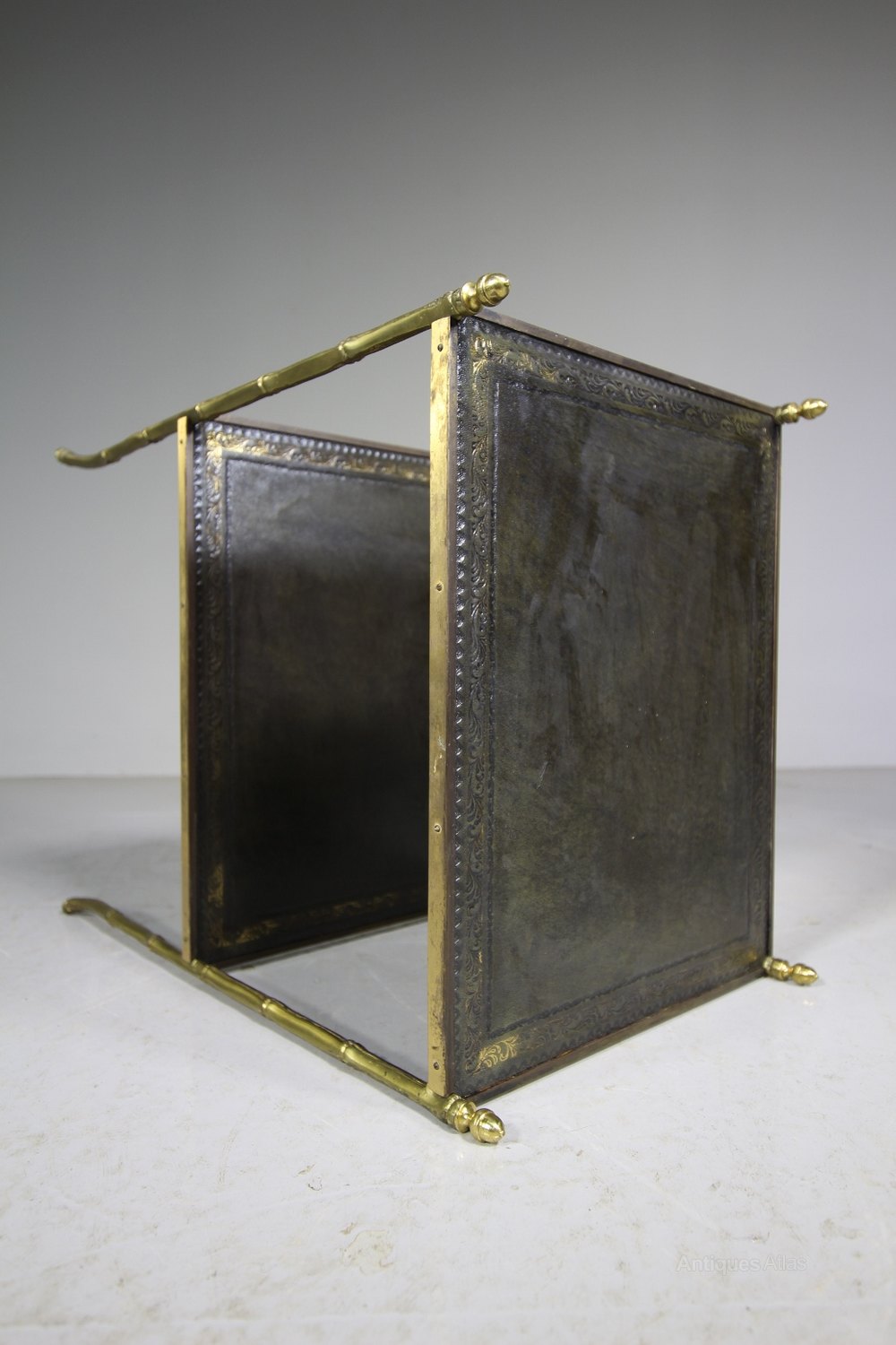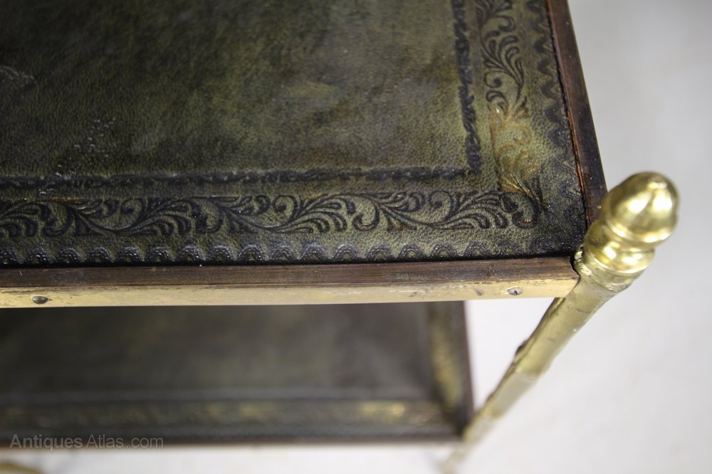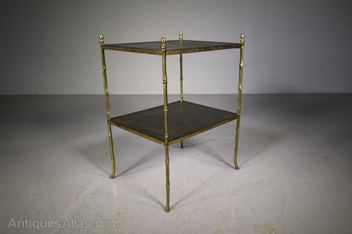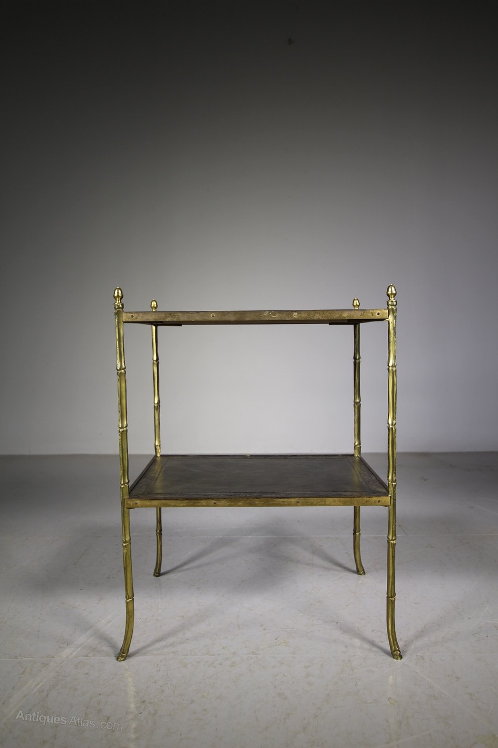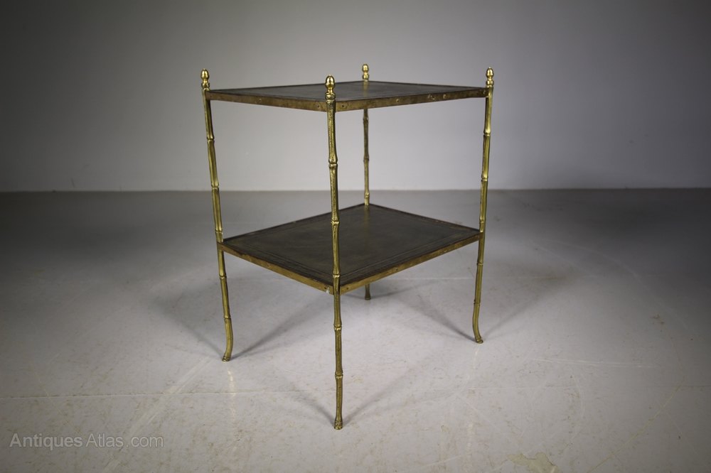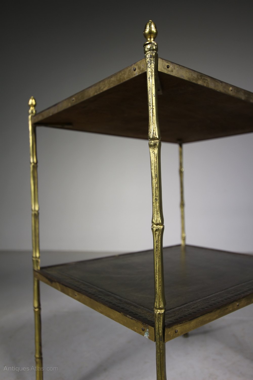 1950’s English Brass Etagere Side TableA good quality brass two tier etagere side table that has gilt tooled leather tops with simulated bamboo brass legs with acorn brass finials to the tops. In excellent condition, dates from the fifties.