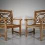 Set of Four Julian Chichester English Vintage Teak Garden ArmchairsA wonderful set of rare Julian Chichester solid teak garden chairs, a very expensive model to produce, beautifully made in England during the eighties, using the best quality teak timbers. All four are in very good solid condition, all very intact and labelled. They have each been thoroughly cleaned and will silver up again quickly. A lovely model having shaped slatted seats, open arms and with the decorative lattice back rests.
