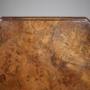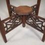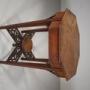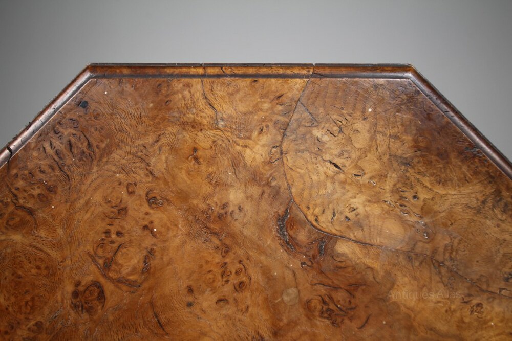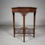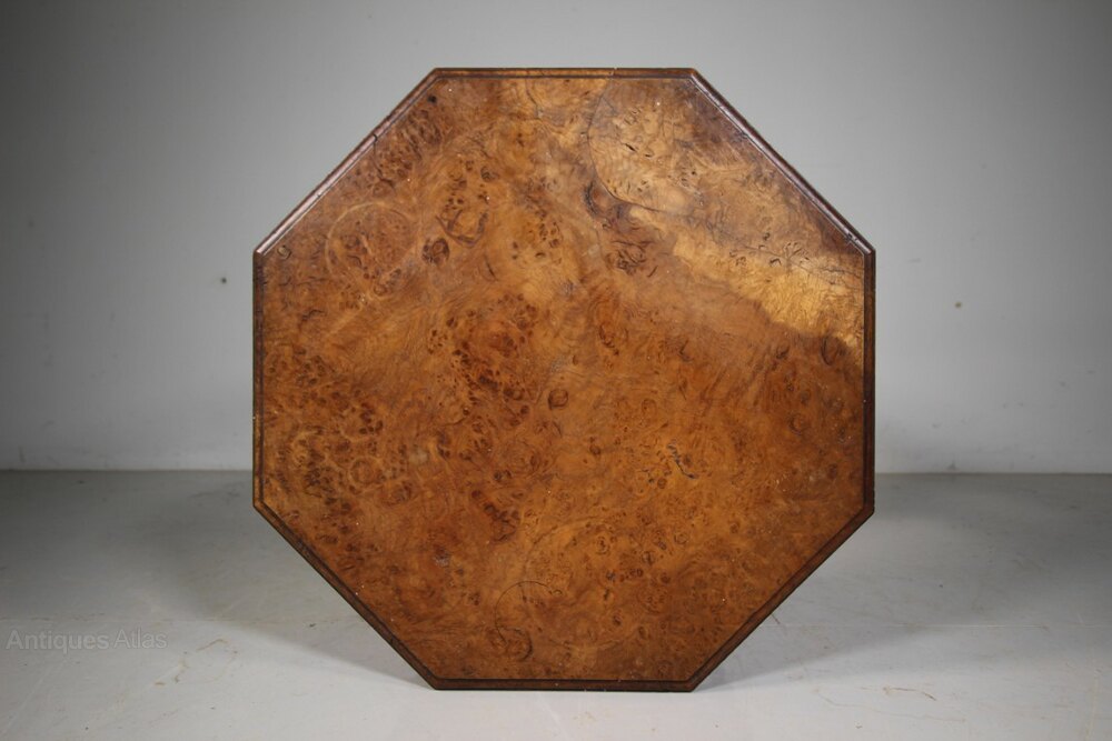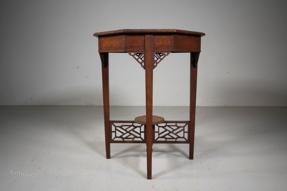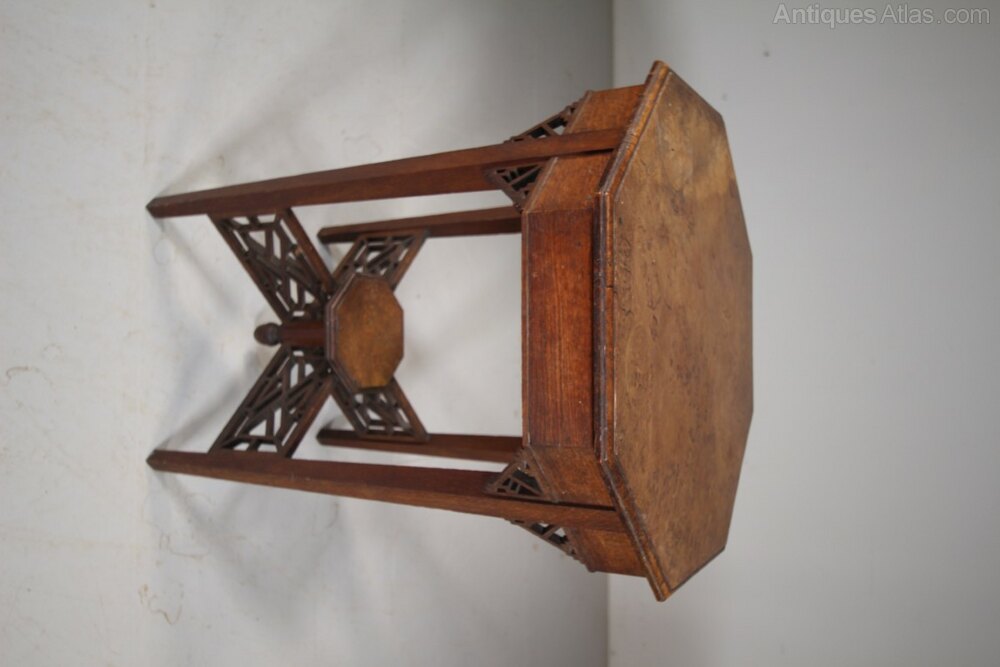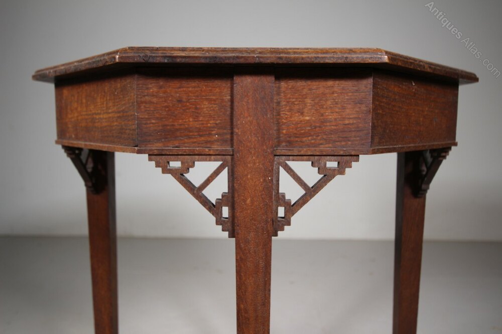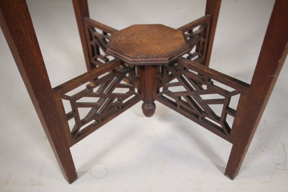 A very good quality, solid oak English 19th century antique octagonal side table very much in the Aesthetic style that was fashionable around 1870. This antique table top is one piece of burr oak, as is the small under shelf below. The other parts of the table are made in brown oak which is all a lovely colour. The four square and tapering legs have ornate pierced and geometric brackets with matching stretchers and to the centre is an upside down oak acorn finial. A more unusual antique Arts and Crafts side table that uses fabulous burr timbers. In excellent, strong and intact condition.