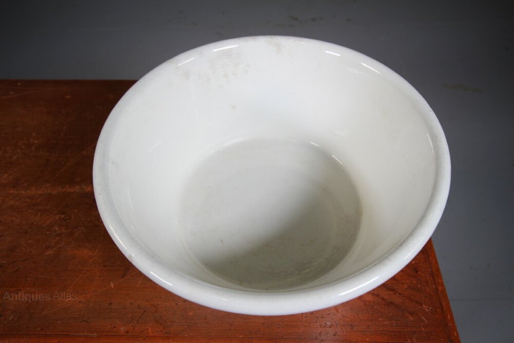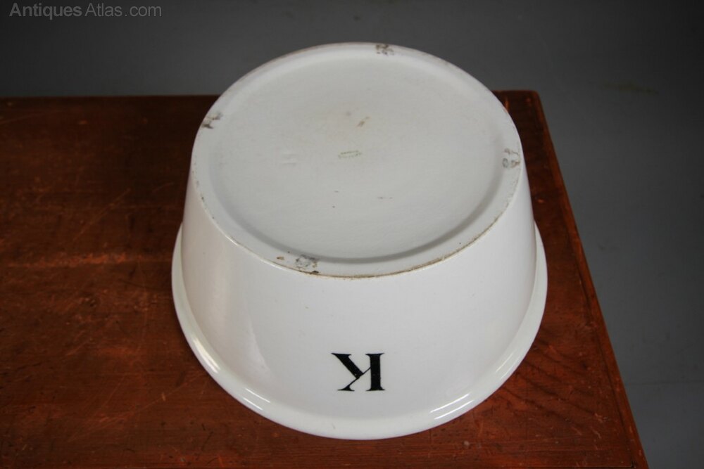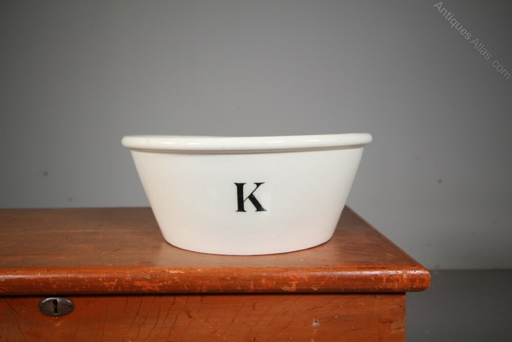 Large Edwardian Antique Creamware K BowlA lovely, large English antique kitchen creamware K bowl stamped by the maker Maling. In excellent condition, no repairs. The black large K stands for kitchen. A clean piece of Edwardian country house kitchen kitchenalia that dates to 1900.
