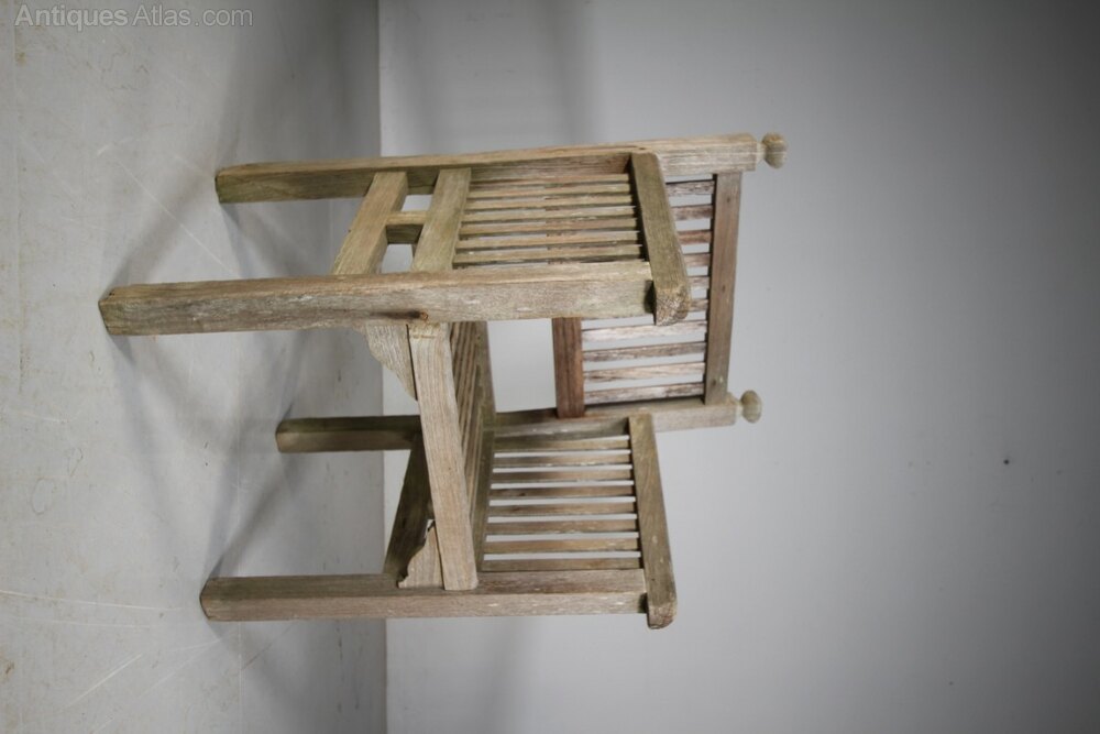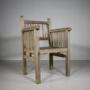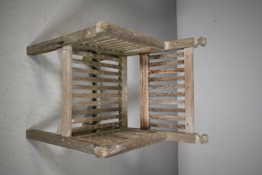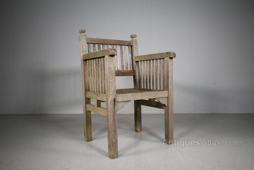 A fabulous Heals of London antique garden armchair, made in solid teak with a slatted seat, sides and back rest. The best Heals garden seat model having the decorative finials to the back rails, in the original Heals catalogue this model is known as The Duke model. Becoming quite a rare survivor, dating to around 1910, this Heals teak antique garden chair is in very good, solid and complete condition.