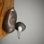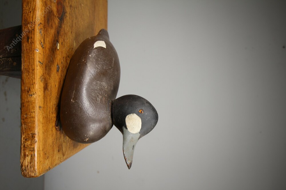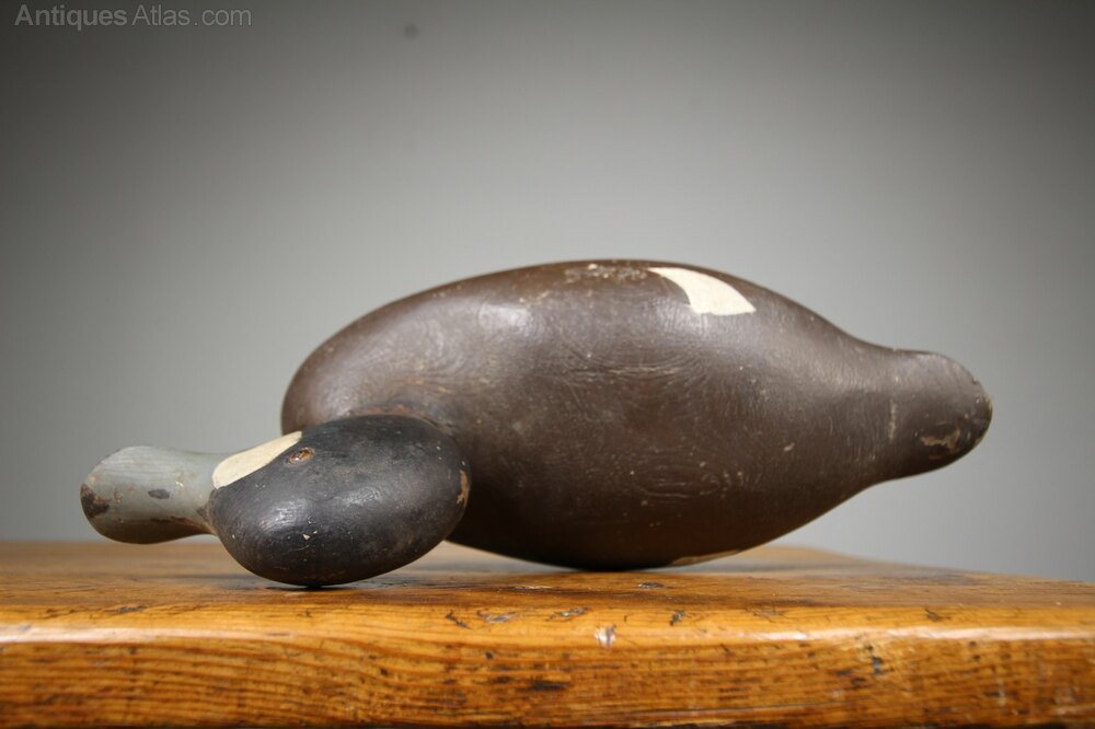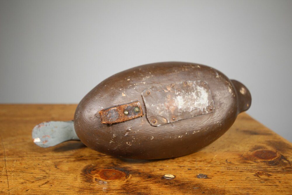 A lovely, totally original English antique decoy duck that dates to around 1900 and is still in the original paint and with its original glass eyes. Not one of the many fakes out there at the moment!Underneath has the original lead weight with leather attachment. A good example that is well shaped in pine and in the original paint finish.