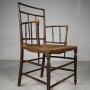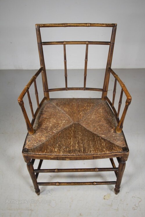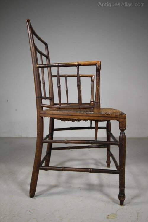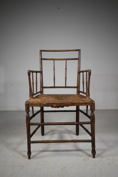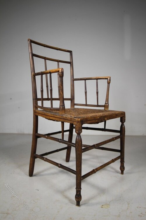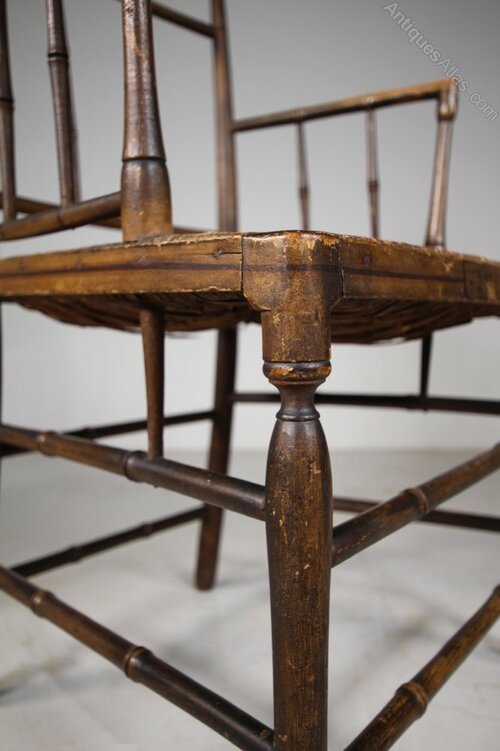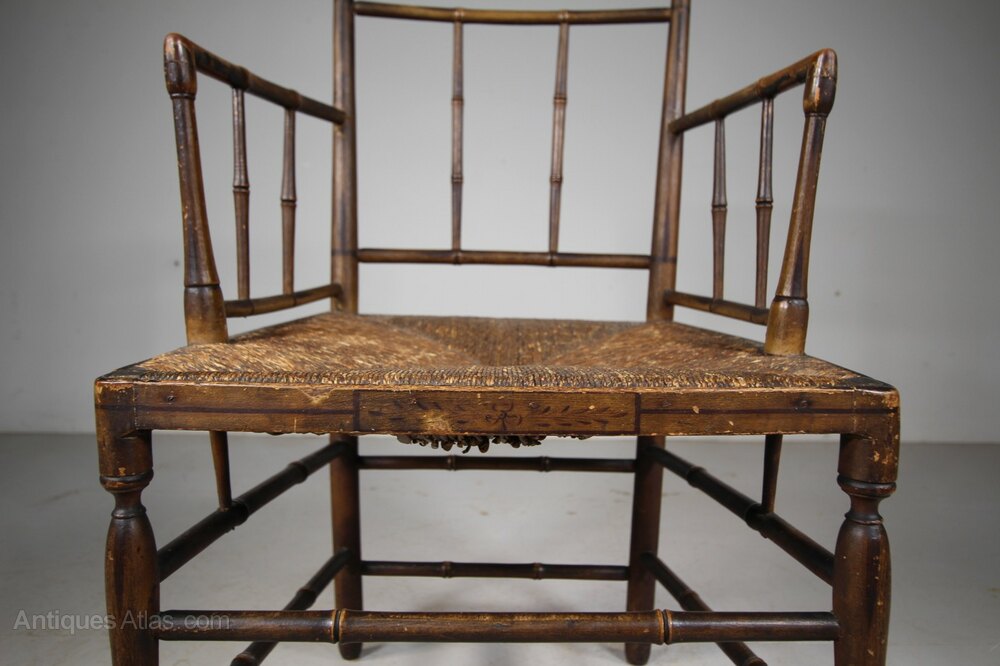 Fine Regency Original Painted & Decorated Antique ArmchairThis is a beautiful, English early 19th century fine antique armchair with simulated bamboo stretchers, the original traditionally rushed seat and lovely shaped open arms. A simple pared back Regency design, still in the original Regency painted finish along with original hand painted decorations. A beautiful example, in fabulous condition. The seat height is 44cm, perfect for a bedroom or dressing room. English and dating to 1815.