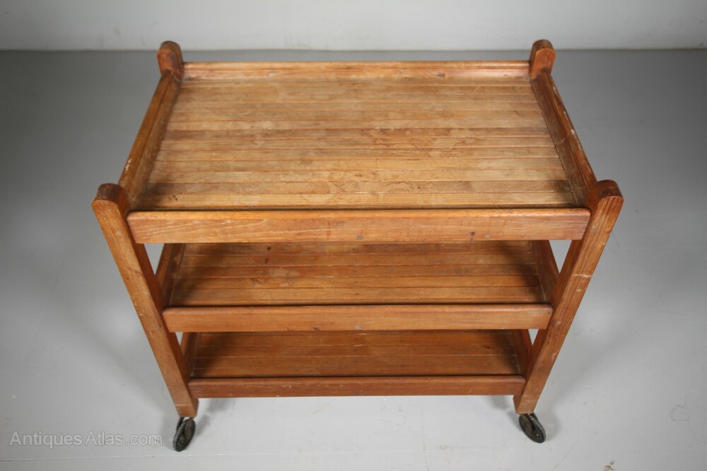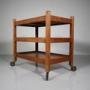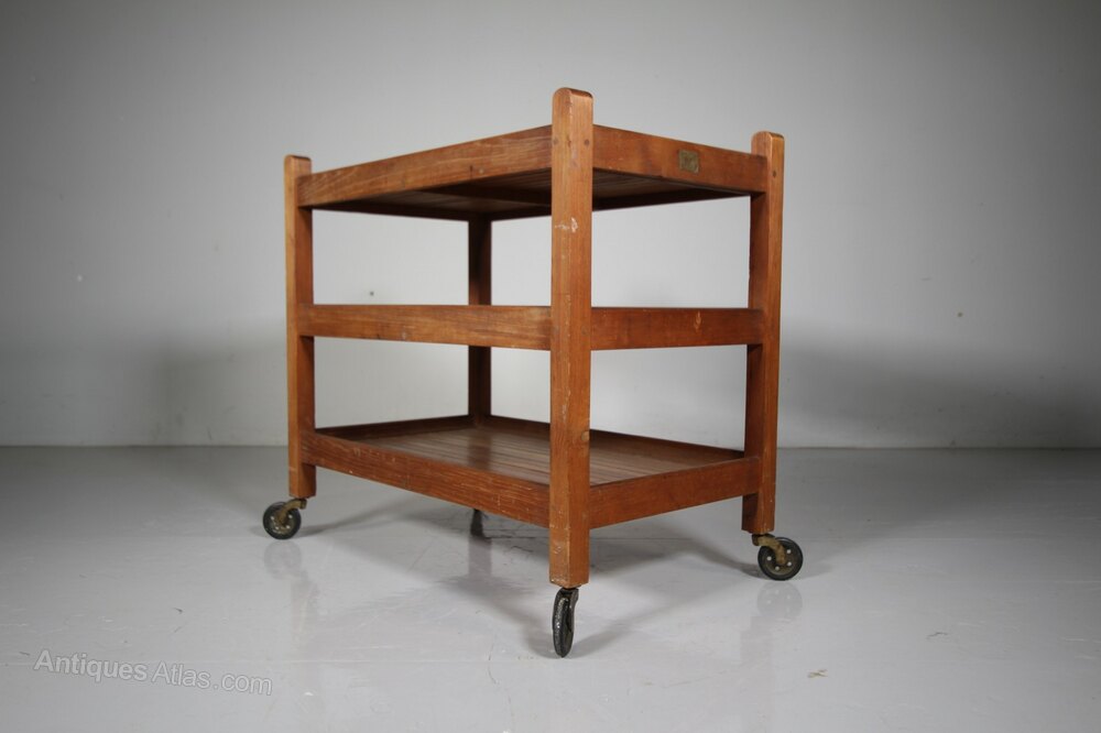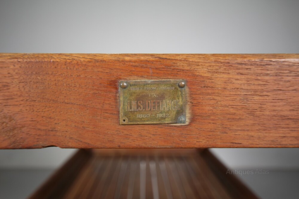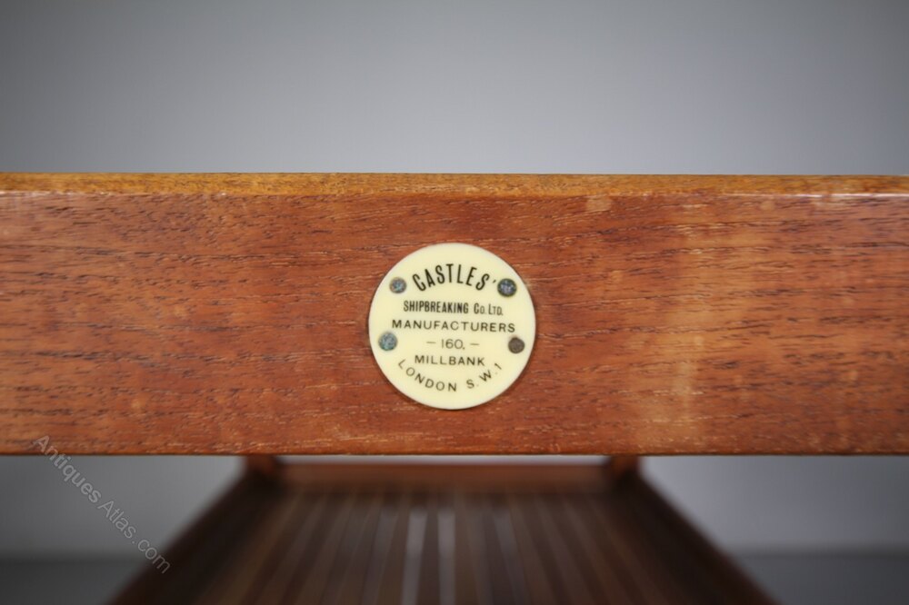 A super quality solid teak drinks or garden trolley made from de-commissioned teak timbers for the H.M.S.Defiance which served from 1860 – 1932. Made for Heals of London by the ship breakers, Castles of London. This is a fabulous example, that has never been used outside so s in superb condition and is complete with the H.M.S. Defiance plaque and also the Castles makers label. Featuring three slatted tiers and the trolley moves around easily on four, full working large original wheels.