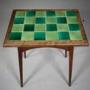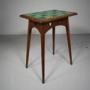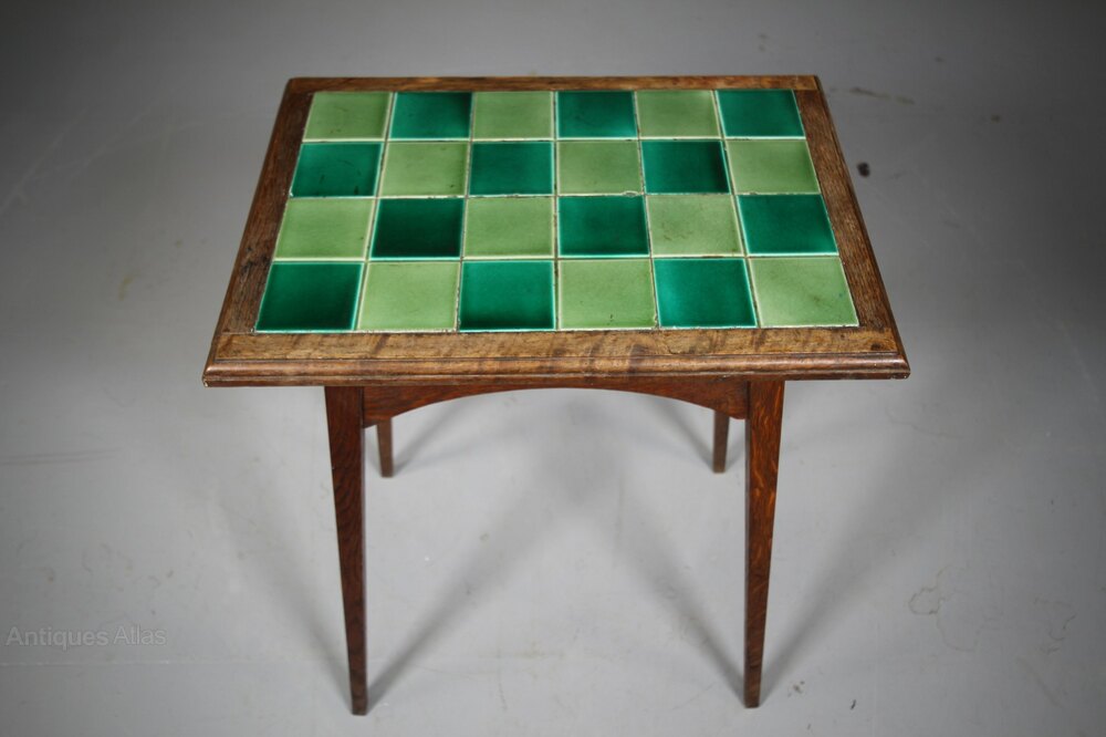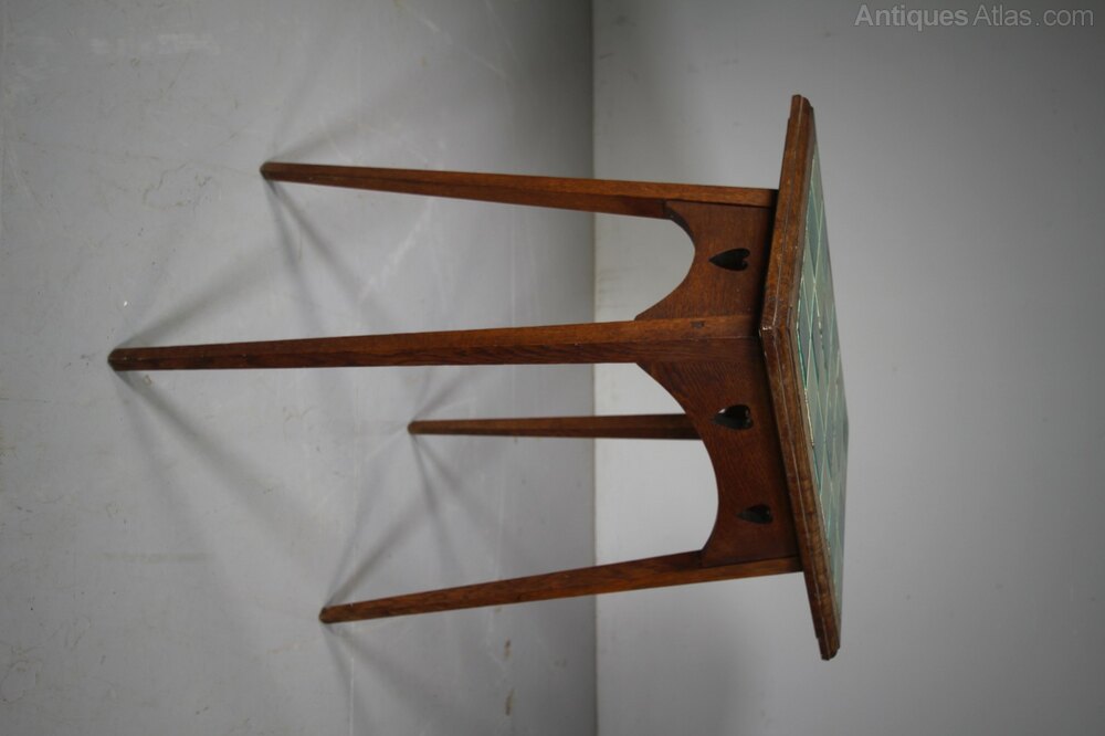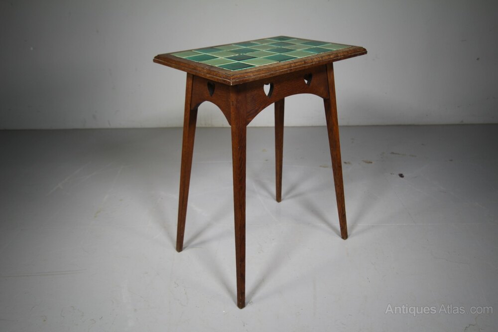 A quality made English 19th century antique solid oak side table by Liberty London around 1880. Very much in vogue of the Arts & Crafts movement, the heart motif was used for a short number of years by English furniture makers, this table is by Liberty London and is in excellent, strong condition with the pierced heart decorations to all four sides with a nicely moulded border and complete with the lovely green original tile table top. Stands well on square tapering legs that are splayed with a connecting shaped apron to all four sides.