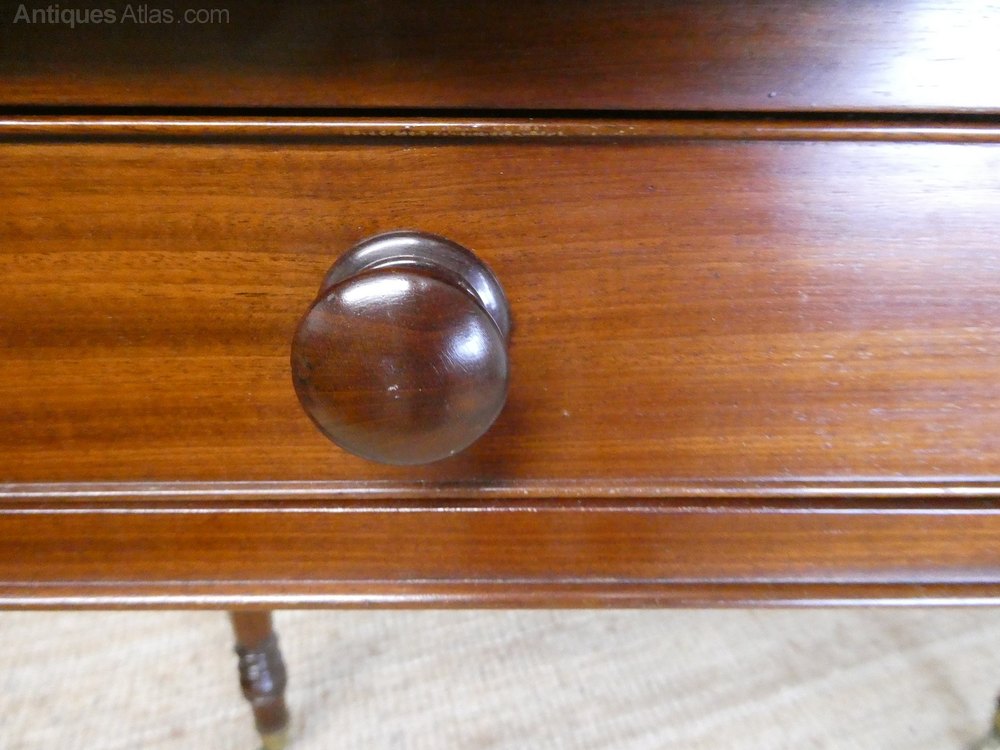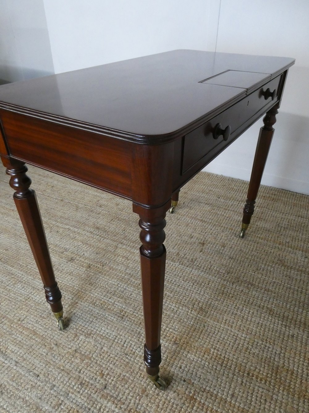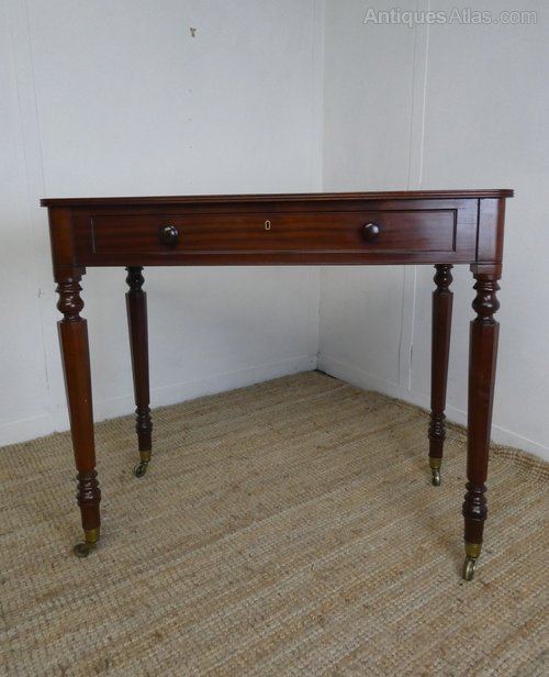 A good quality 19th century writing or side centre table in the manner of Gillows. The table with a small lift up pen tray, a single drawer with original knob handles, rounded corners and standing on elegant legs with original brass castors.The table is in good condition, minor marks to the top as photo.