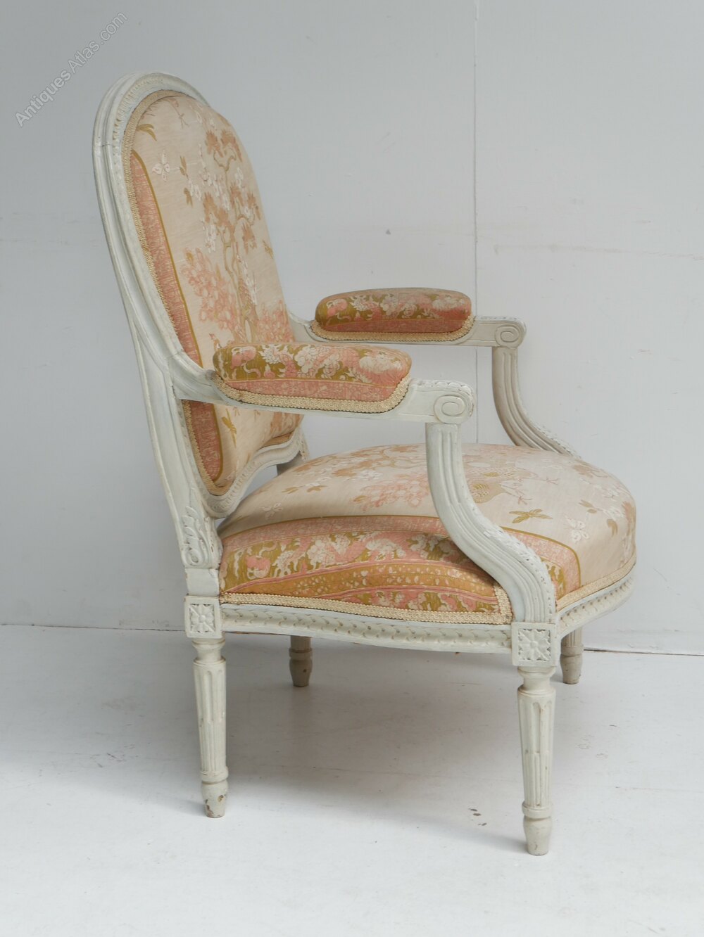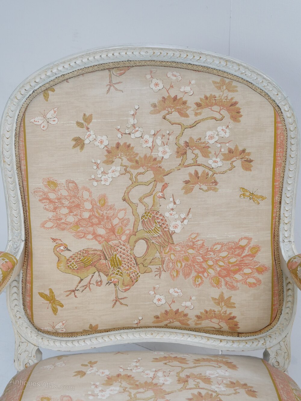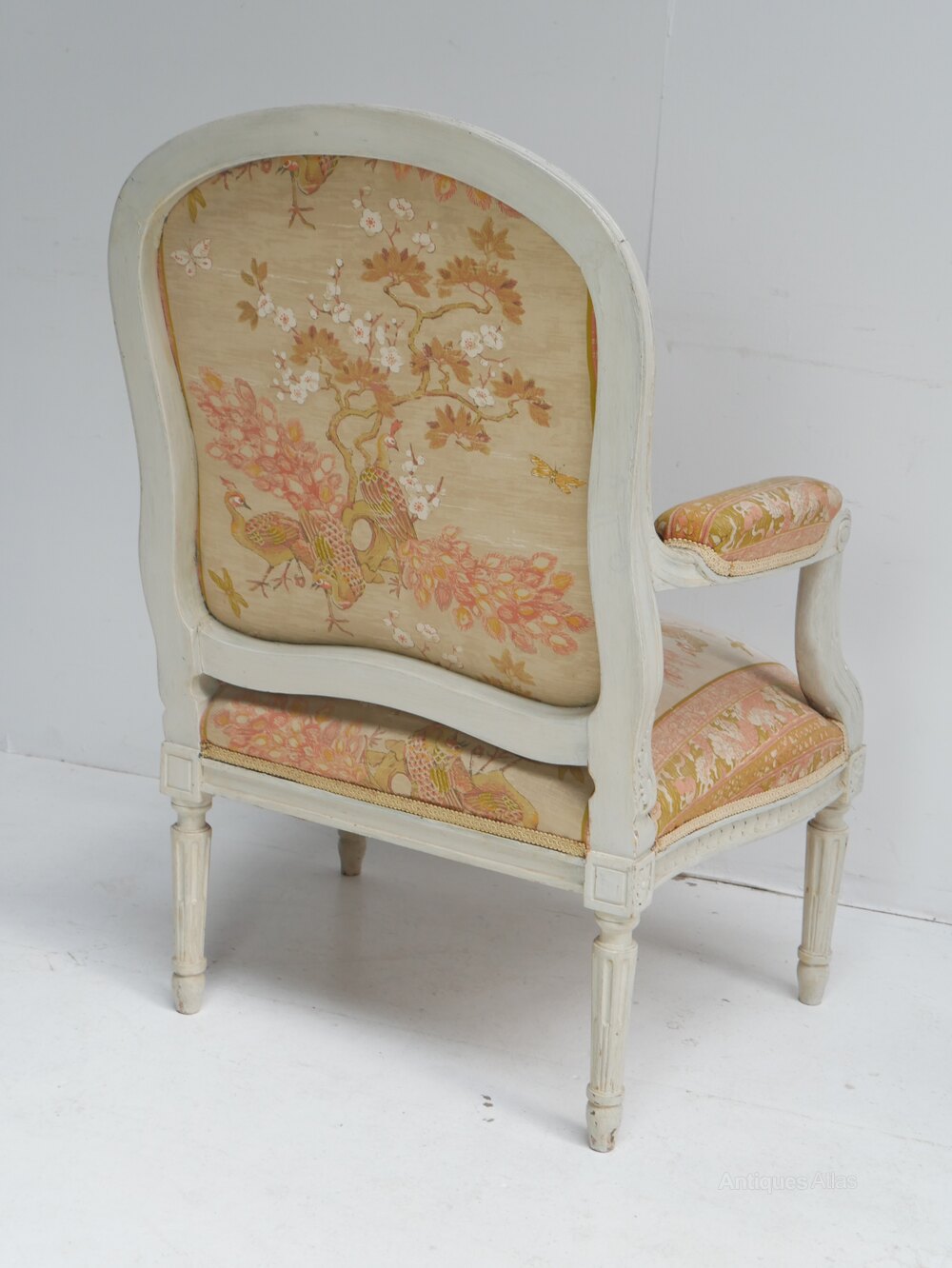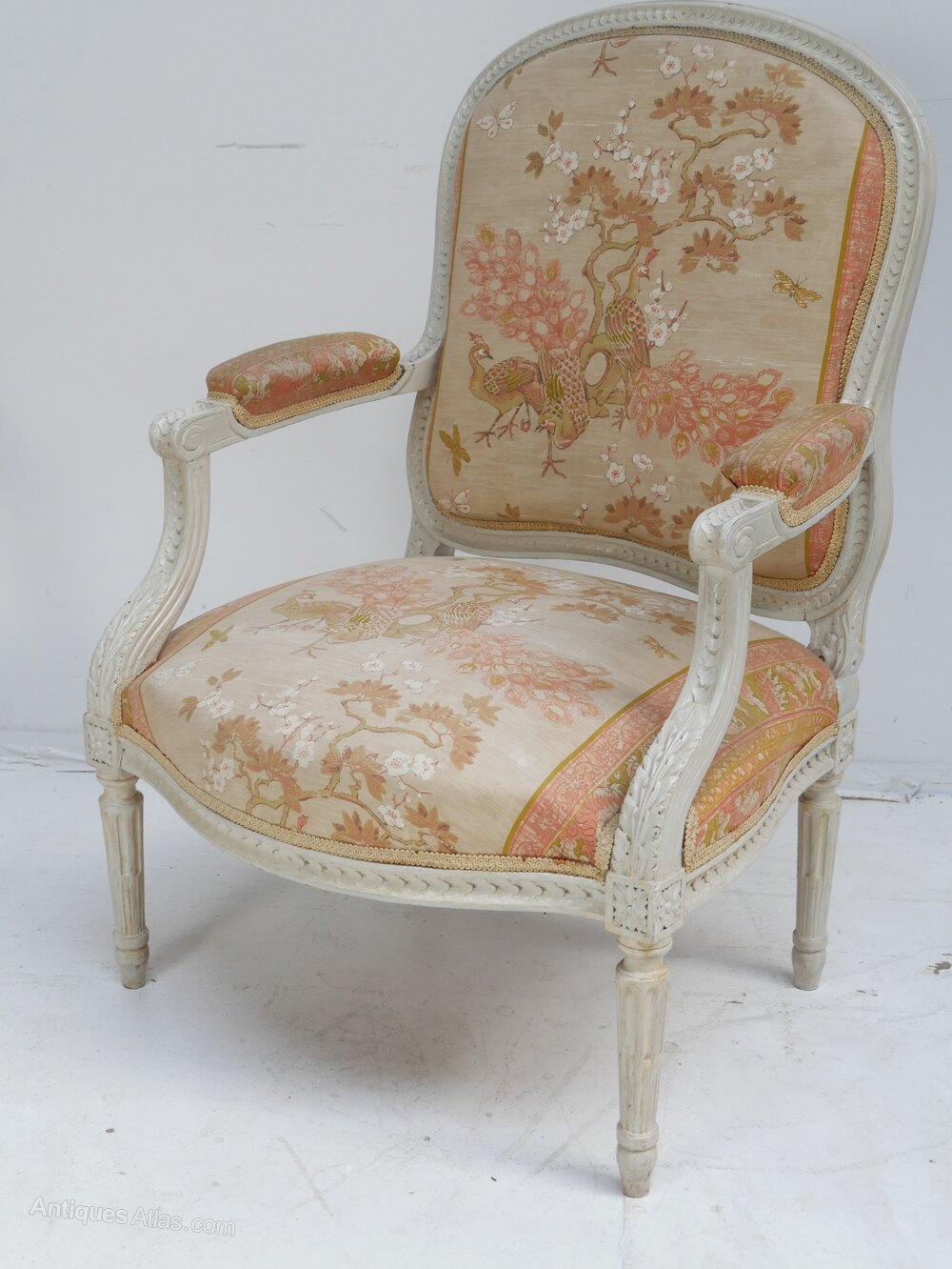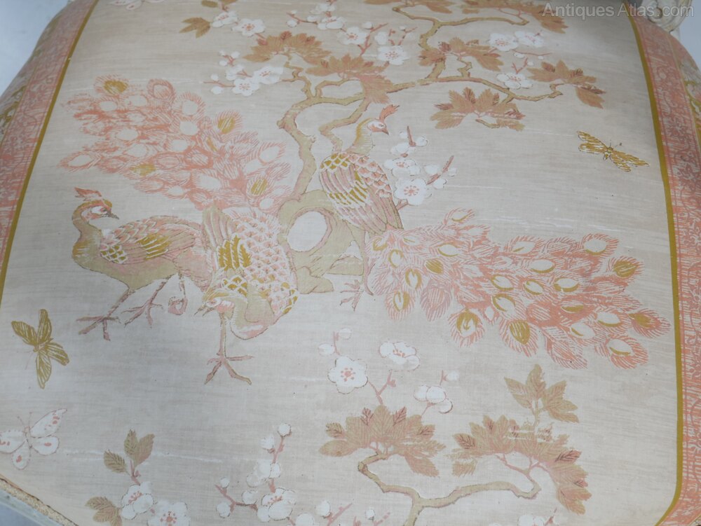 A good quality pair of 1900s cream painted armchairs upholstered in a chinoiserie design fabric, the chairs are both in good condition with a seating height of 39cm, fabric quite usable, both ready for use.Currently free UK mainland delivery available.