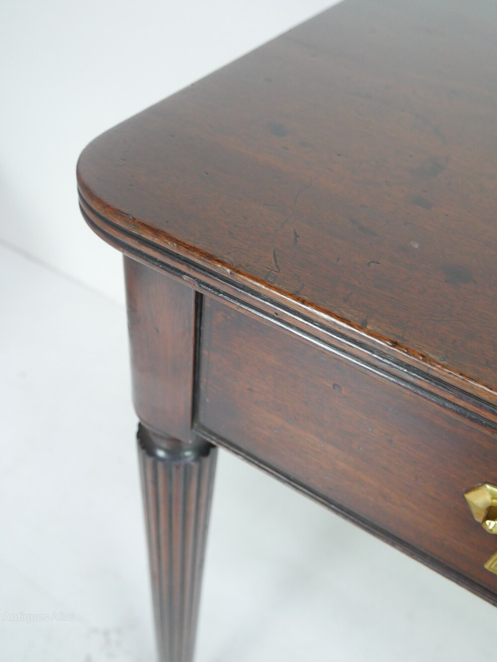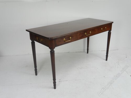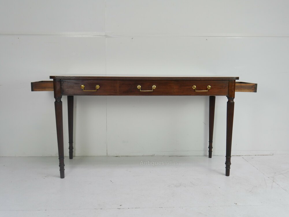 A elegant 18th century mahogany console or hall table. The table top has rounded corners, a side drawer to either end, with three faux drawers to the front, all with original handles, standing on well designed reeded legs.The table is in good strong condition, well made with very good quality timbers around 1780, some historic wear to the top, see photos, all ready for use. Some extra photos available.