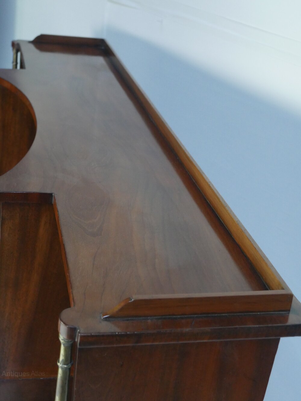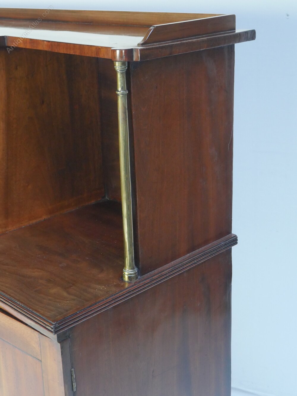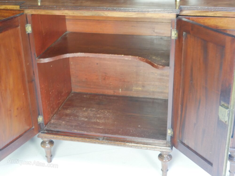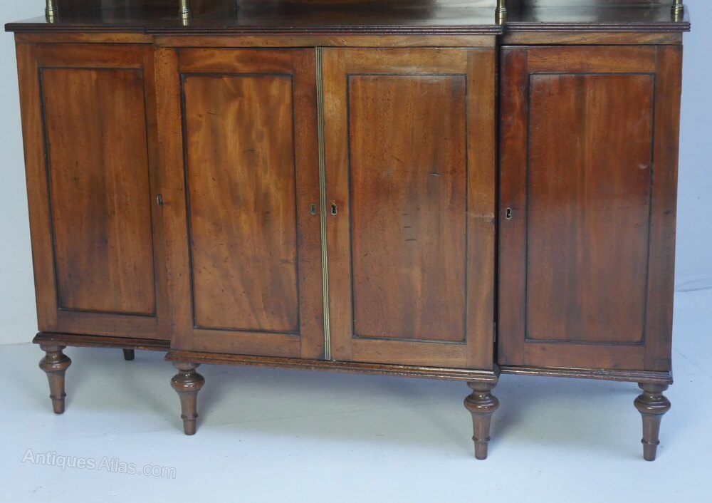 A very good quality Sheraton period mahogany side cabinet, two centre doors to the base, opening to useful cupboard space, further single door cupboard to either side, standing on elegant turned legs. The top has a display area with lovely gilt brass balusters supports, well shaped concave top with a neat gallery.Top interior centre height 31.5cm width 56cm, sides width 26cm.