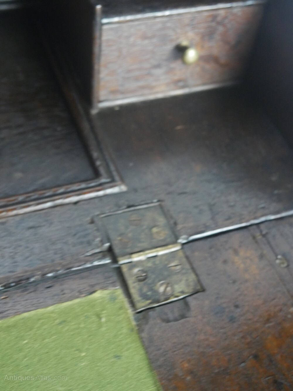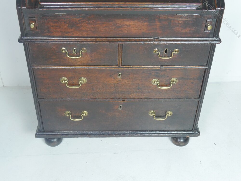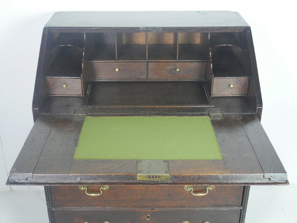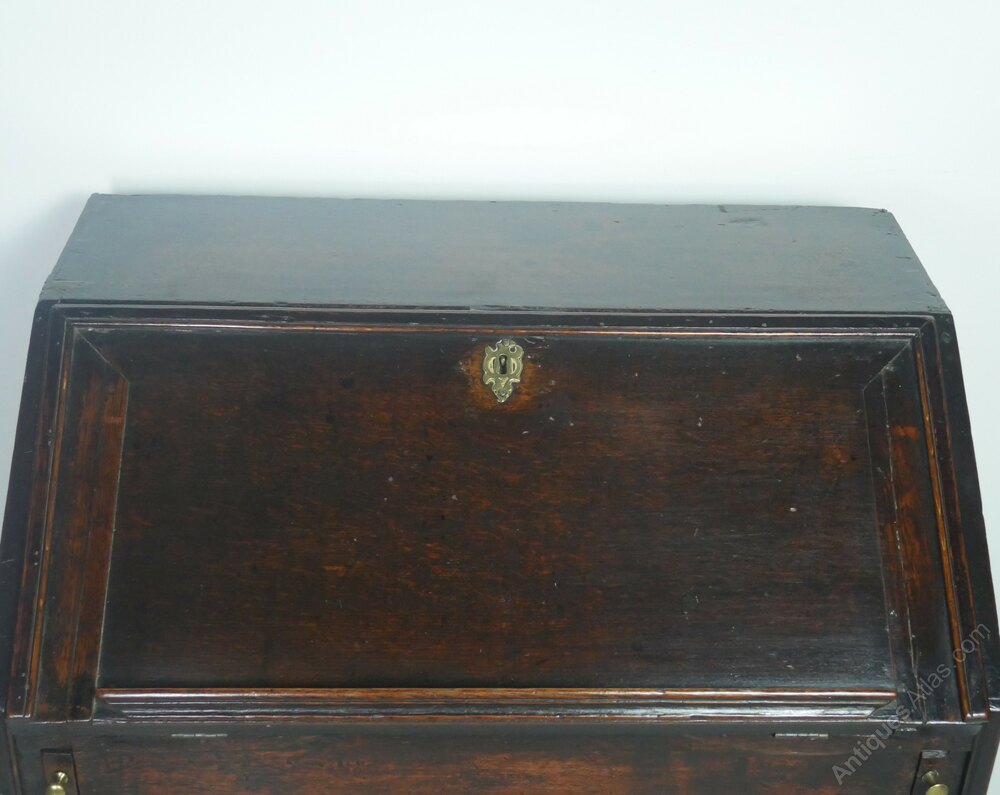 A charming small oak Queen Ann bureau made around 1700, two long drawers with two short drawers above, the fall front lid opening to a green bias working area, with various drawers and pigeon holes. A useful slide well giving secret storage, the bureau has a generous seating height of 74cm, standing on bun feet The desk has been through our workshop, all very usable, free running drawers all strong and stable, ready to enjoy and use.A few extra photos available.
