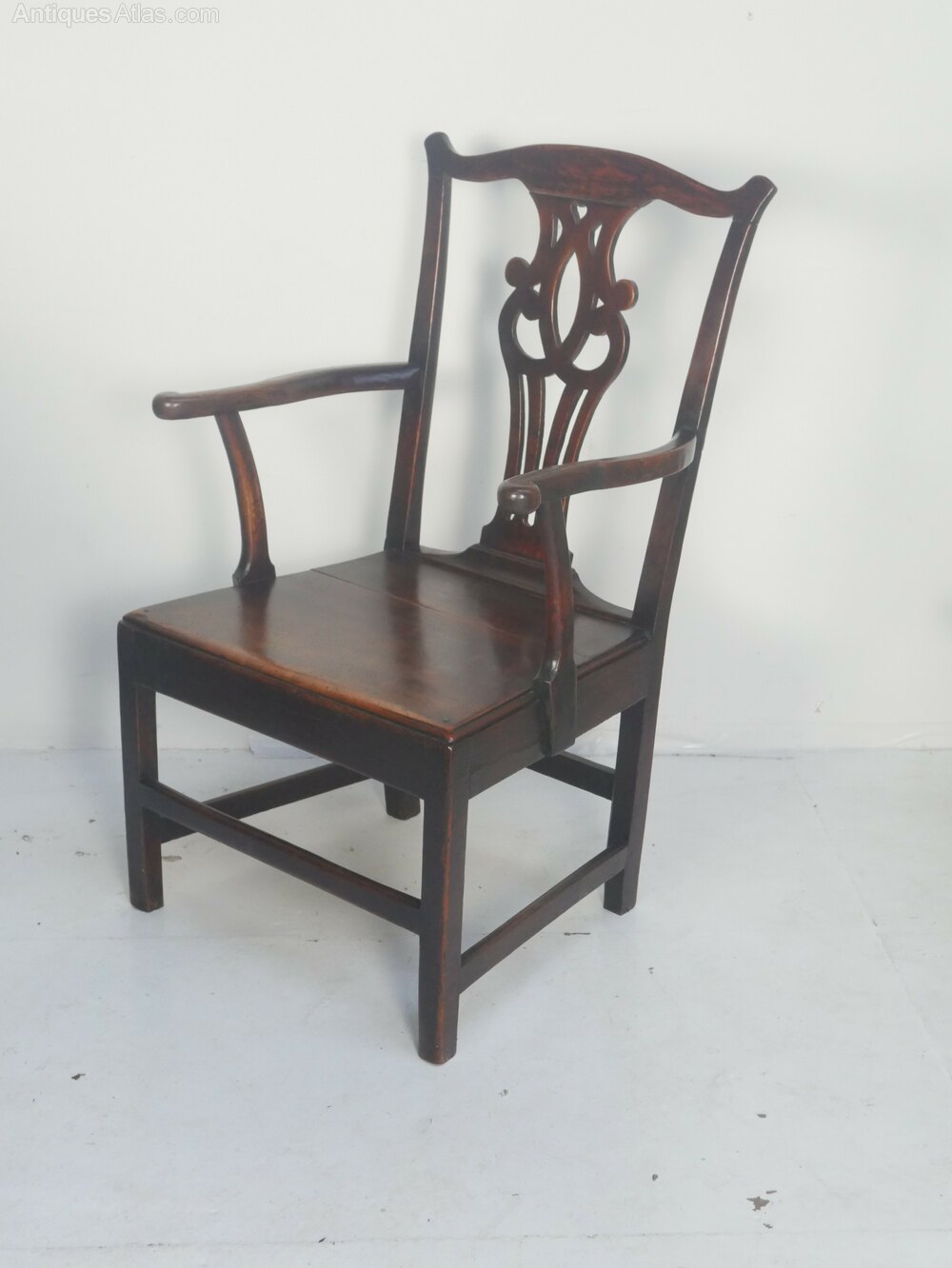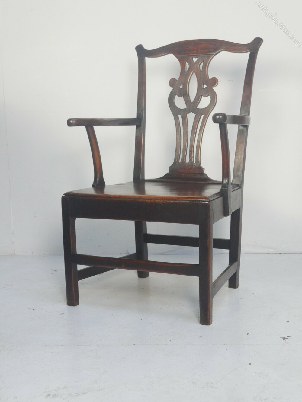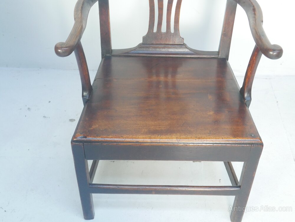 A charming 18th century country armchair in oak, well shaped arms, a lovely splat with a small heart carved to the top. The chair has been through our workshop. some historic treated woodworm, seating height 41cm, all firm waxed, with a warm colour and ready to be enjoyed.UK mainland delivery quote £50