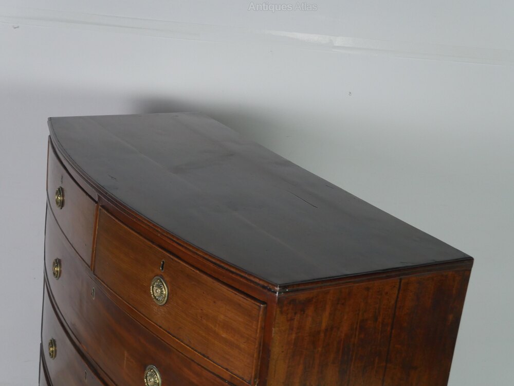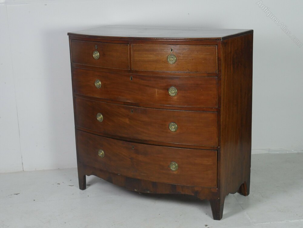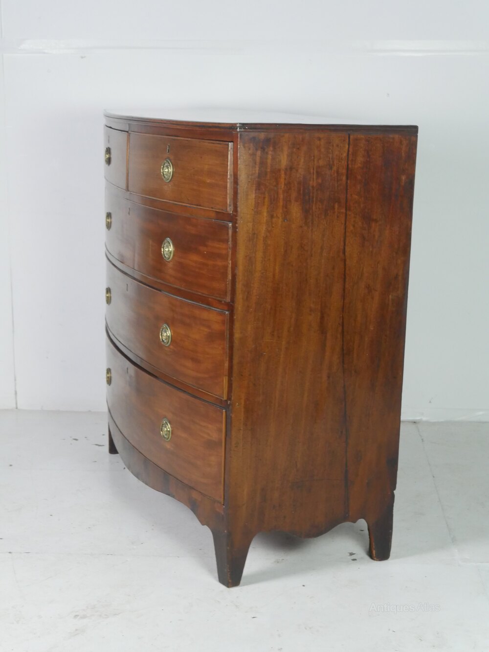 A very useful late Georgian bow chest of four high graduated drawers three long and two top drawers above, standing on splayed feet. The chest gives excellent storage with free running drawers, British made around 1800, in good strong condition, ready for use.UK Mainland delivery quote £60