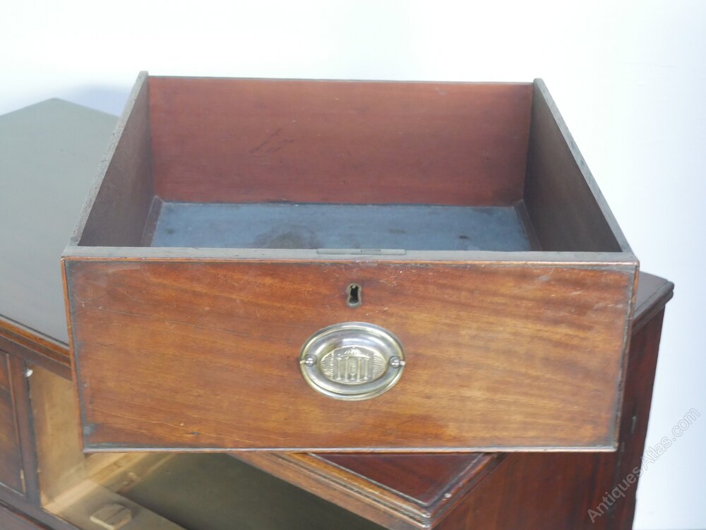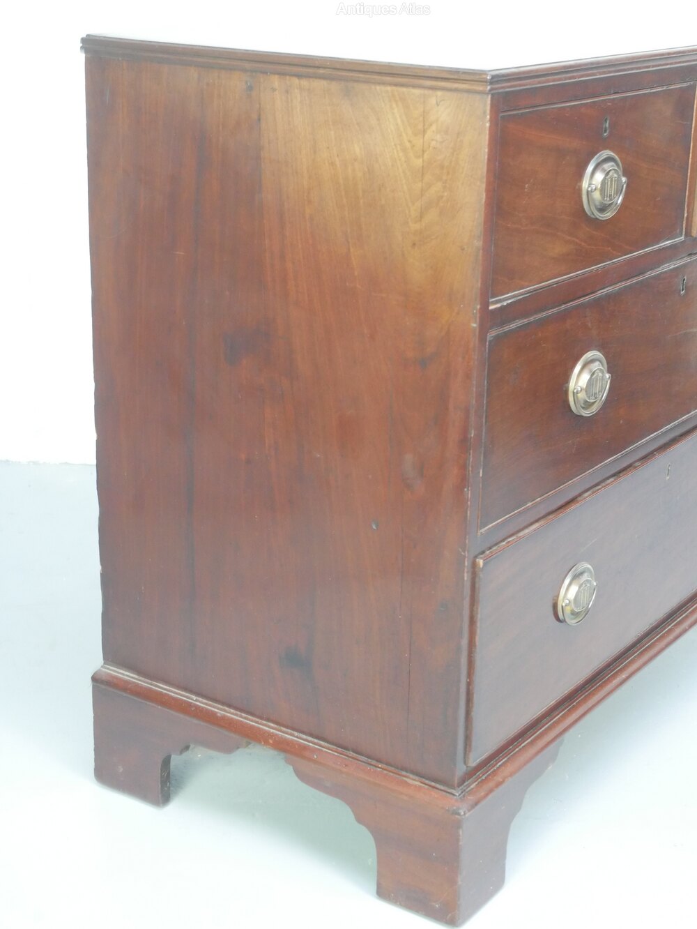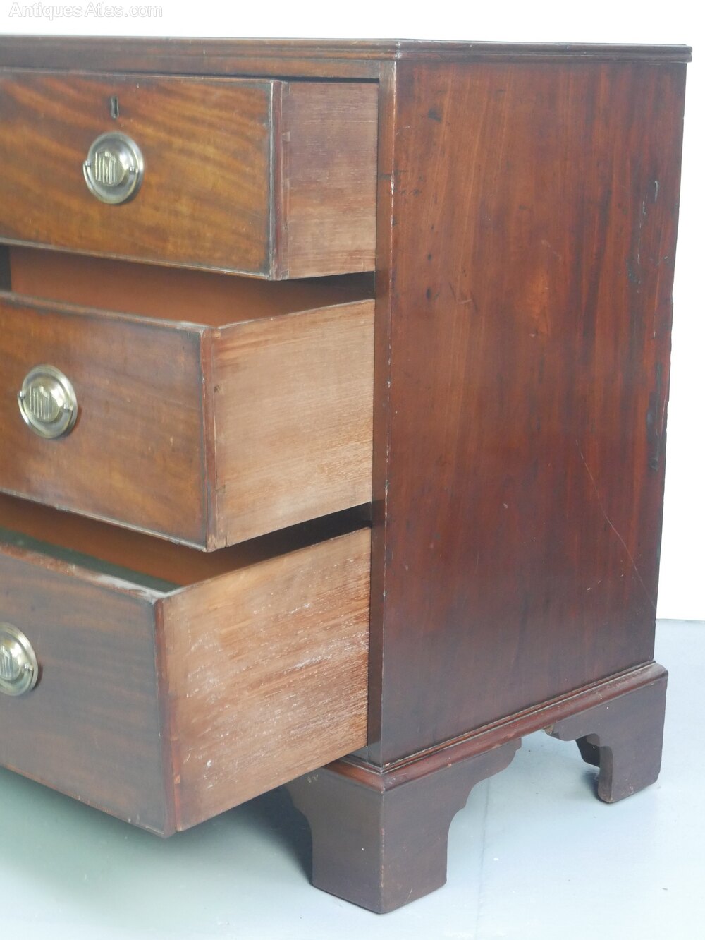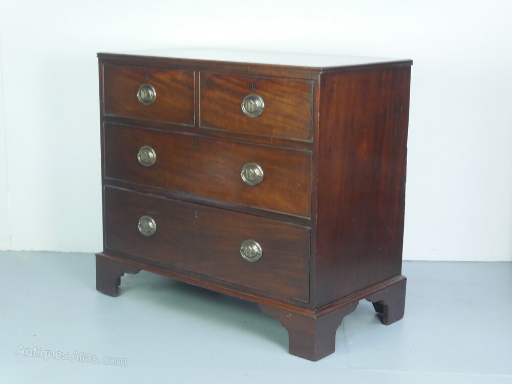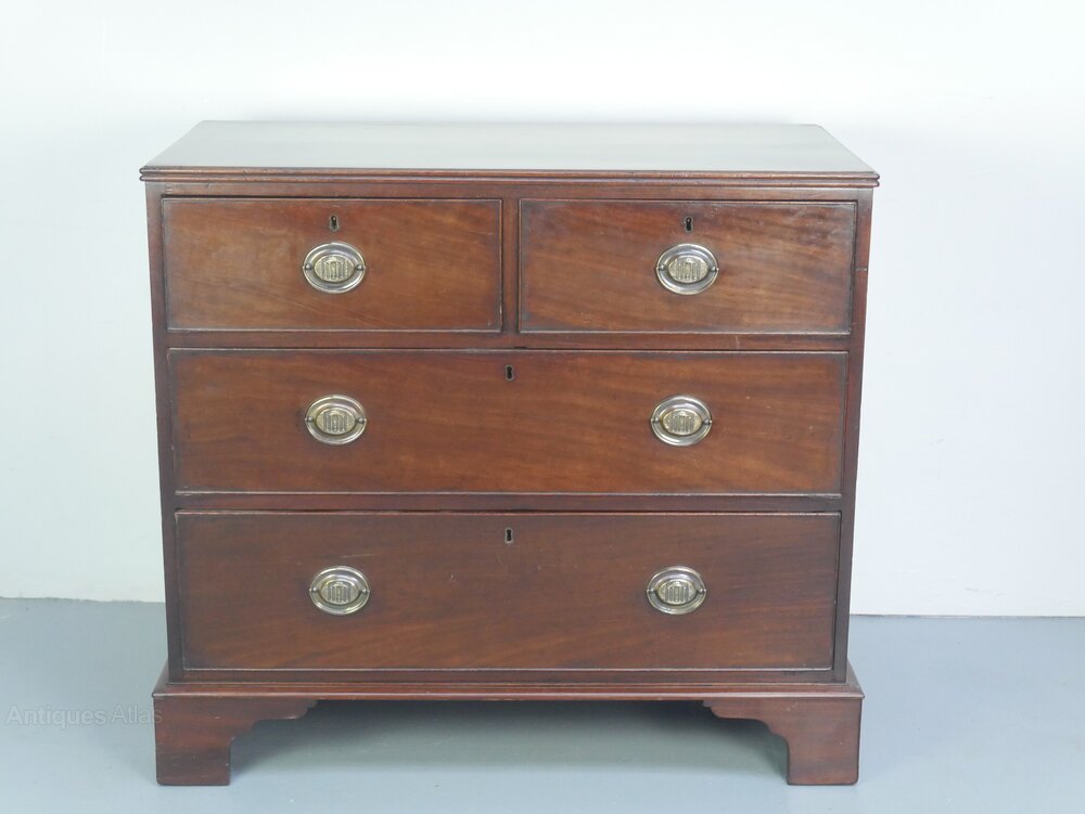 A very useful Georgian mahogany chest of two long drawers with two short drawers above, oval brass handles, standing on strong bracket feet. The chest is in very good condition, good height for many rooms, free running drawers, made around 1780-1790, good colour, ready for use.Currently free UK mainland delivery available.
