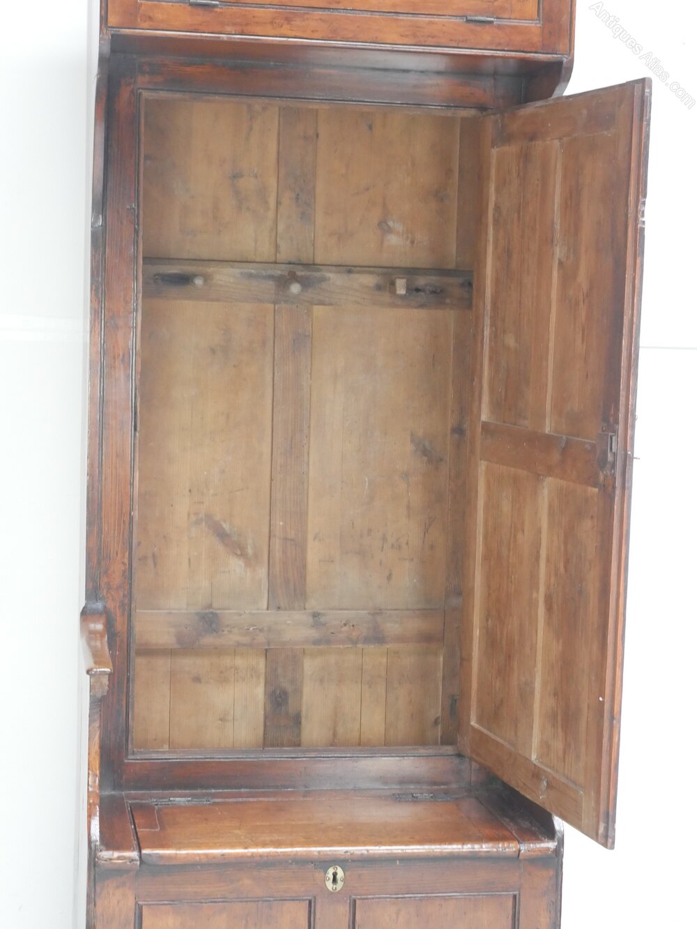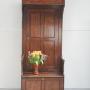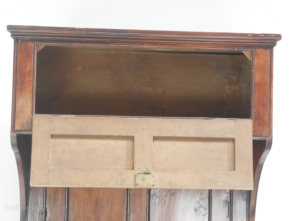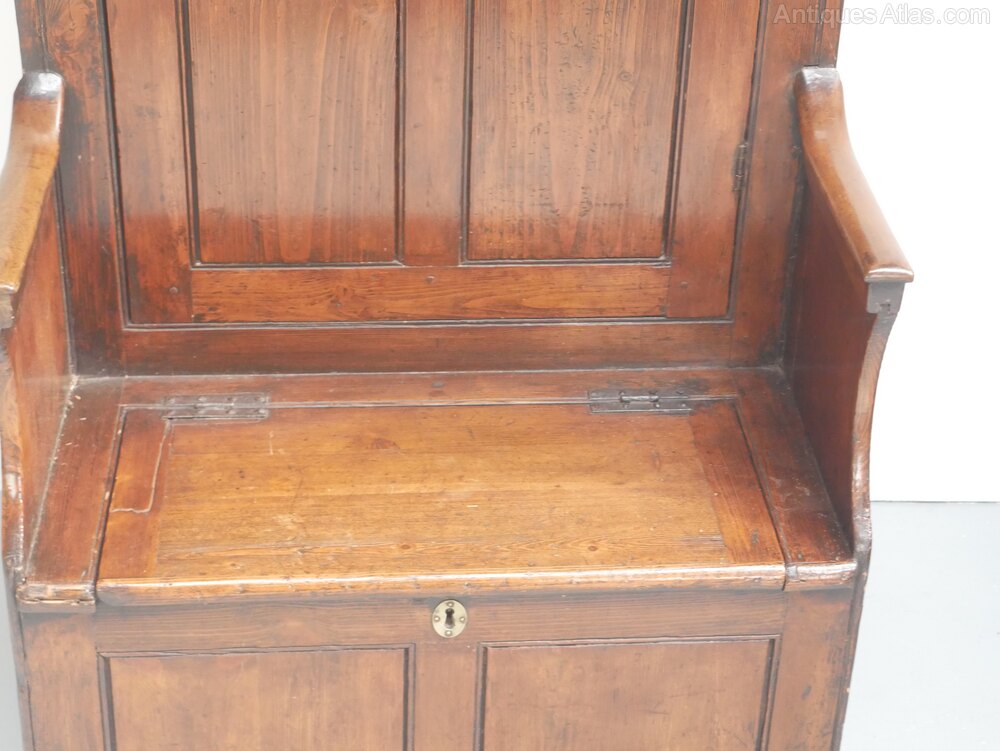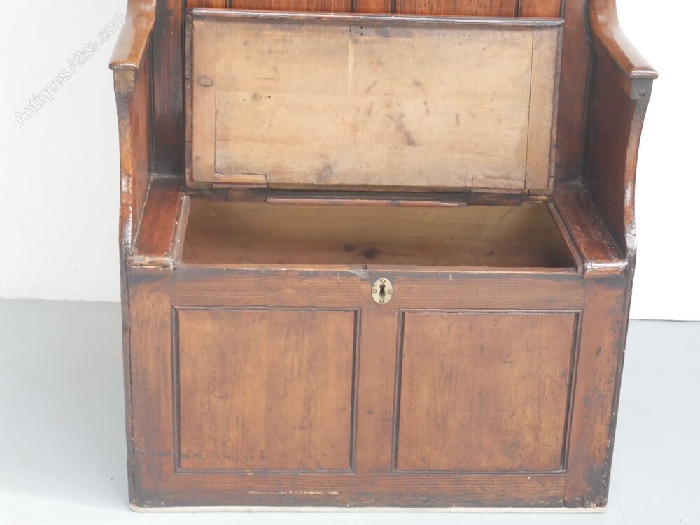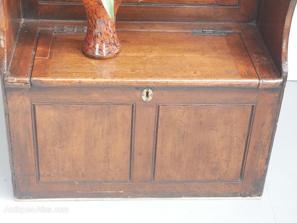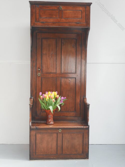 A good rare 18th century pine bacon settle, the seat with a lift off lid, giving useful storage, panelled door above opening to useful pegs, with a storage cupboard above, Made around 1760, some historic treated woodworm to the back, all in strong condition,nice colour and ready to use.