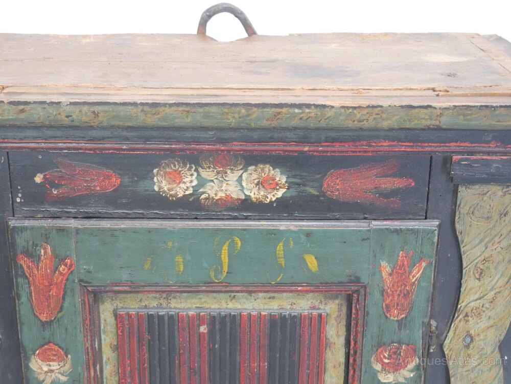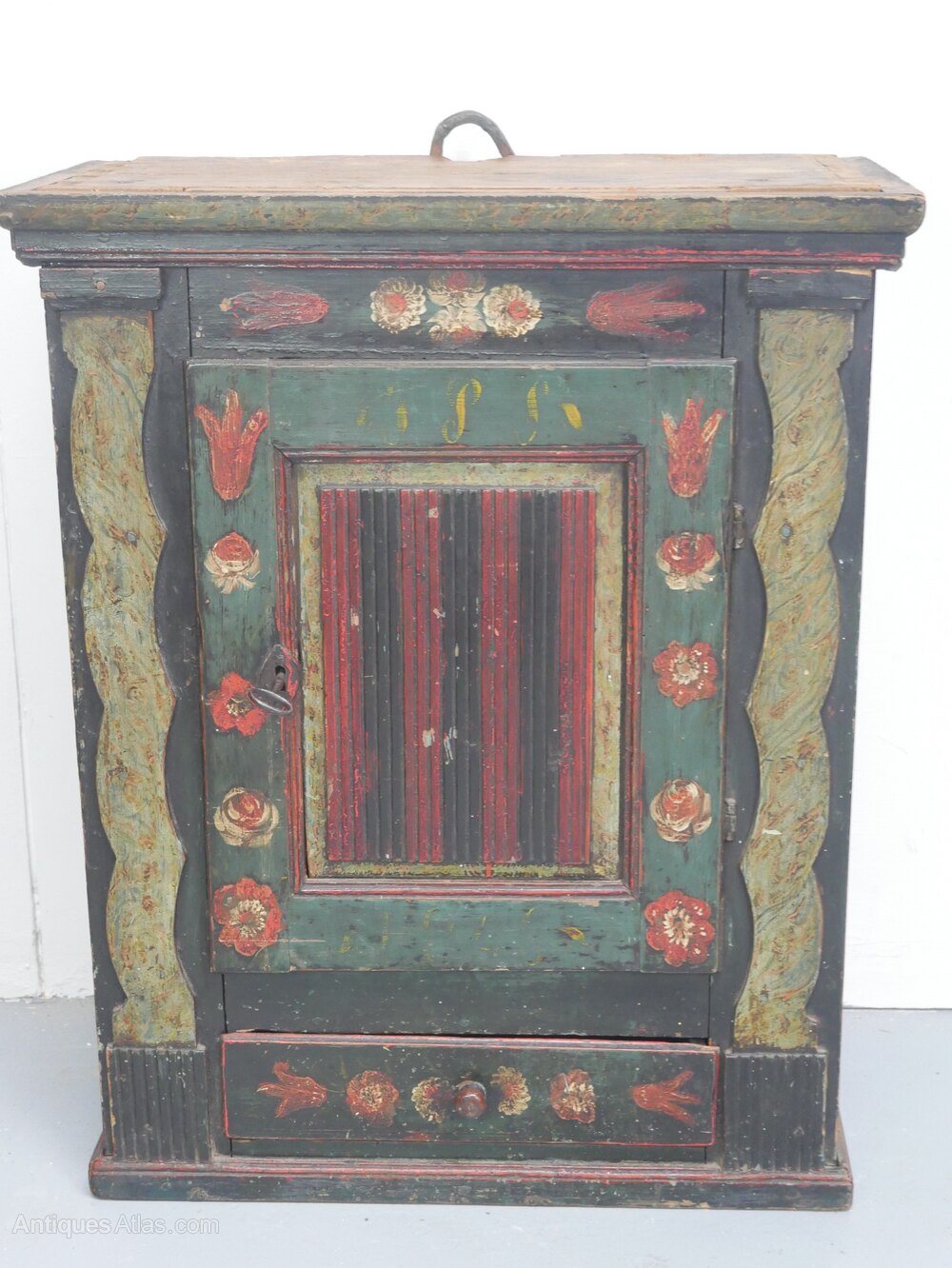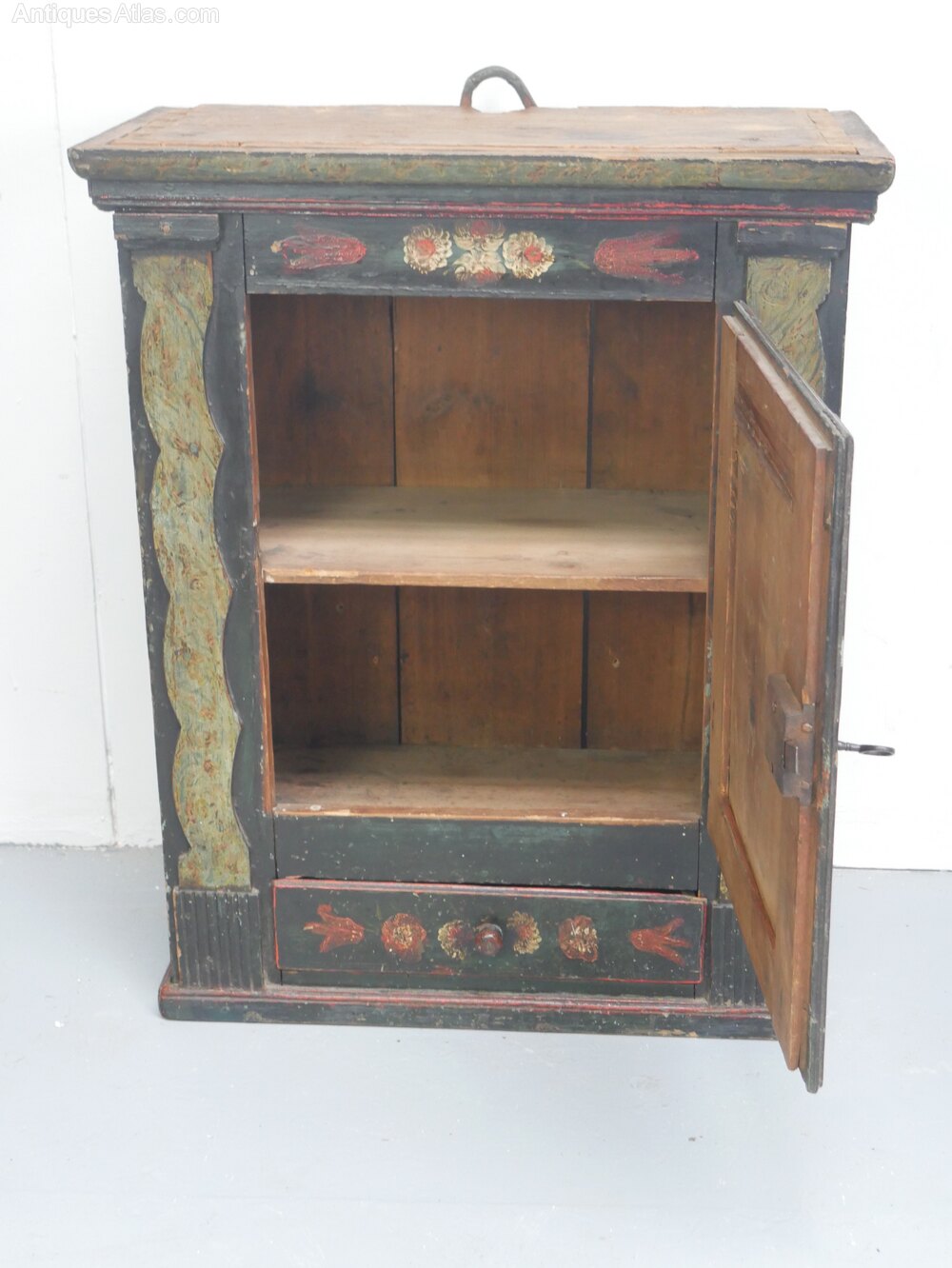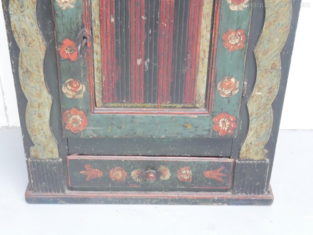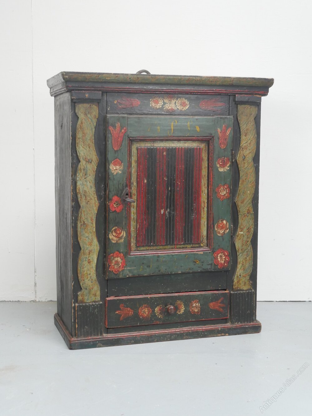 A charming 19th century original painted Swedish wall cupboard, the single door opening to a shelved cupboard with a drawer beneath. A lovely decorative cupboard made around 1846, some treated woodworm, with working key, all ready to enjoy and use.Some extra photos available.