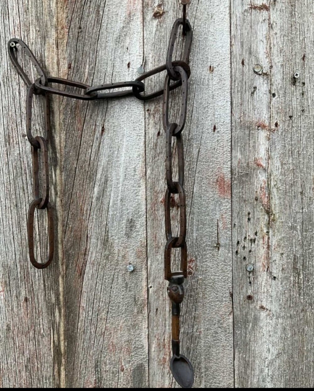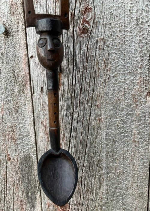 Lovely rare piece of Welsh Folk Art. All made from one piece of wood. You don't often find love spoons on a long chain. I particularly like his cheeky face. Dates around 1880. Mid Wales, Powys area. Perfect condition. Measures 46.5" long. They look fabulous on a wall as a decorative story of love and history.Price includes free delivery on UK mainland, overseas shipping can easily be arranged
