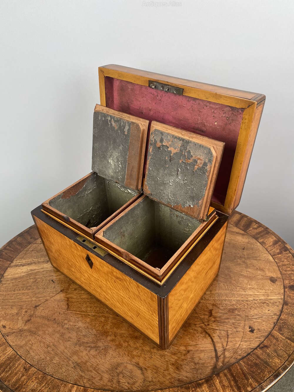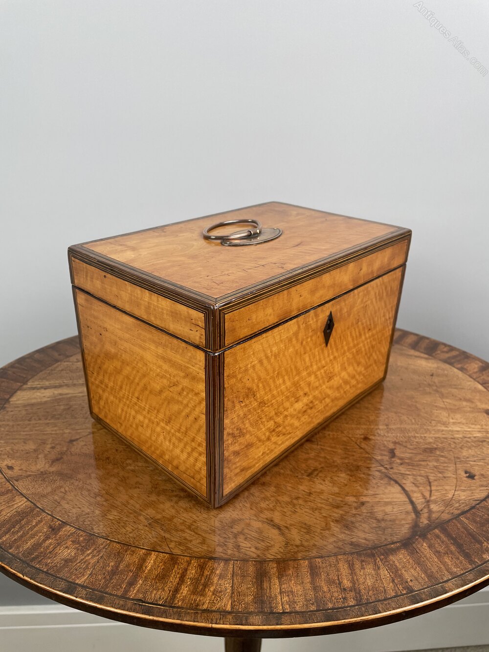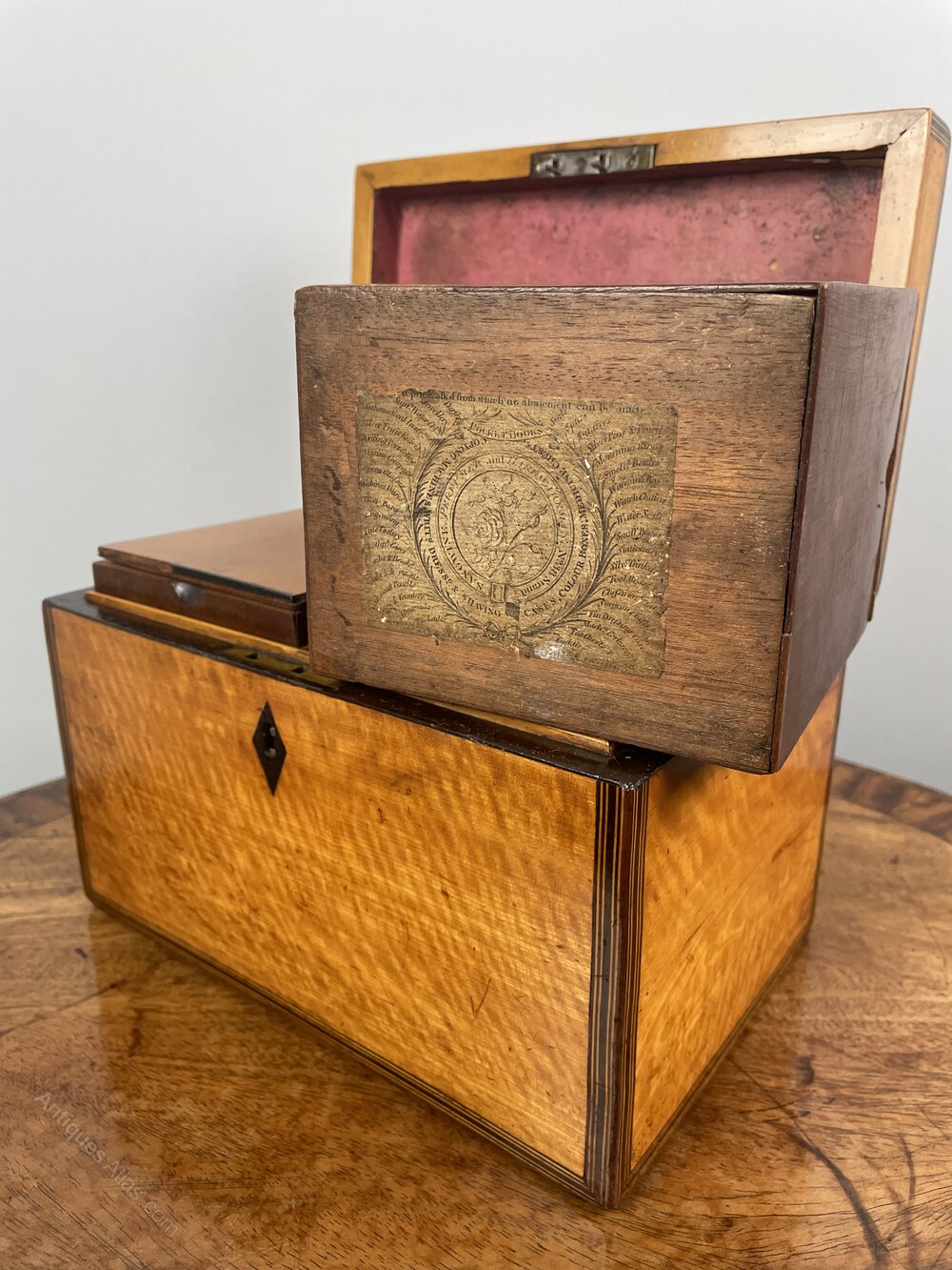 George III satinwood tea chest with trade labels for manufacture and retailer Sangwine, Perfumer and Hardwareman No38 Strand London.English, circa 1810