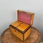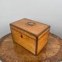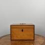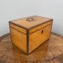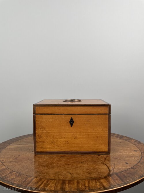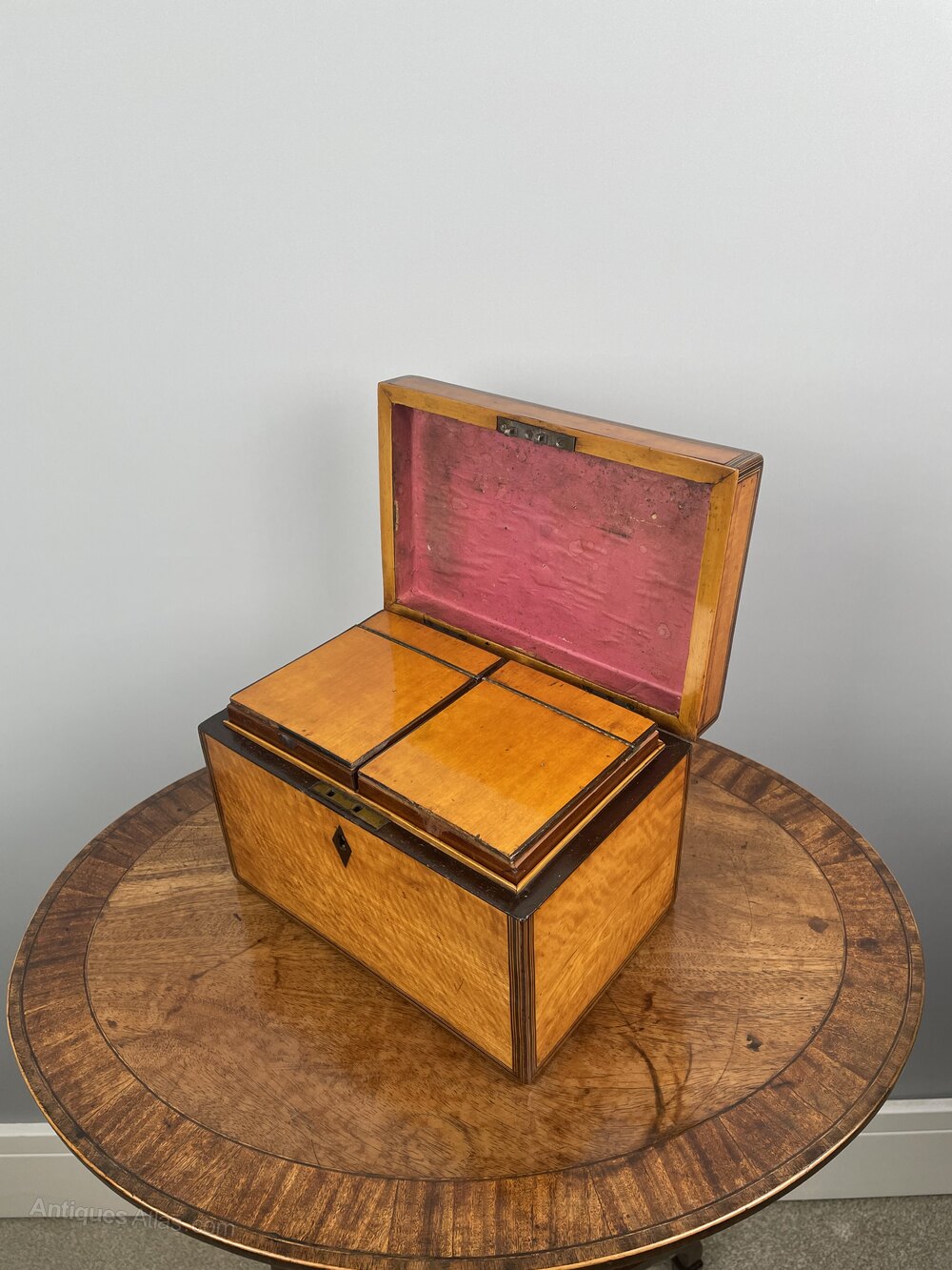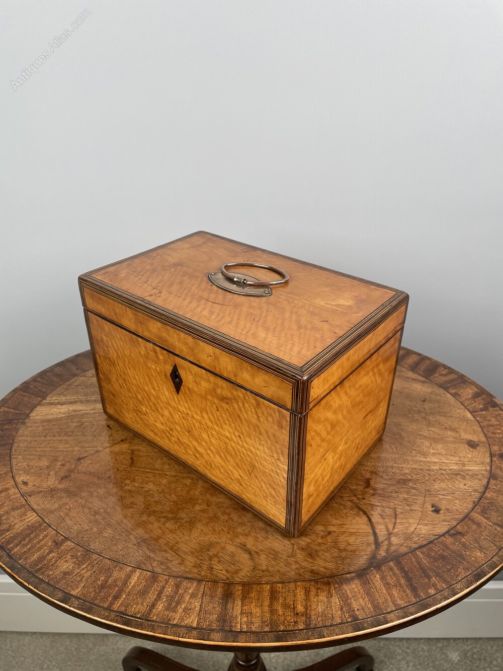 George III satinwood tea chest with trade labels for manufacture and retailer Sangwine, Perfumer and Hardwareman No38 Strand London.English, circa 1810