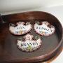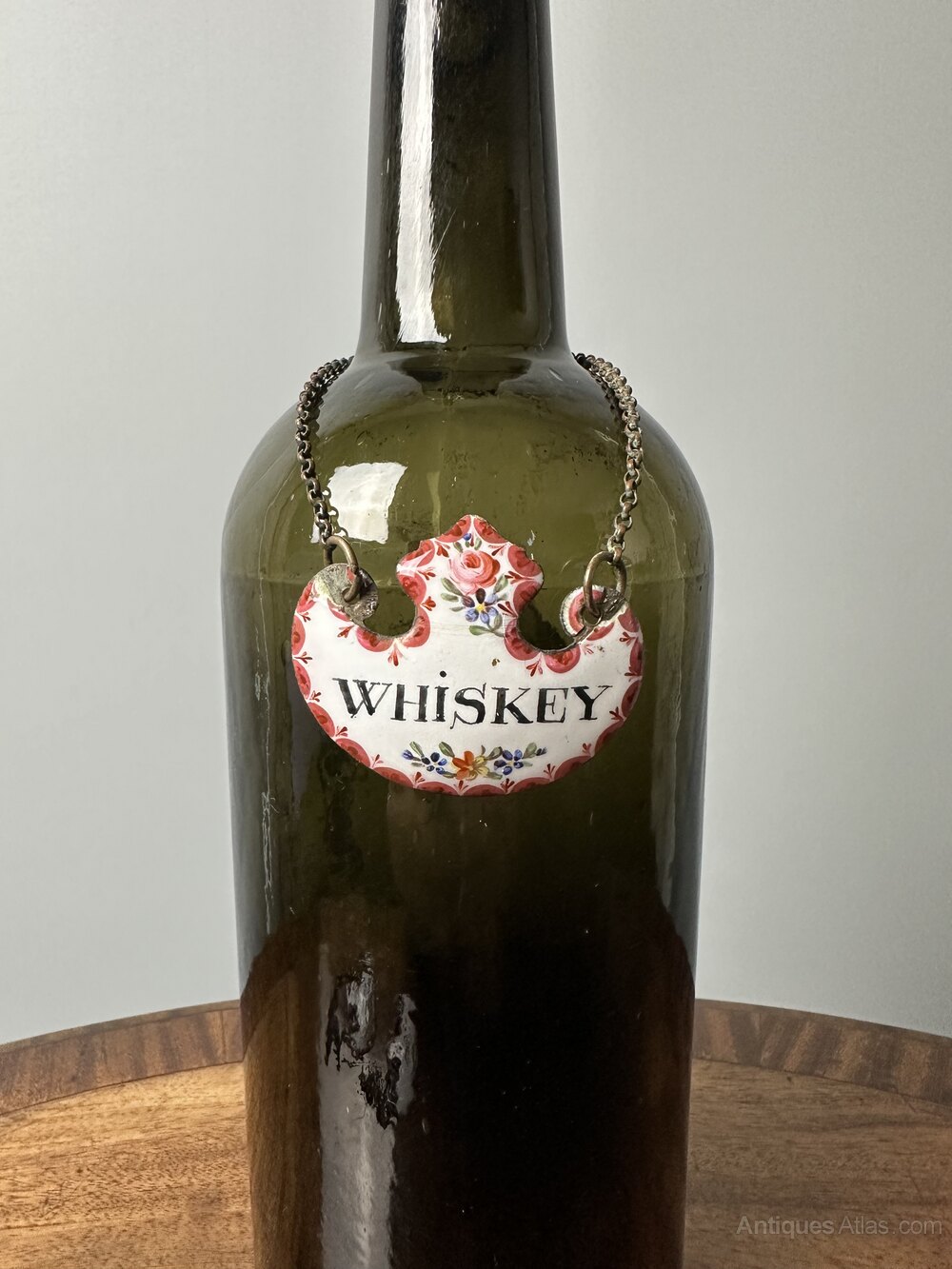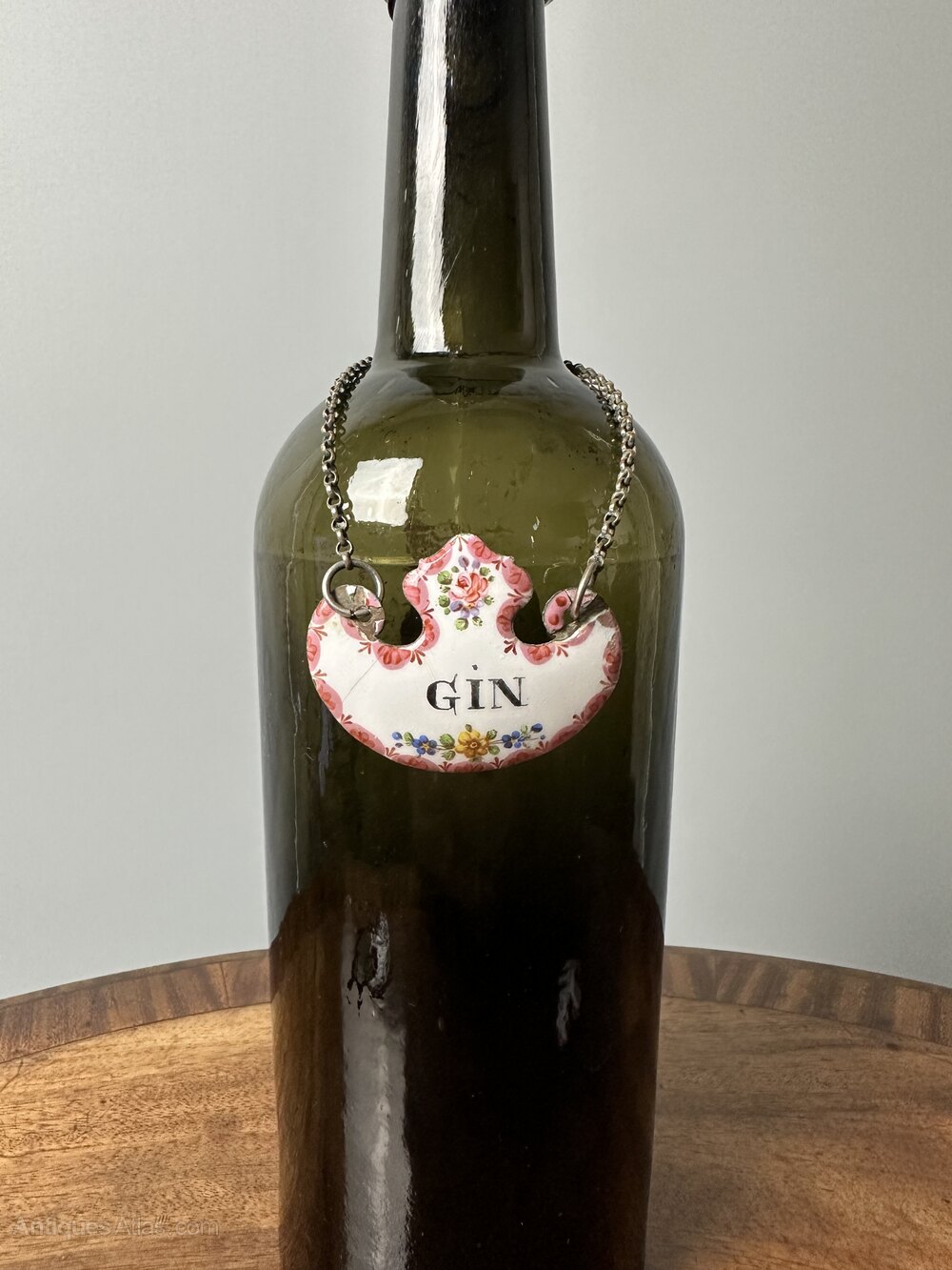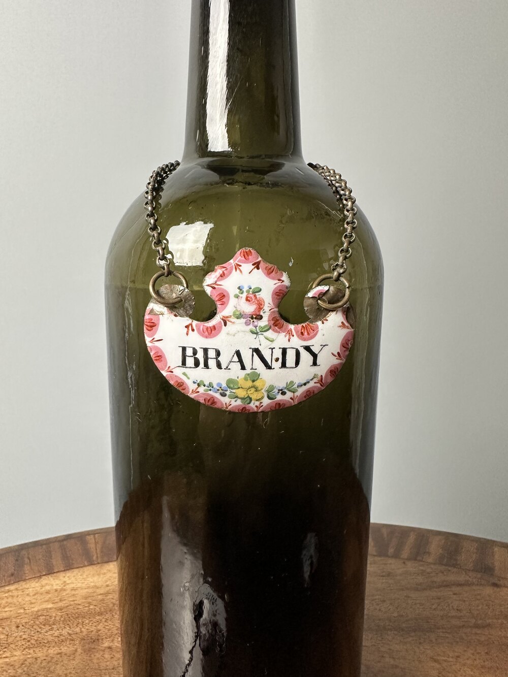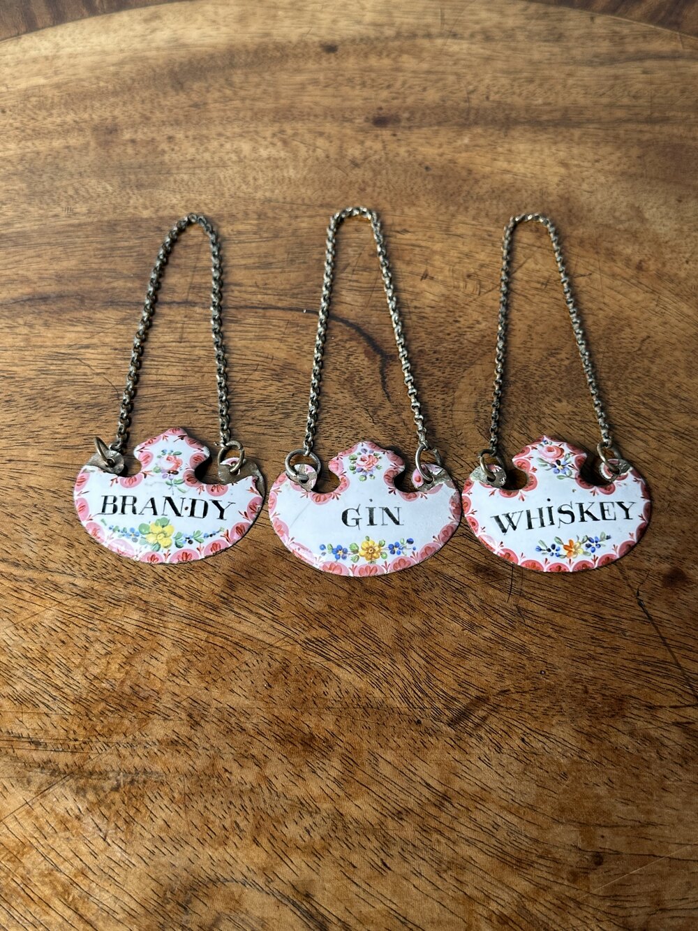 Set of three Staffordshire enamel decanter labels for Gin, Brandy and Whiskey.English, circa 1800