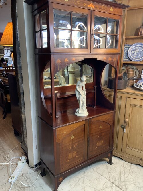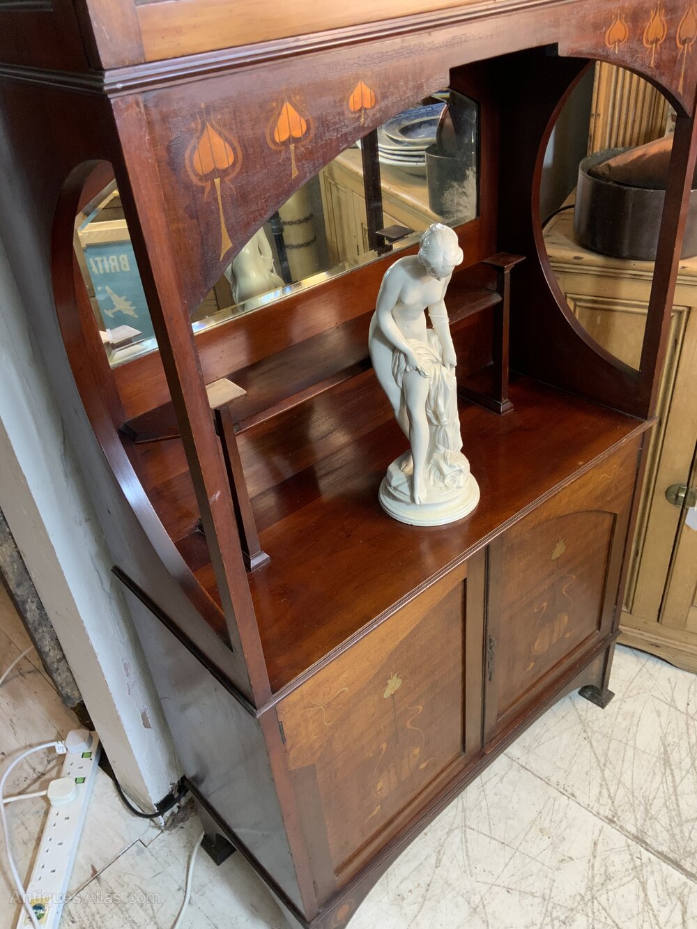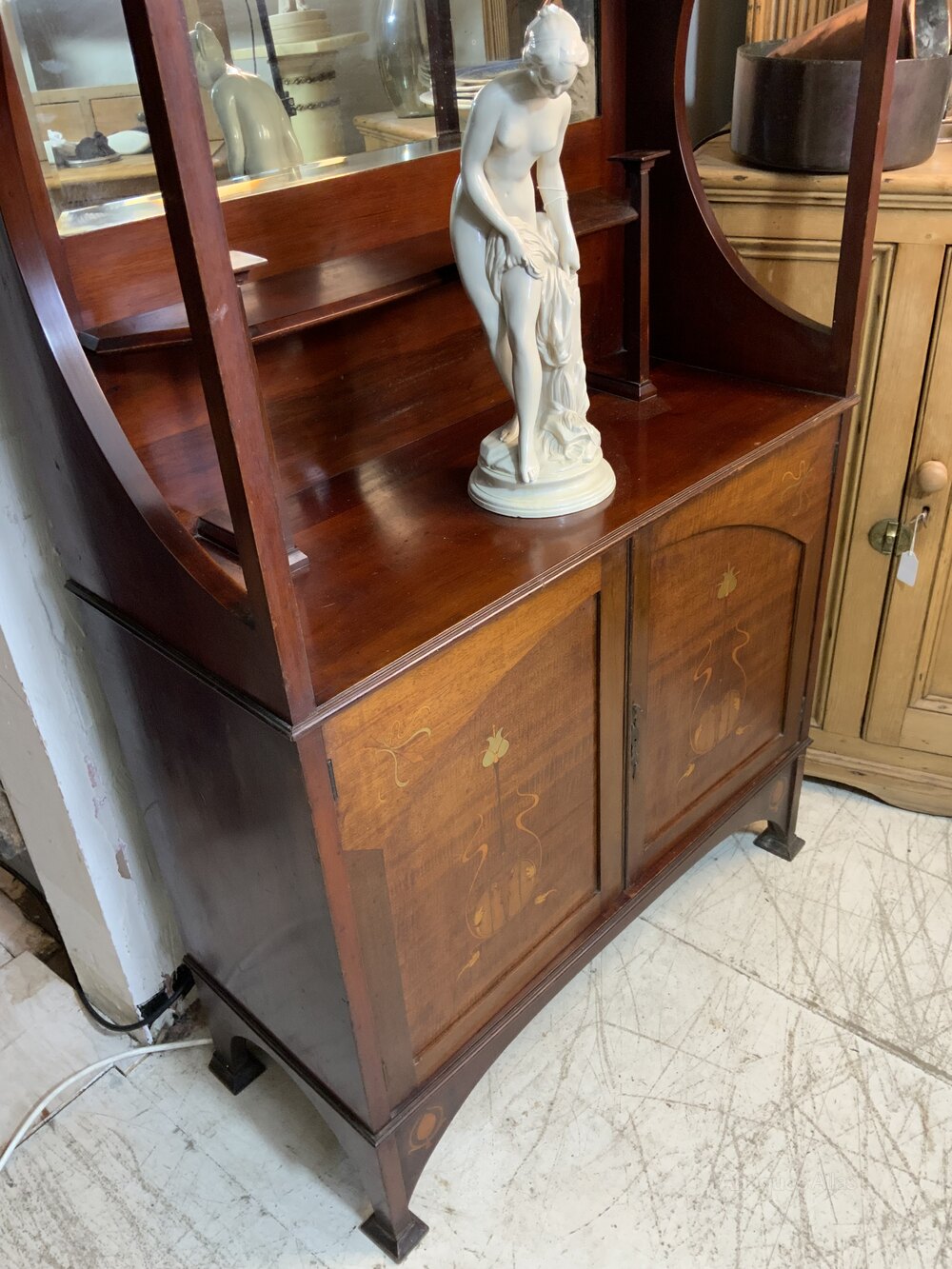 The open display shelf has arched inlay with flowers and bevelled mirror to the back.