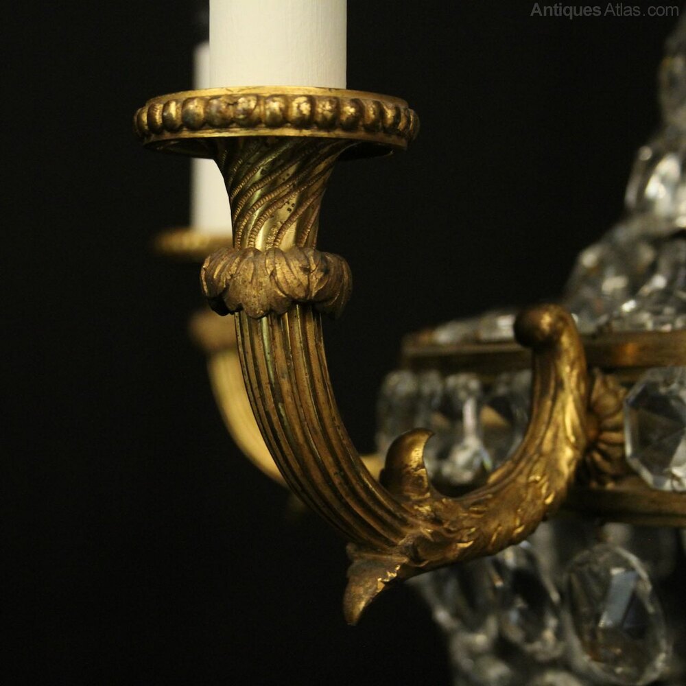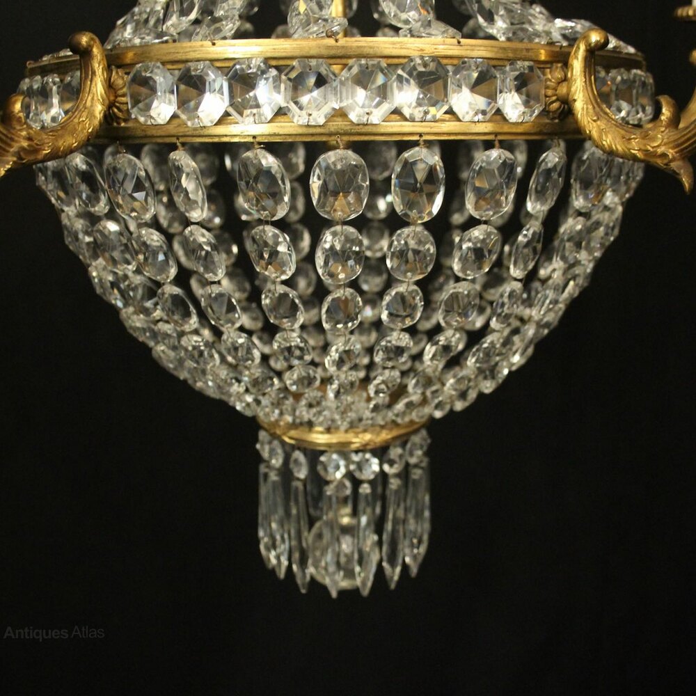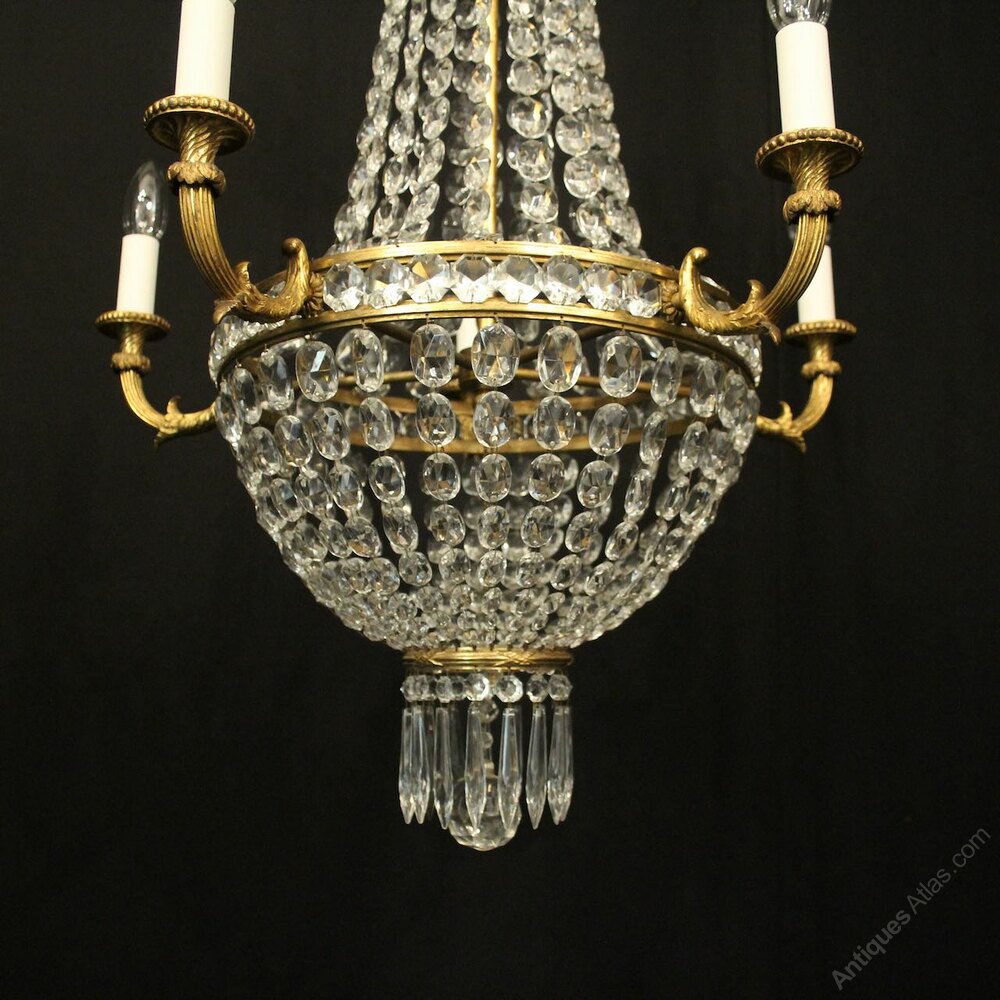 A lovely French gilded bronze and crystal 5 light tent & waterfall antique chandelier, the five reeded tapering scrolling arms with trumpet millgrain bobeche drip pans, issuing from a crystal central band and scrolling wirework canopy, decorated overall with graduated swaged crystal faceted pendants and having the original chain and ceiling rose, lovely quality gilding and ideal for a stairwell. Fully rewired and PAT tested. All our chandeliers come with bulbs and ceiling fixings.Dimensions: H: 35"/89cm W: 23"/58cm Excluding Chain & Rose