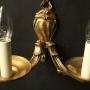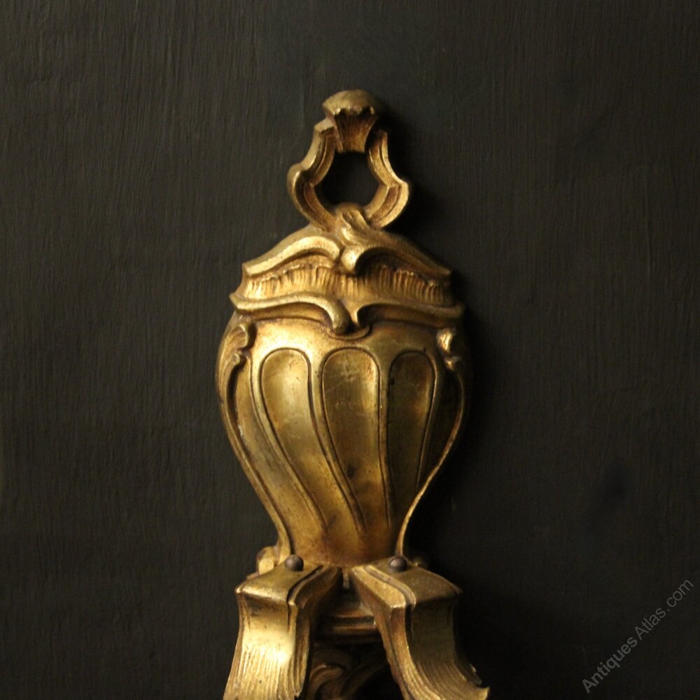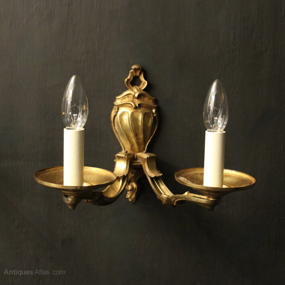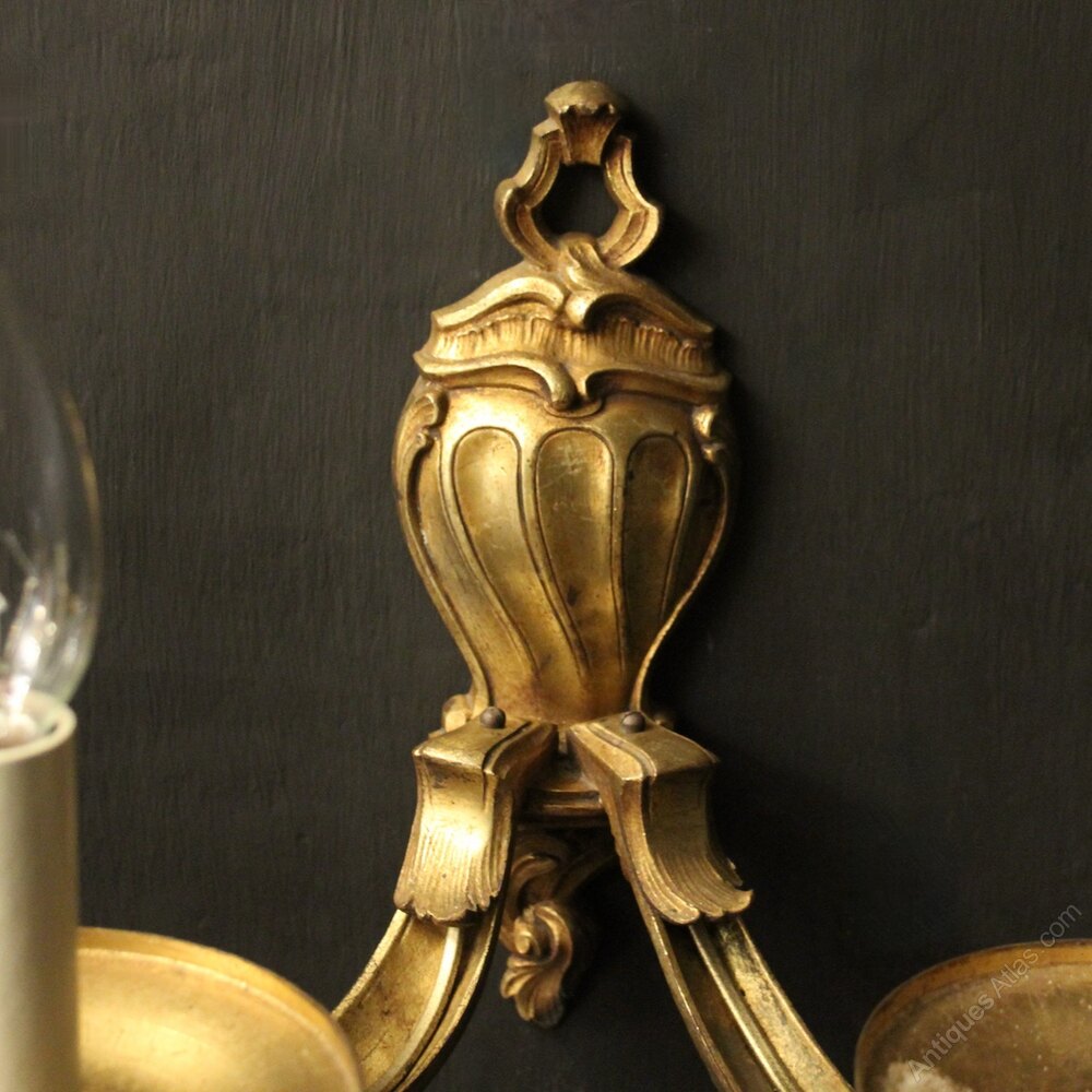 A nice French pair of gilded bronze twin arm antique wall lights, the leaf scrolling arms with circular bobeche drip pans, issuing from an ornate leaf backplate with pierced finial. Lovely original patination. Fully rewired and PAT tested. All our wall lights come with aged brass screws for fixing and spare bulbs.Dimensions: H: 9"/23cm W: 12"/31cm D: 9"/23cm