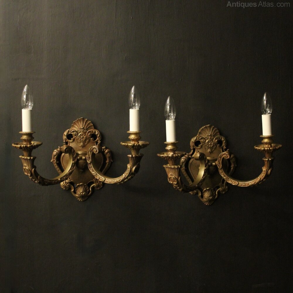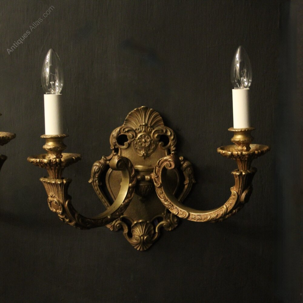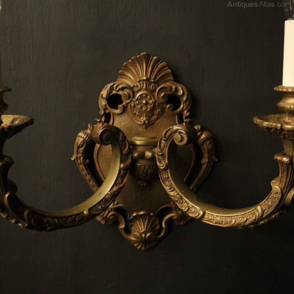 A large French pair of gilded bronze twin arm antique wall lights, the leaf square gauge tapering scrolling arms with circular leaf bobeche drip pans and bulbous candle sconces, issuing from an ornate pierced cartouche backplate with scallop shell finial. Fully rewired and PAT tested. All our wall lights come with aged brass screws for fixing and spare bulbs.Dimensions: H: 14"/36cm W: 15"/38cm D: 7"/18cm