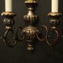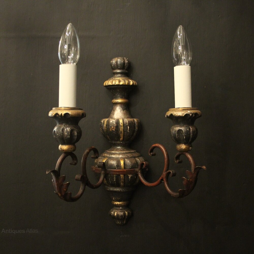 An Italian Florentine set of 4 carved silvered giltwood and Toleware twin arm antique wall lights, the toleware leaf scrolling arms with wooden reeded bulbous candle sconces, issuing from a bulbous knopped dark silvered gilded wooden backplate, very decorative with original faded gilded patination. Fully rewired and PAT tested. All our wall lights come with aged brass screws or brackets for fixing and spare bulbs.Dimensions: H: 16"/41cm W: 10"/25cm D: 7"/18cm