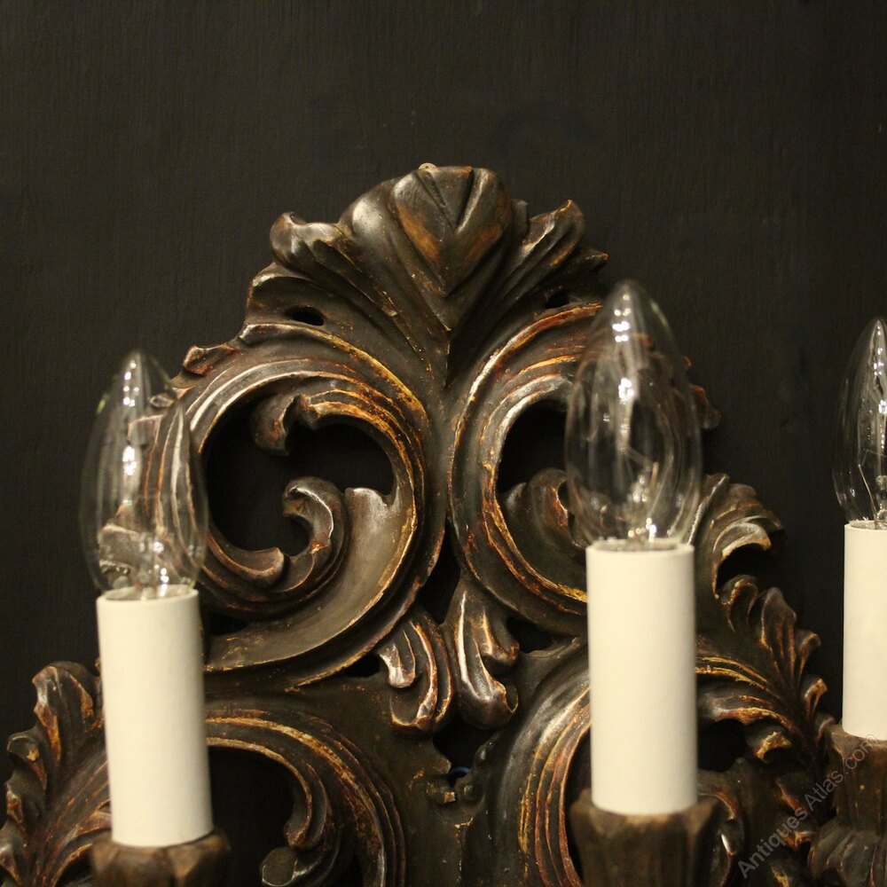 An Italian Florentine carved dark silvered giltwood and Toleware triple arm antique wall lights, the foliated toleware leaf scrolling arms with wooden reeded bulbous candle sconces, issuing from an ornate pierced Acanthus leaf dark silvered gilded wooden backplate, very decorative with original faded gilded patination. Fully rewired and PAT tested. All our wall lights come with aged brass screws or brackets for fixing and spare bulbs.Dimensions: H: 18"/46cm W: 13"/33cm D: 8"/20cm