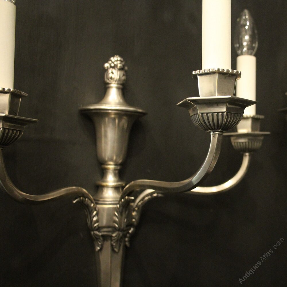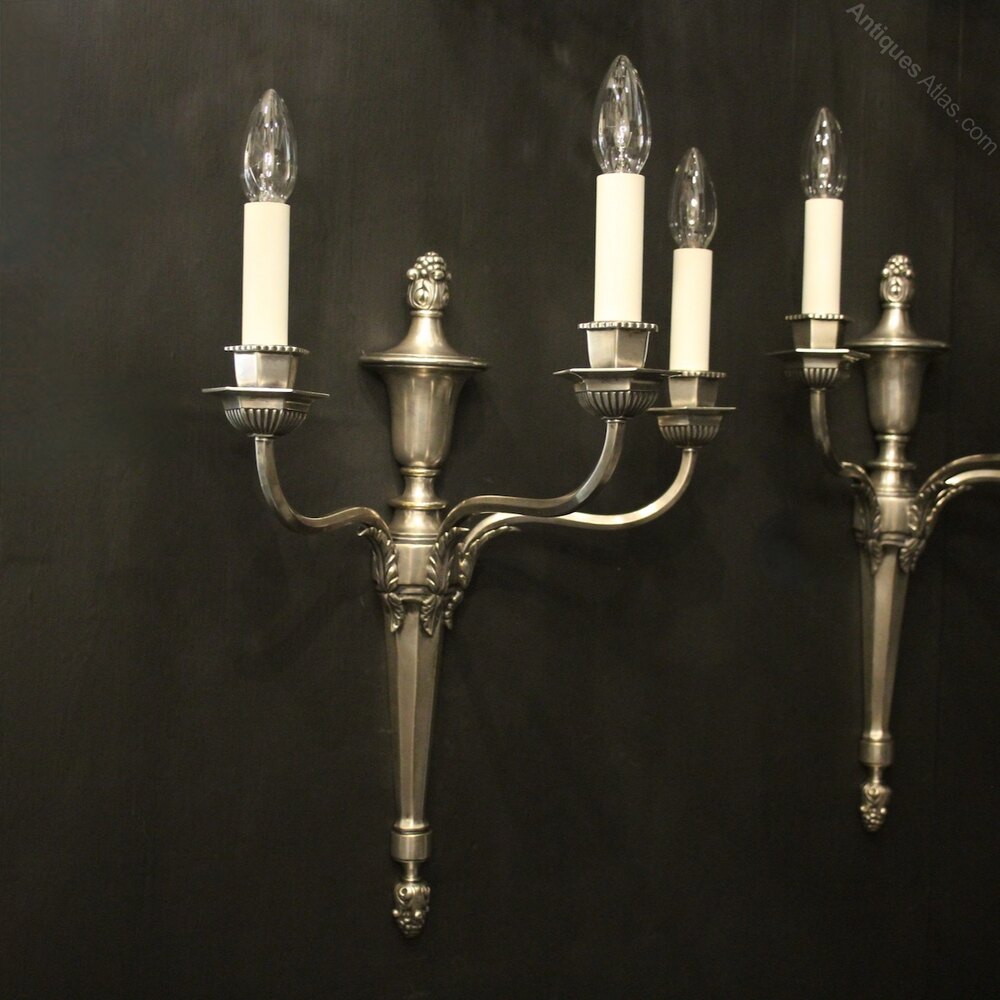 A nice quality English pair of silver gilded brass triple arm antique wall lights, the scalloped scrolling arms with hexagonal bobeche drip pans and candle sconces, issuing from a tapering backplate with urn top and leaf berried final, nice original silver gilded patination and great large scale. Fully rewired and PAT tested. All our wall lights come with aged brass screws for fixing and spare bulbs.Dimensions: H: 23"/58cm W: 16"/41cm D: 11"/28cm