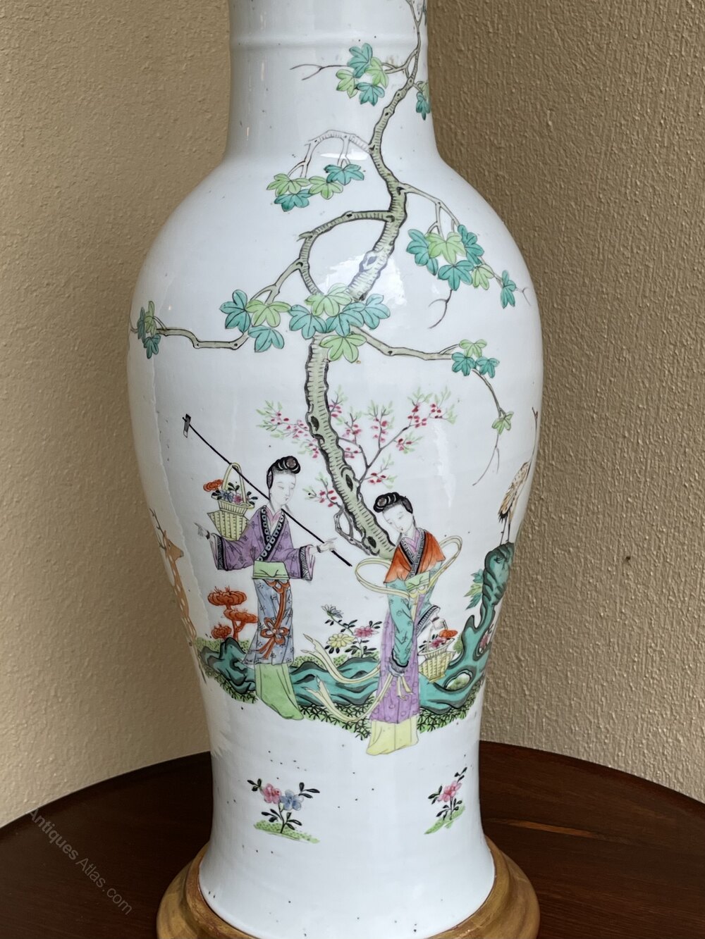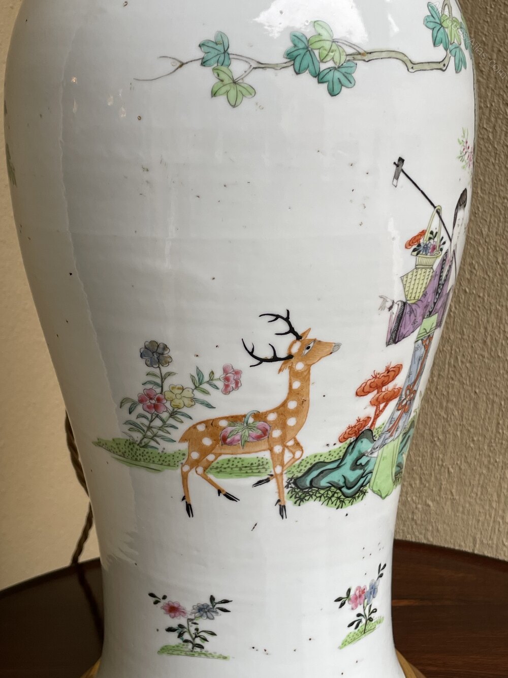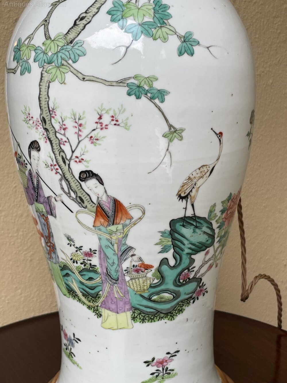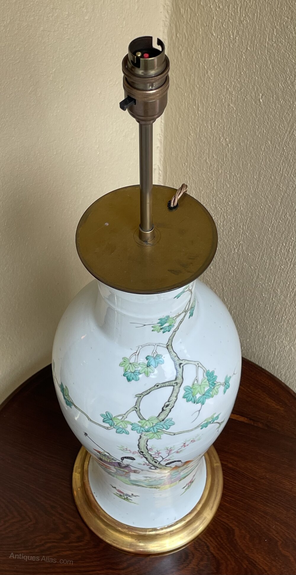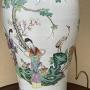 Large Chinese famille rose porcelain landscape vase from the early 20th century having been converted into an impressive table lamp. The vase has not been drilled so can still be used as vase if so desired.In excellent condition, fully rewired and PAT safety tested.
