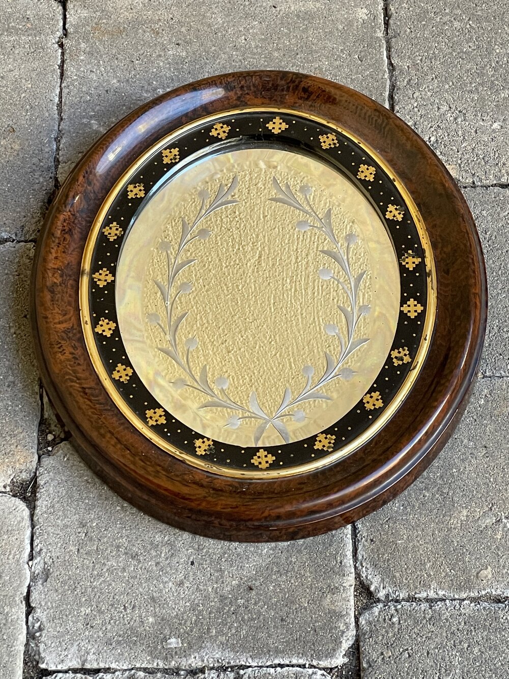 A very pretty Victorian oval wall mirror of small proportions, scumbled frame with gilt and ebonised slip. Very finely painted decoration to the bevelled glass plate.31 x 26 cm