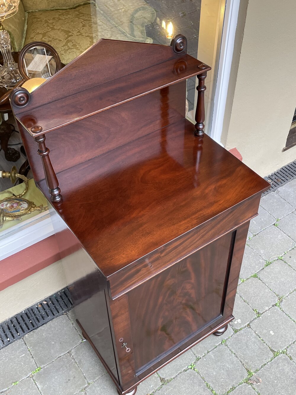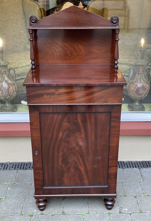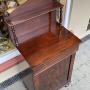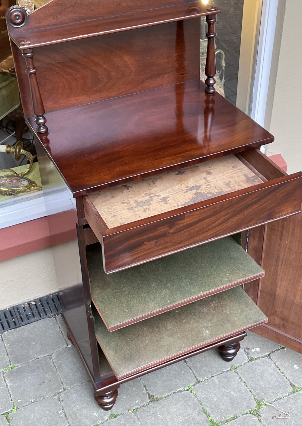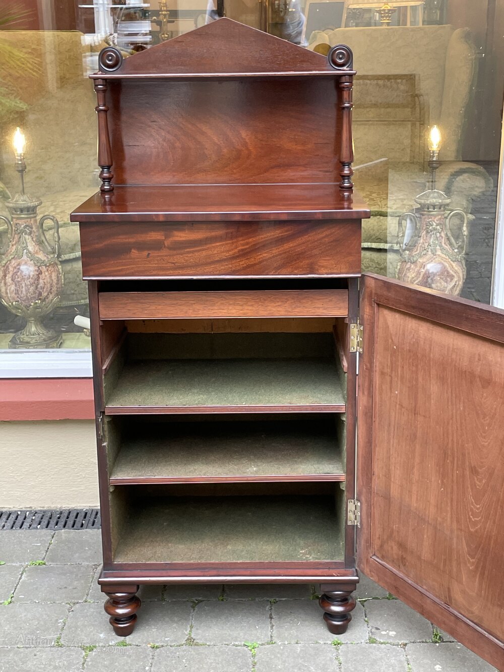 A very pretty and diminutive early Victorian mahogany chiffonier sideboard with single drawer and door, opening to reveal a fitted interior with two pull out slides. Beautifully selected flame mahogany veneers.Circa 1835-40.