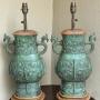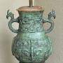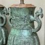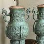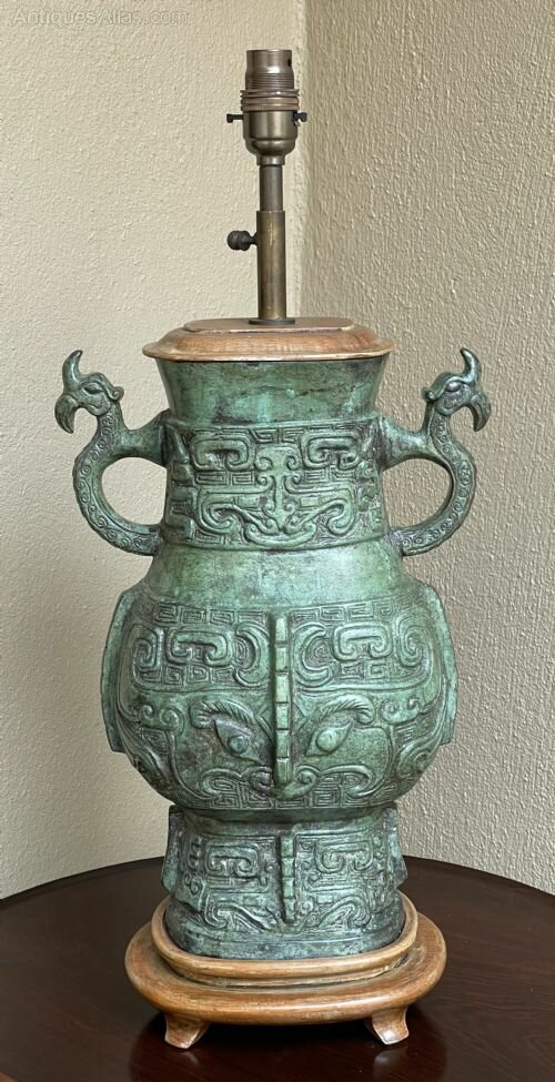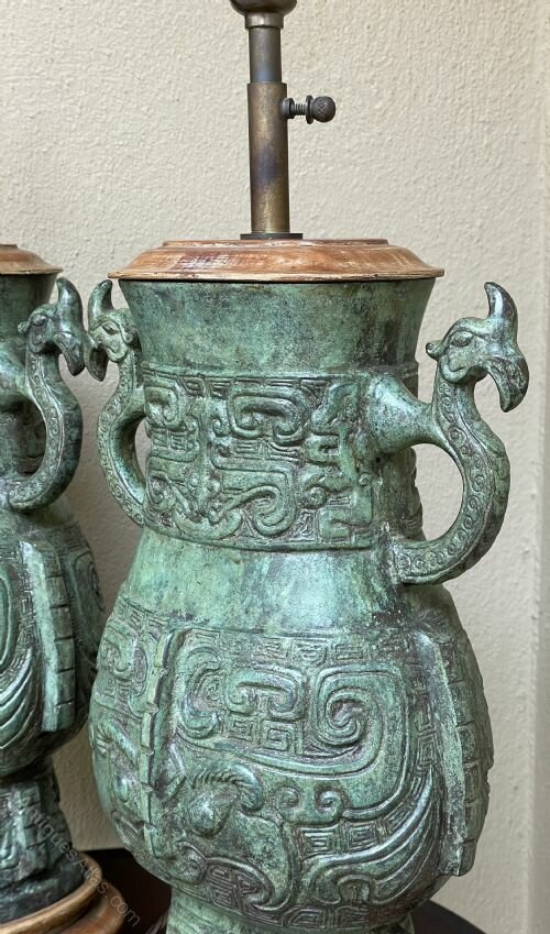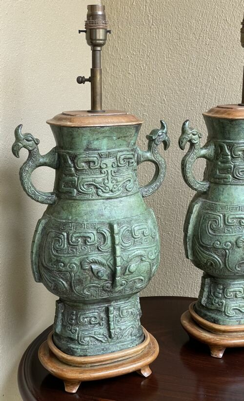 A good decorative pair of Chinese archaic style bronze table lamps of baluster form with wooden mounts. Adjustable height bulb holder.Professionally re-wired in period style braided flex and PAT safety tested.