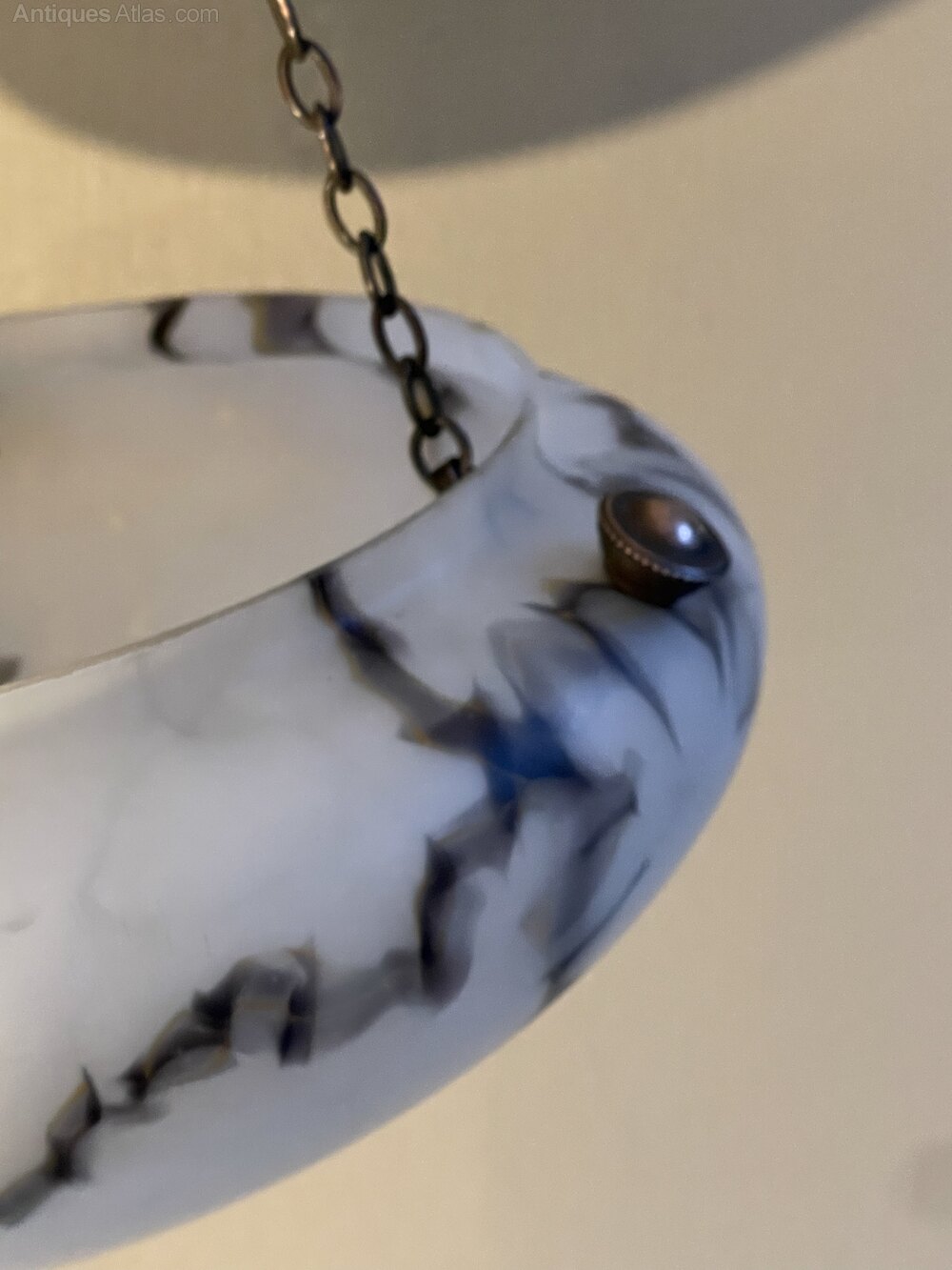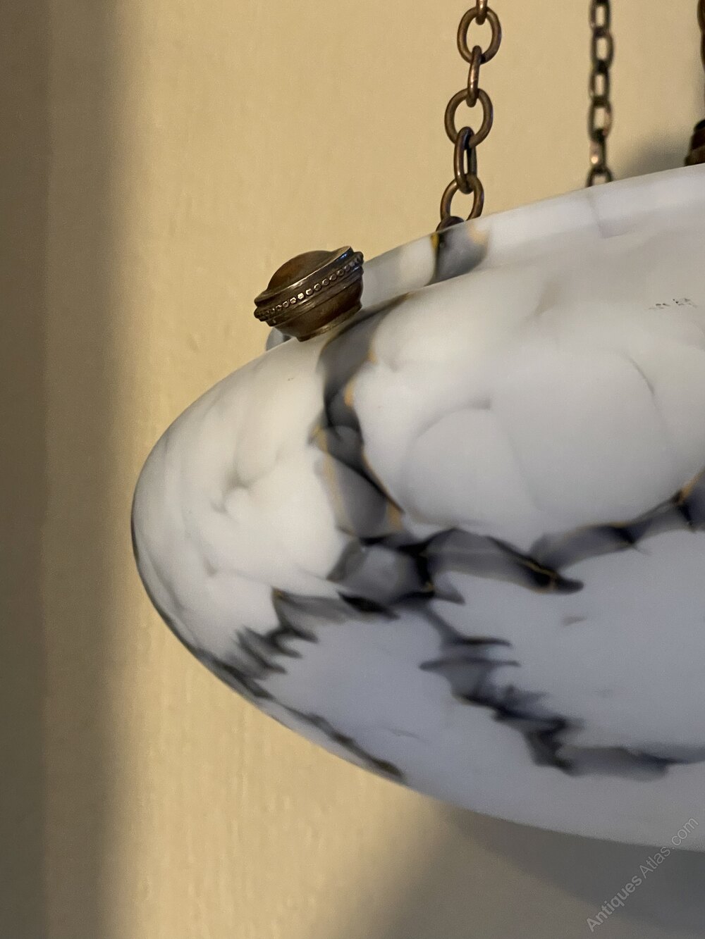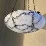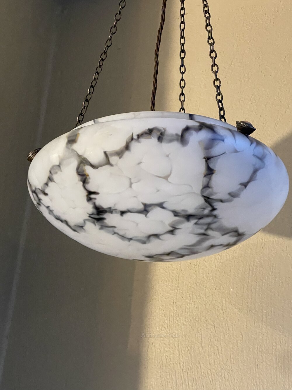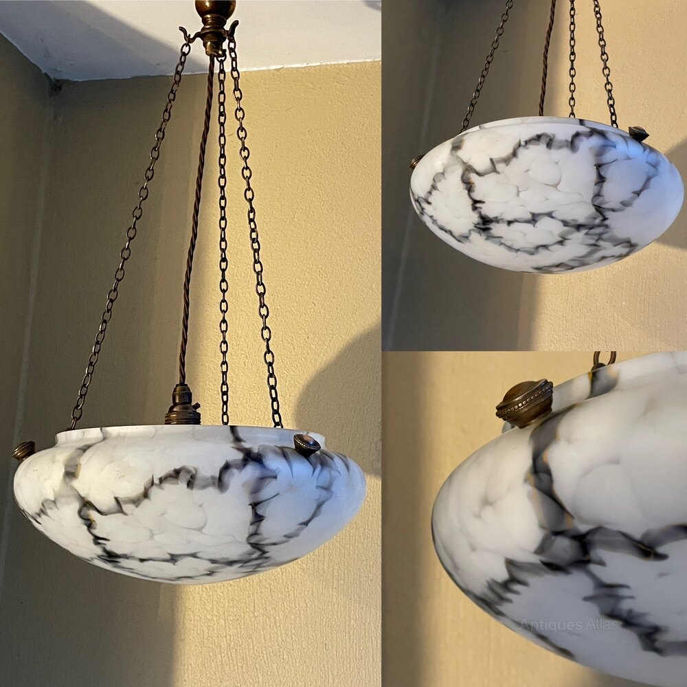 A stunning early 20th century Art Deco period marbled glass ceiling light in unusual black and white tones. This hangs from coppered chains and fittings, all fully rewired in period style flex and PAT safety tested.Although unmarked, probably by Muller Frères.
