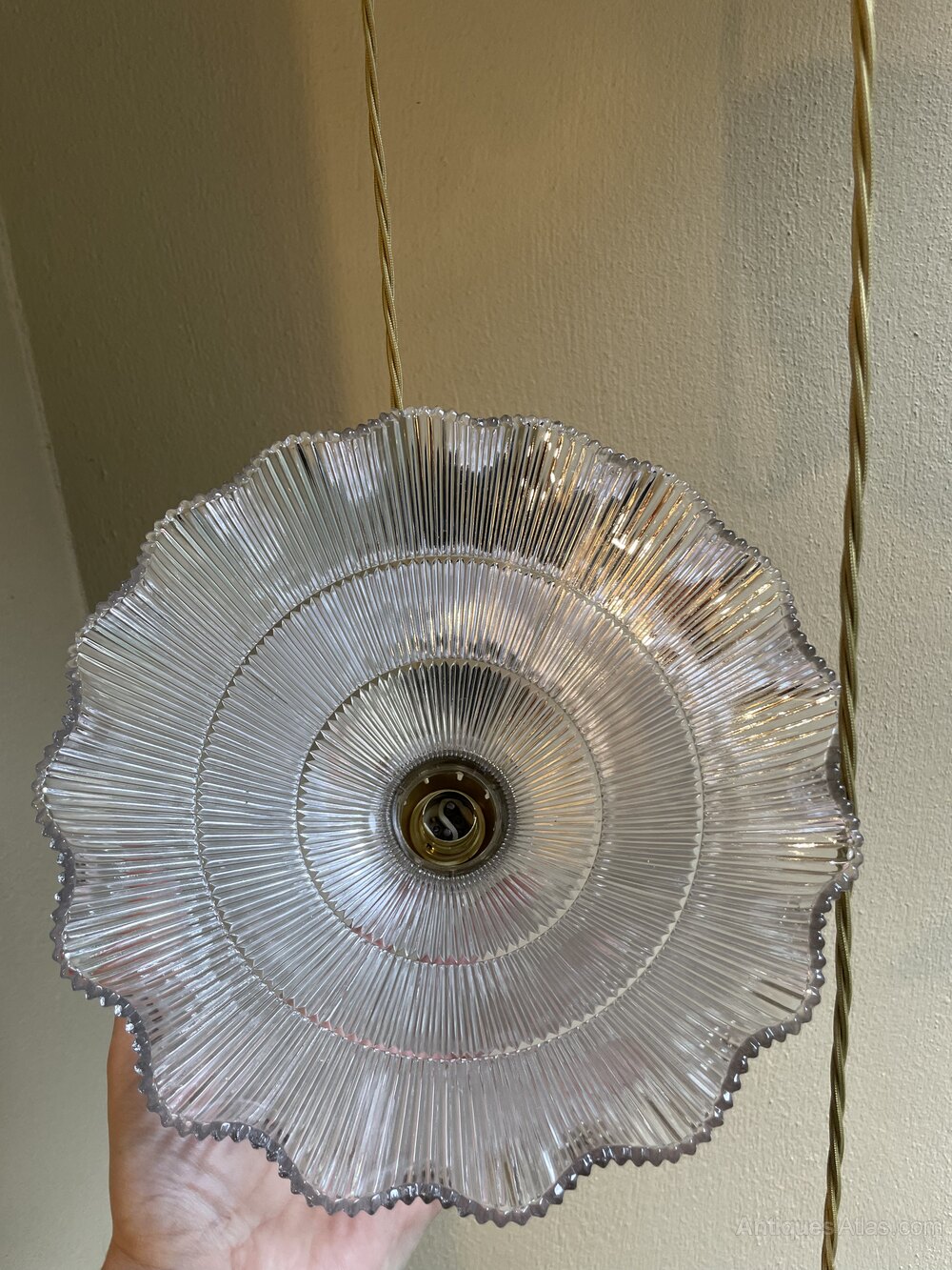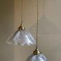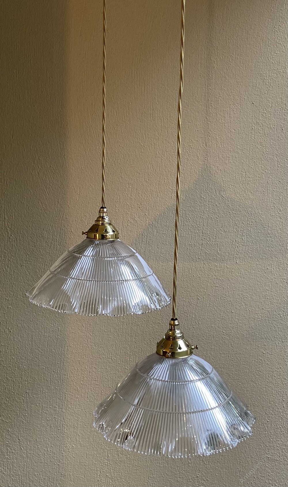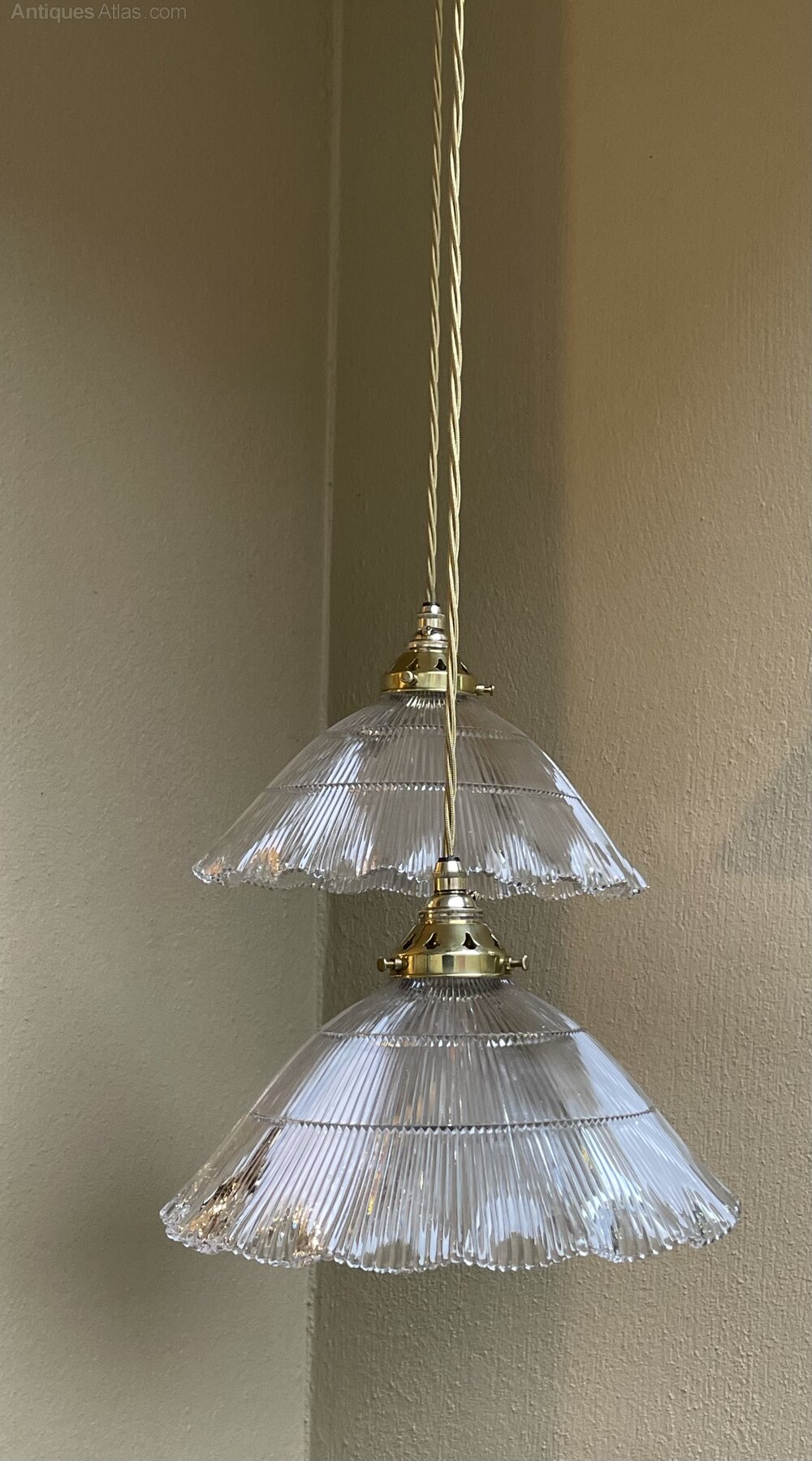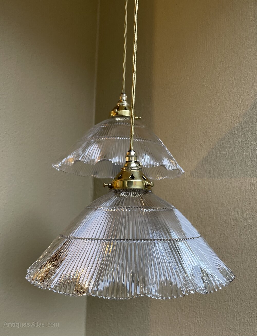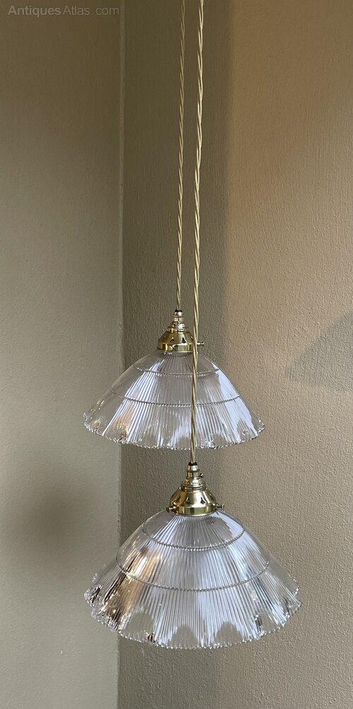 A rare large pair of original Holophane pendant lights each shade with a a diameter of 28 cm. Fully rewired with period style braided flex and PAT safetyIn excellent condition throughout.