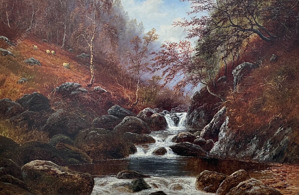 A fantastic large landscape oil painting by William Mellor, British, (1851-1931). Oil on canvas, signed & further inscribed verso. Titled verso ‘Percy Beck Barnard Castle’.A superb example of his work, professionally cleaned and original frame restored to top showroom condition.