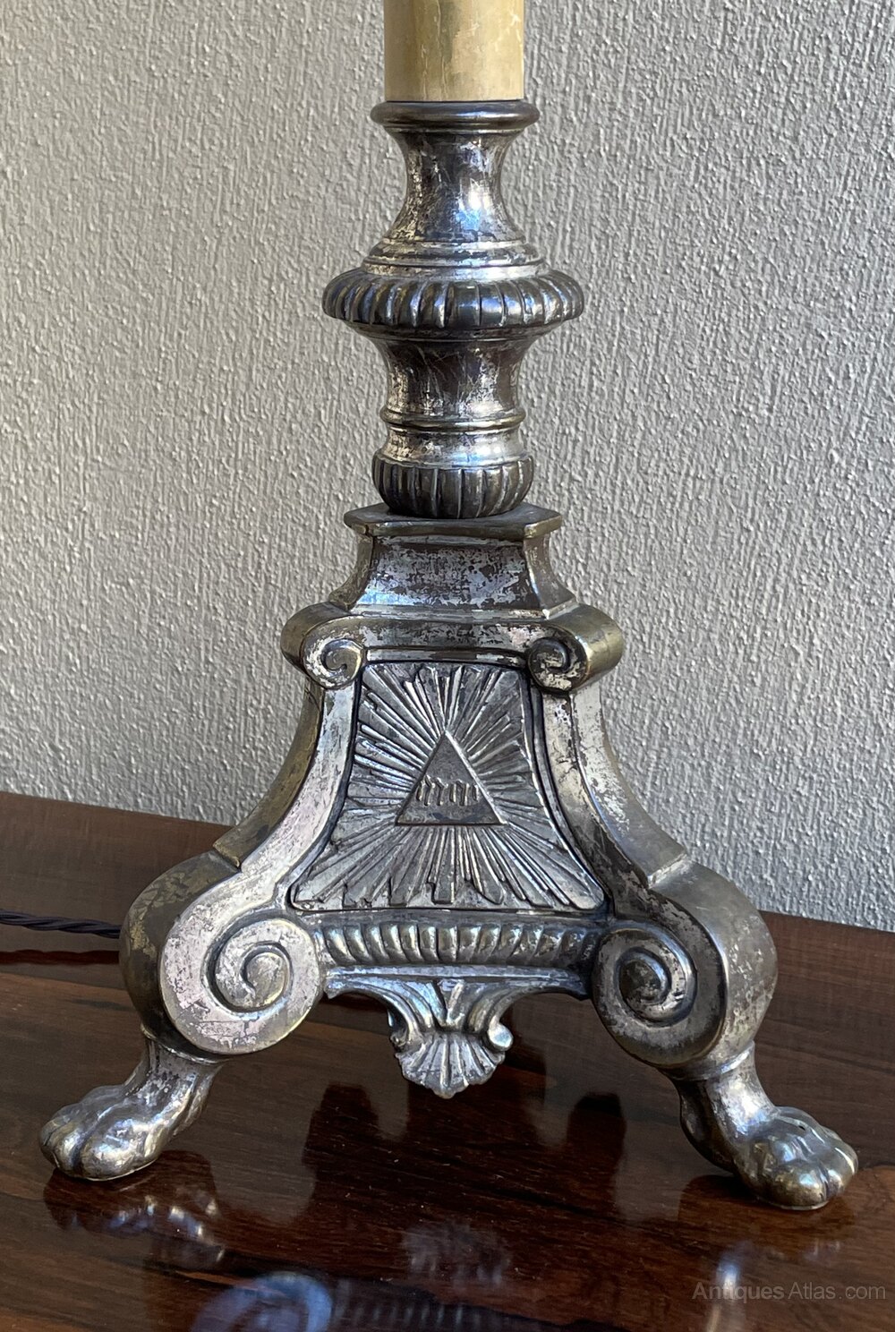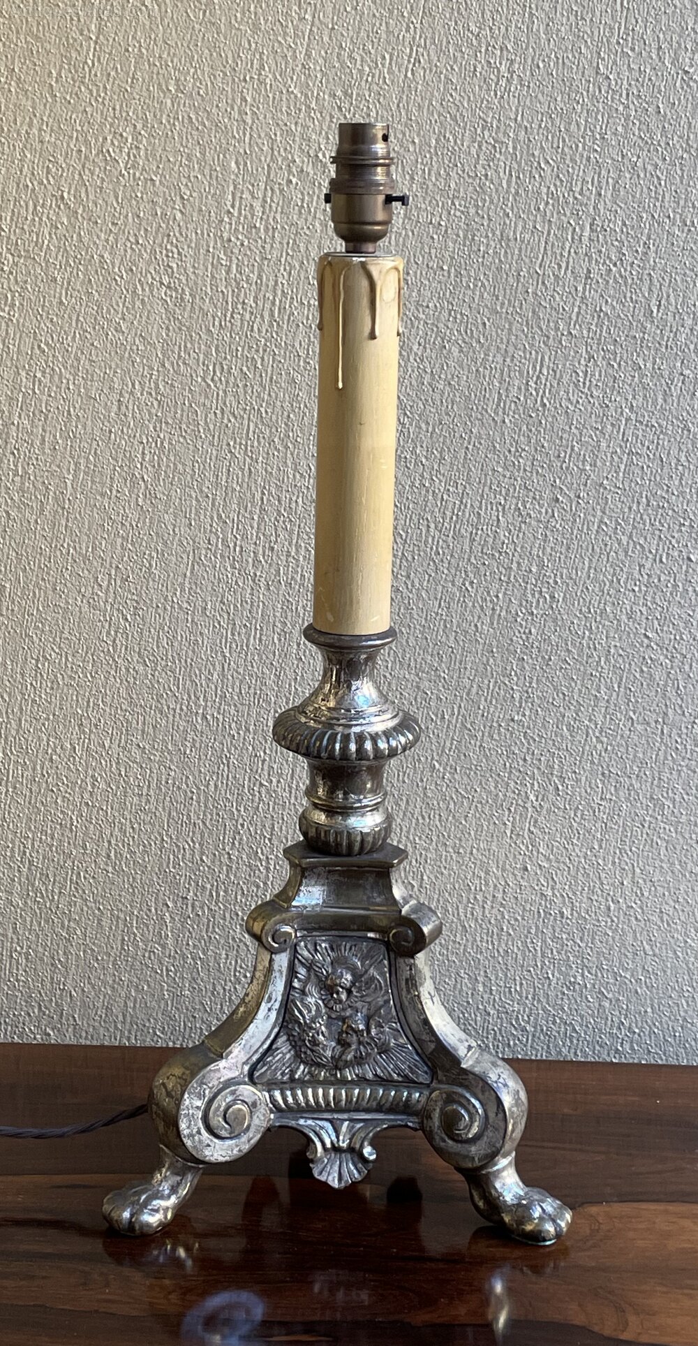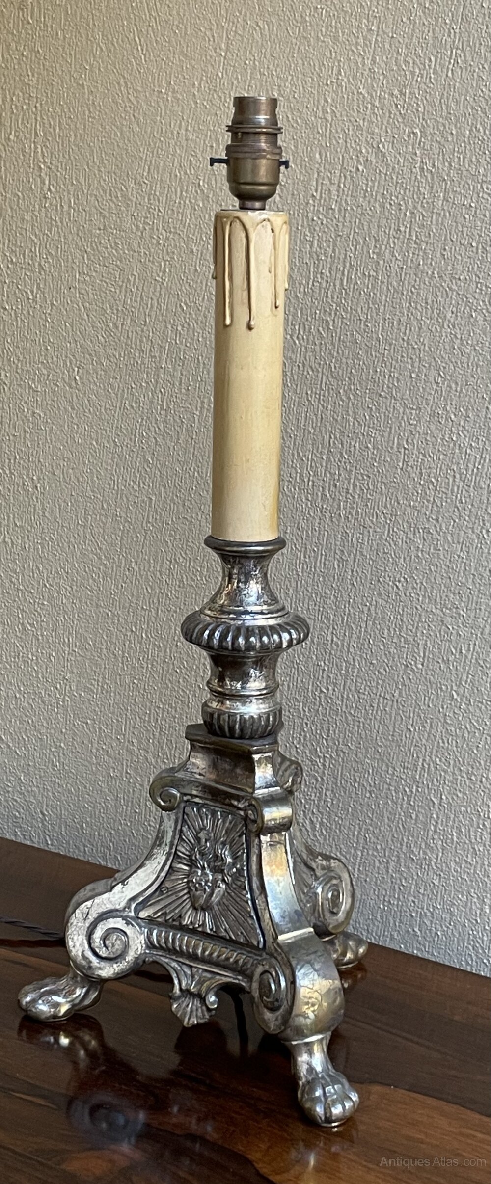 A very decorative late 19th century French silver plated candlestick table lamp, fully rewired in period style braided flex and PAT safety tested.In excellent condition and most pleasing patina to the silver plate.