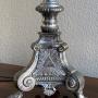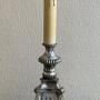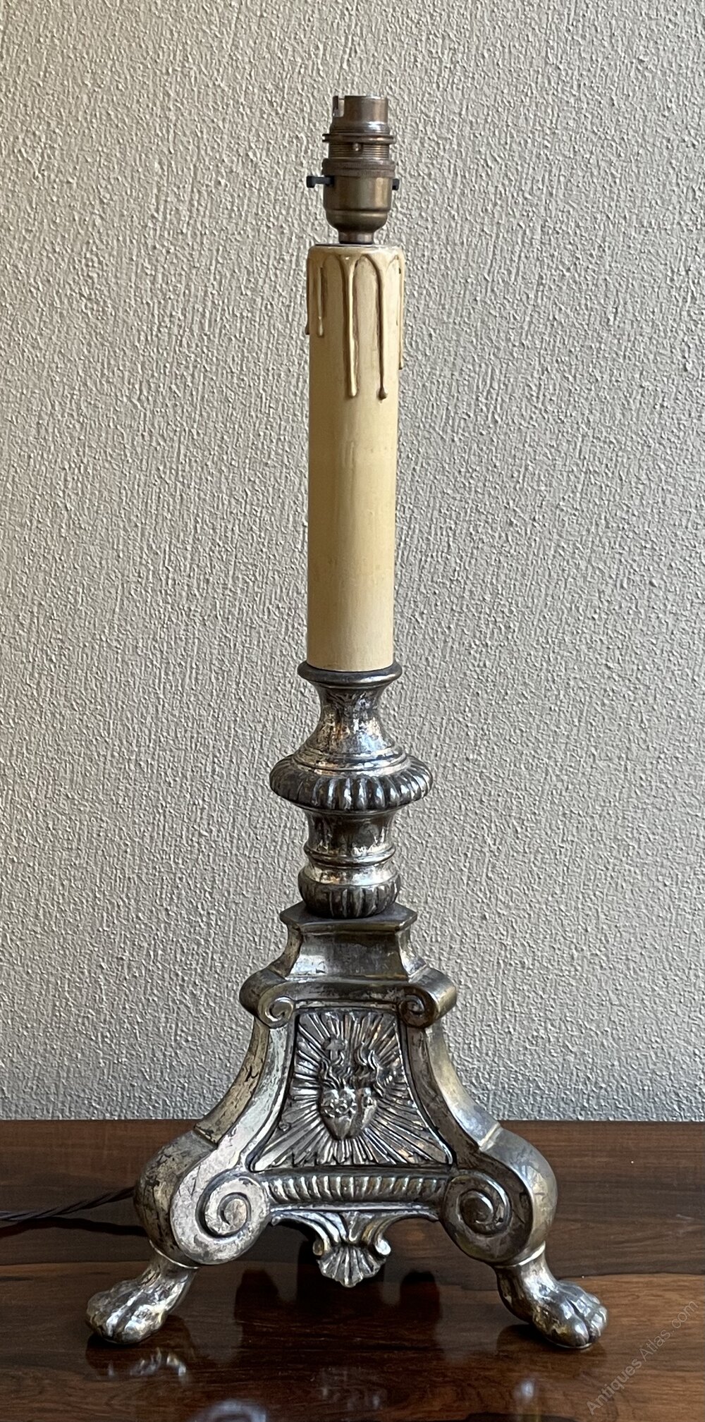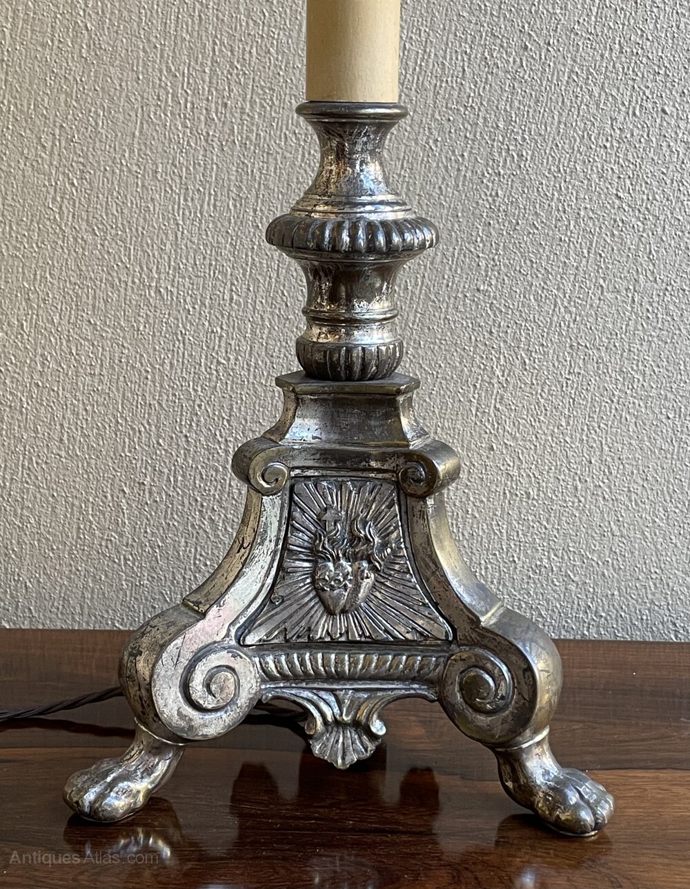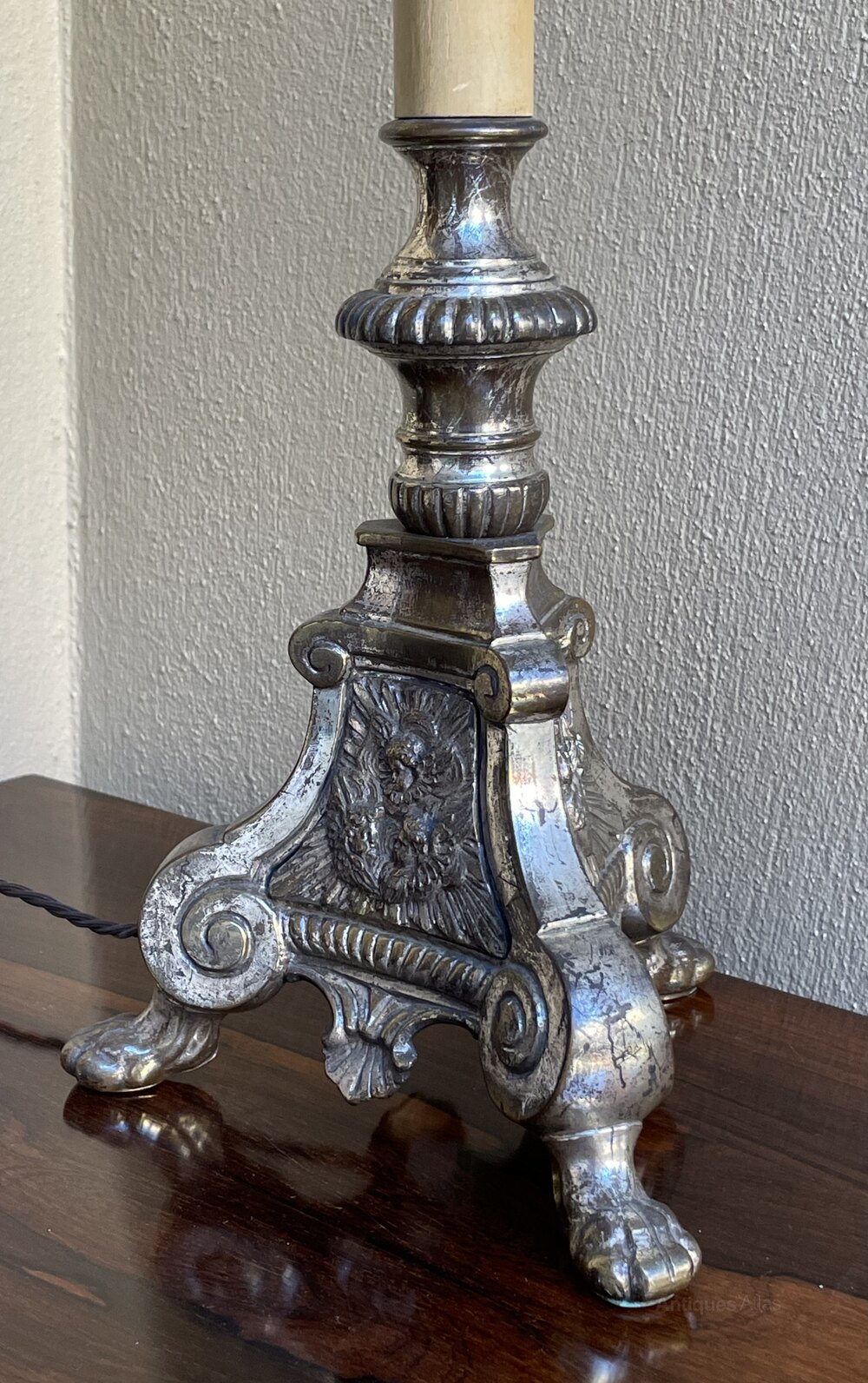 A very decorative late 19th century French silver plated candlestick table lamp, fully rewired in period style braided flex and PAT safety tested.In excellent condition and most pleasing patina to the silver plate.