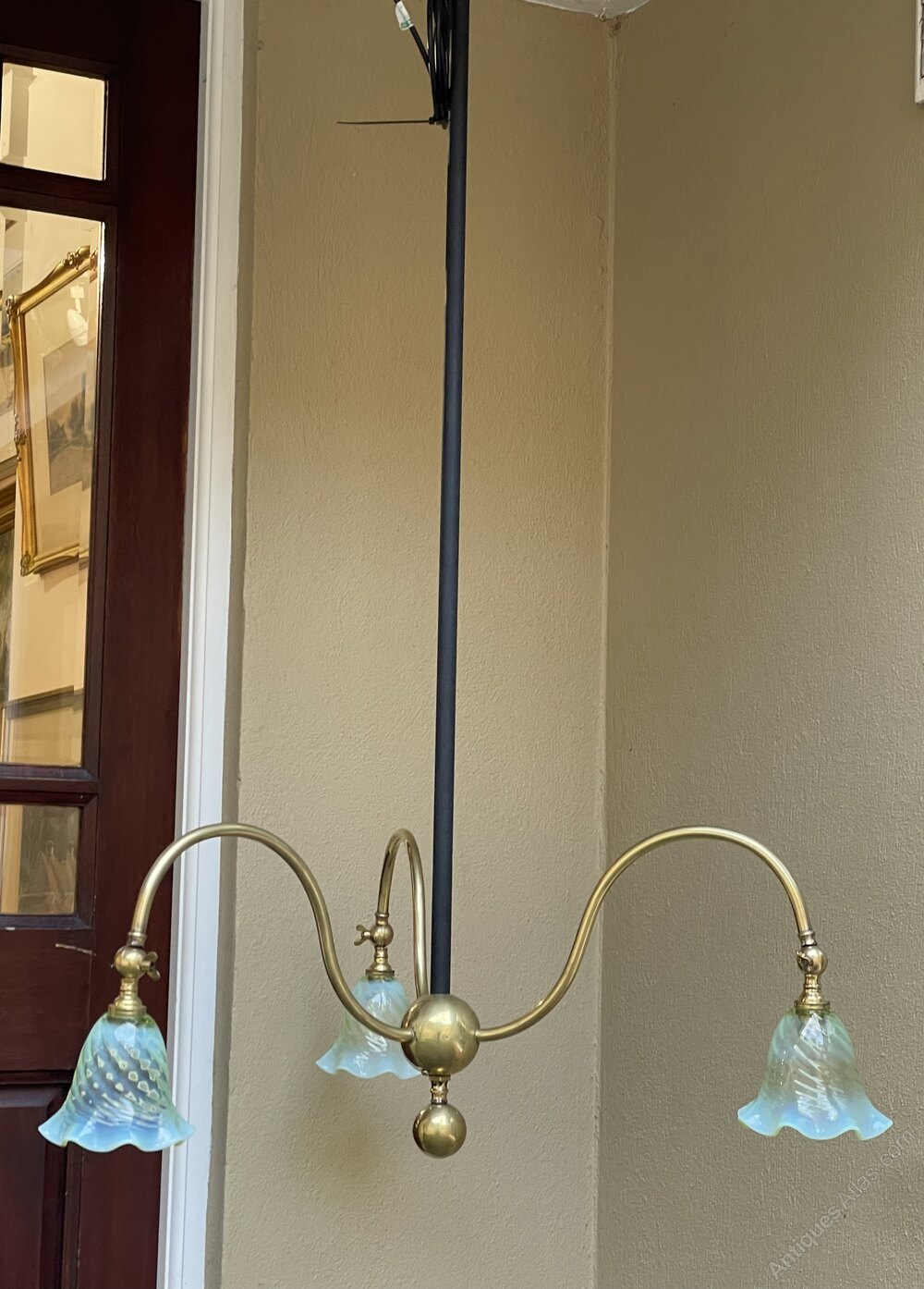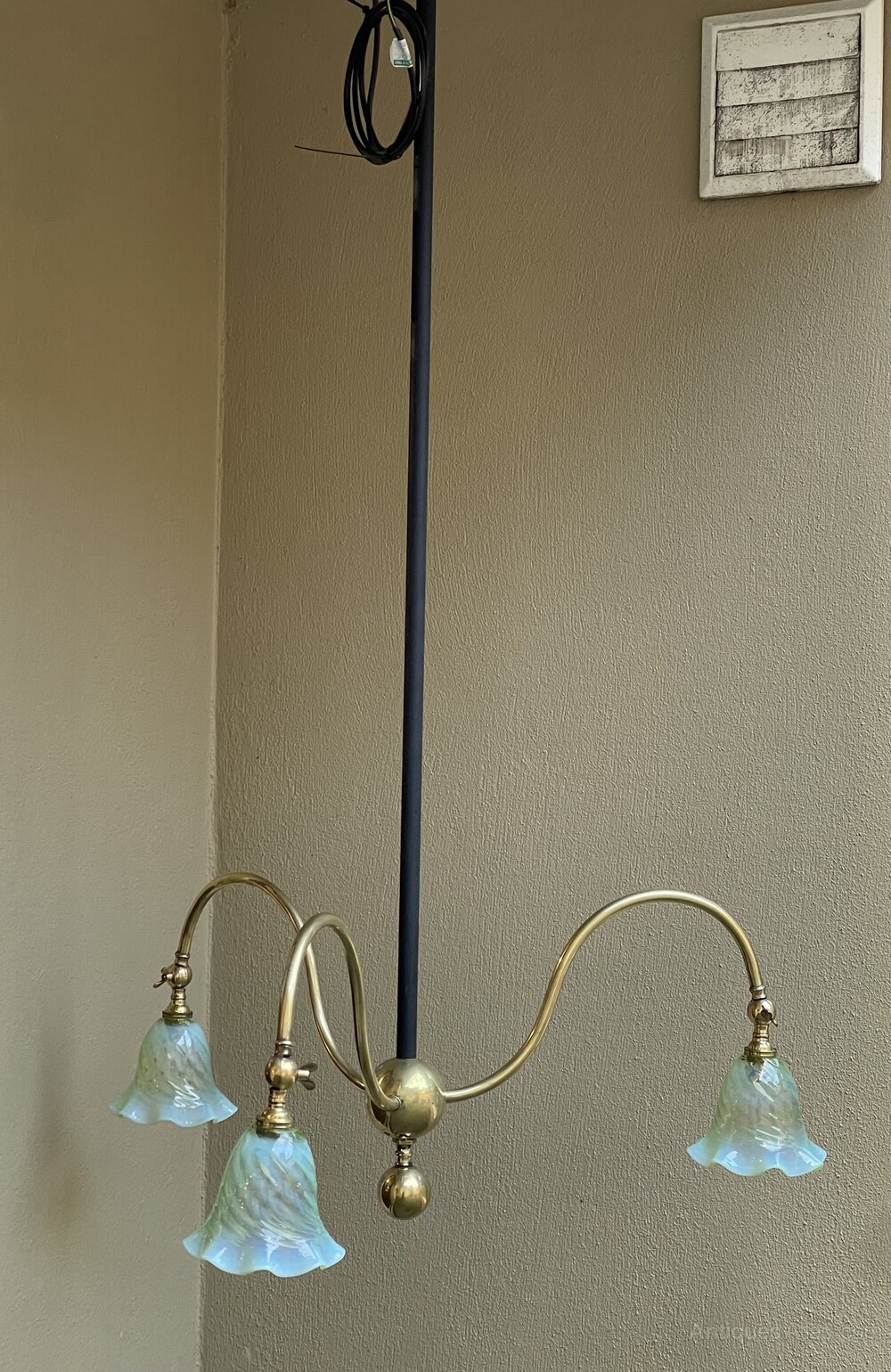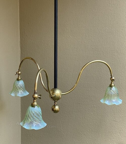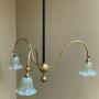 A fantastic Arts & Crafts period three arm ceiling lights from acquired from Manchester City Town Hall during the ongoing refurbishment. Fitted with replacement Vaseline glass shades.One of Two Available.