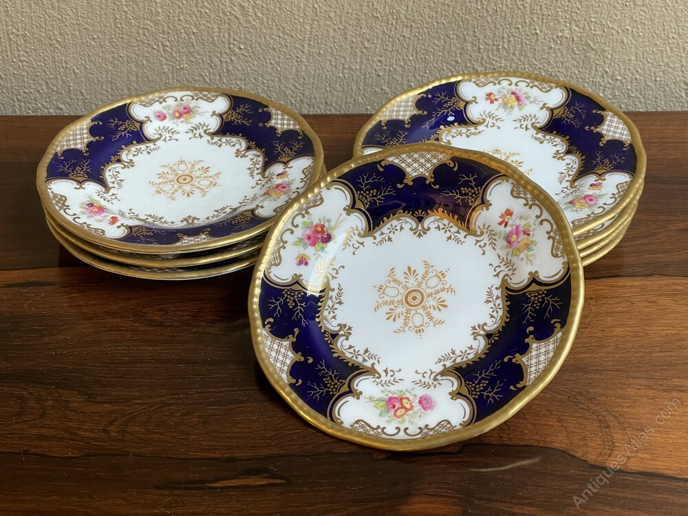 Eight Victorian Coalport batwing pattern 2665 cake / small plates, decorated in shaped cobalt blue bands, floral decorations and gilt highlights. 6 inch diameterSeven in excellent condition one with hairline crack to the base as illustrated.
