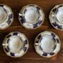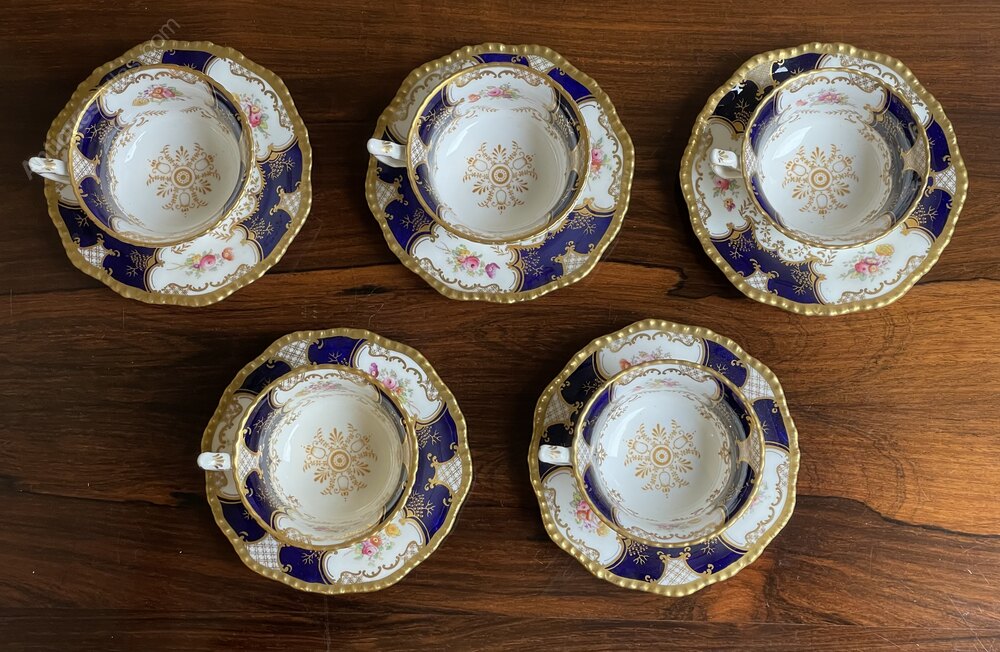 Victorian Coalport batwing pattern 2665 tea cups and saucers for five, decorated in shaped cobalt blue bands, floral decorations and gilt highlights.In excellent overall condition no damage or repair.