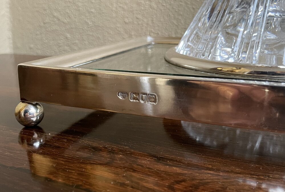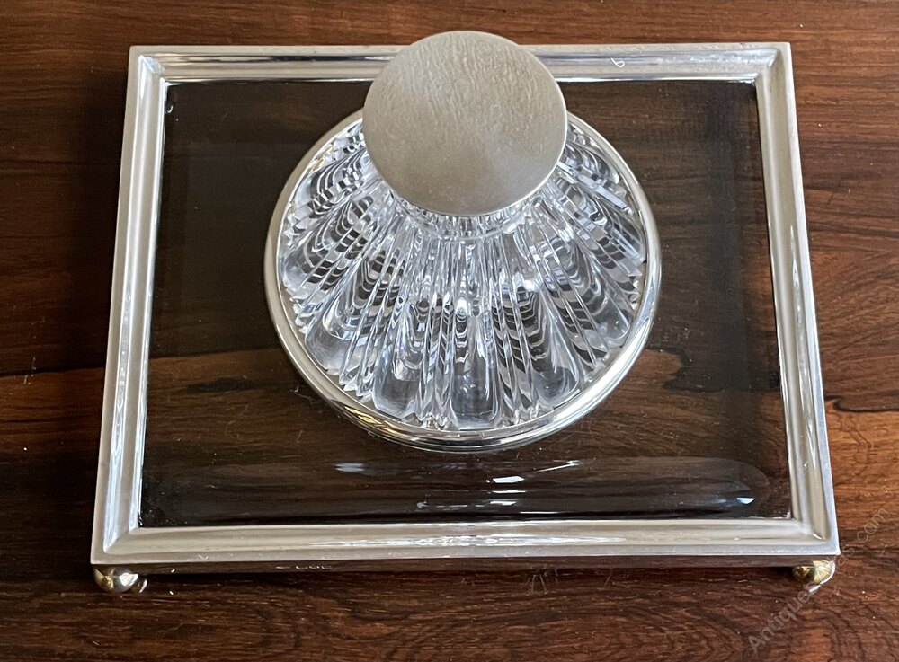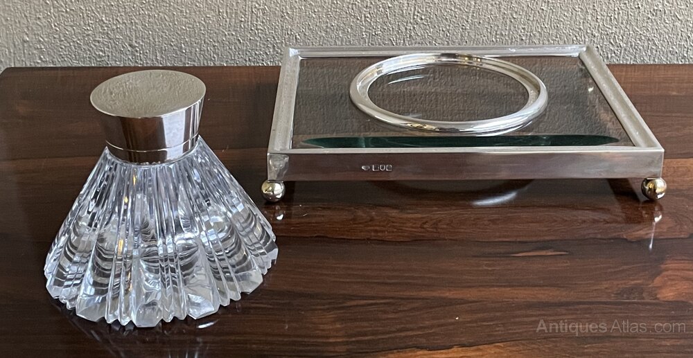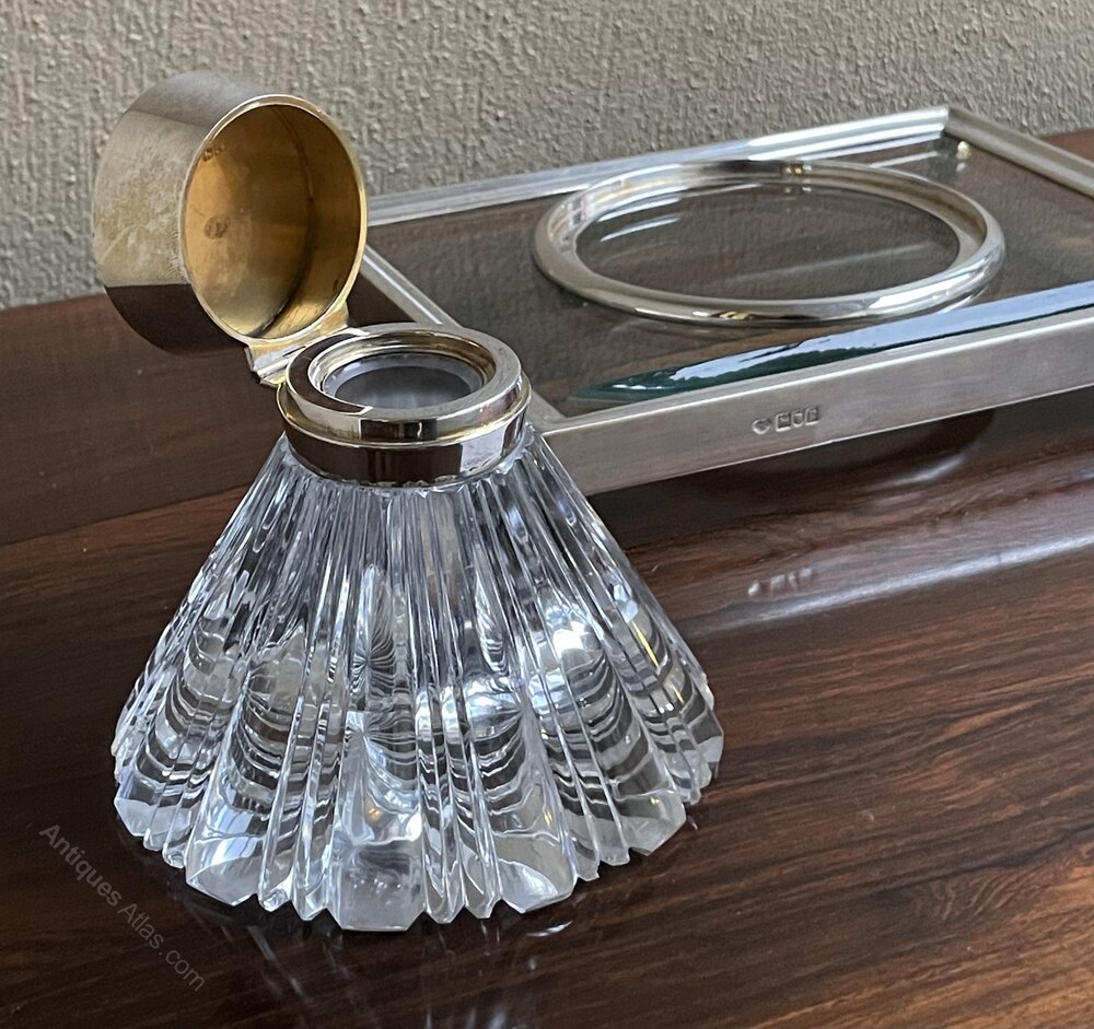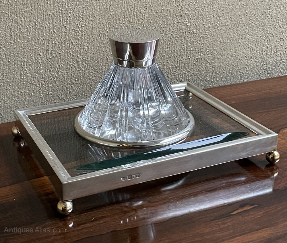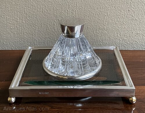 A beautiful Art Deco desk pieceA fine cut glass and silver mounted ink well and desk stand.