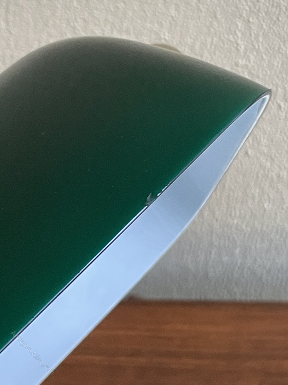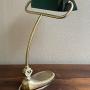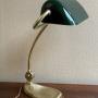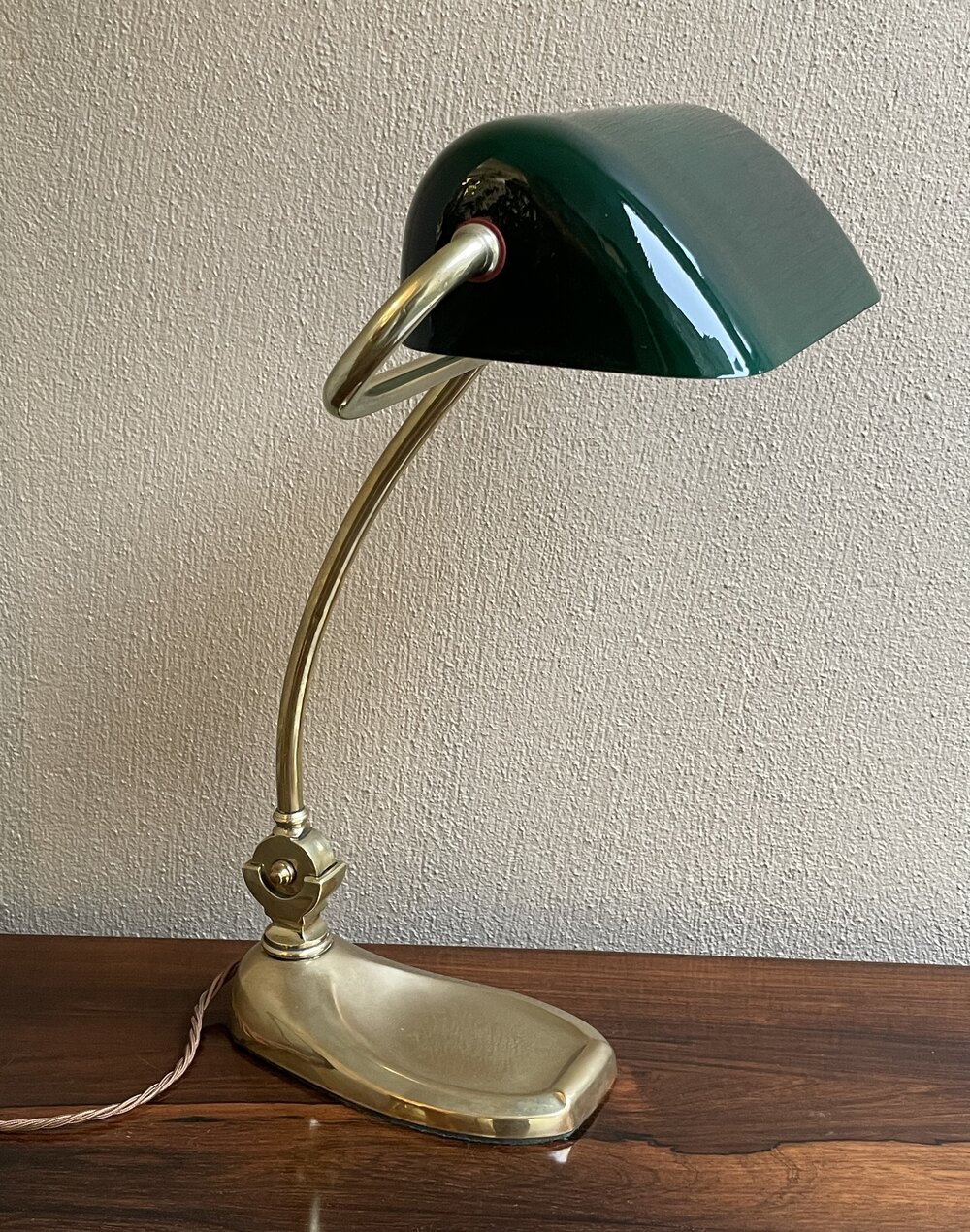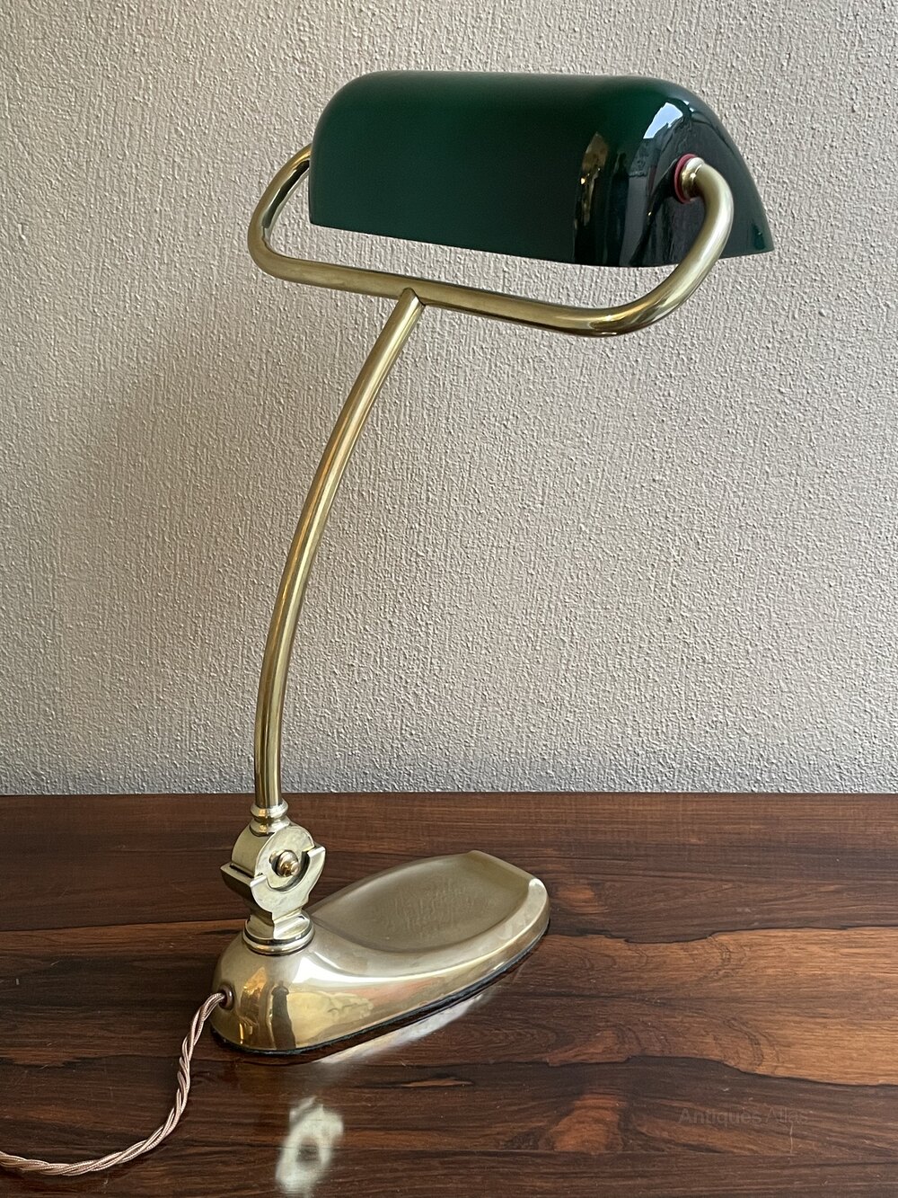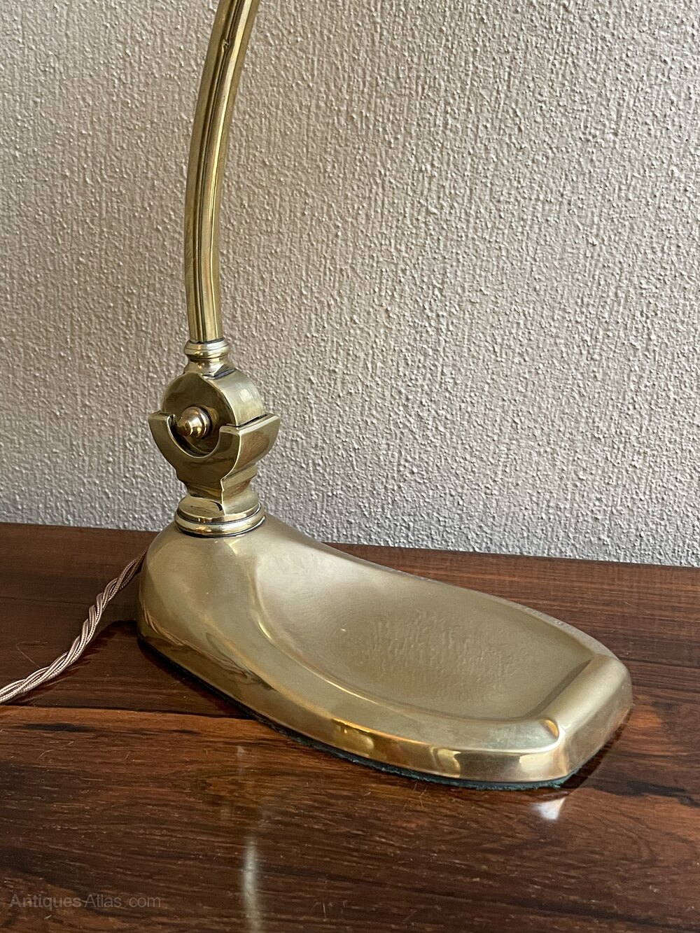 A fantastic Art Nouveau brass bankers / desk table lamp with a green glass trough shade. The simple yet elegant stem is adjustable, as is the shade. A fine lamp, in superb condition, with a very pleasing patina, fully rewired in period style braided flex and PAT safety tested.There is the tiniest of chip to the shade, as illustrated.