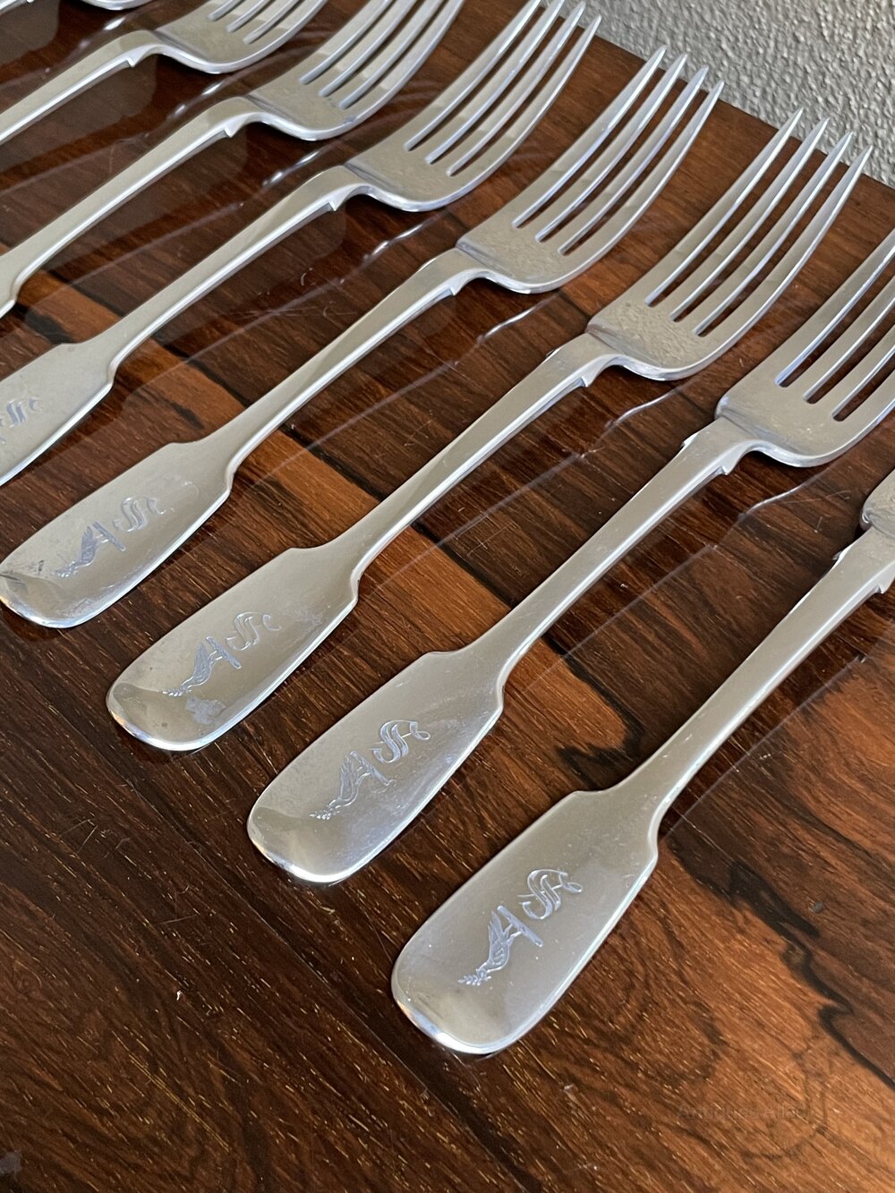 A good set of nine early Victorian solid silver dinner forks (length: 20cm)All hallmarked for Dublin 1839 by Edward Twycross. Each with crest and initial S.