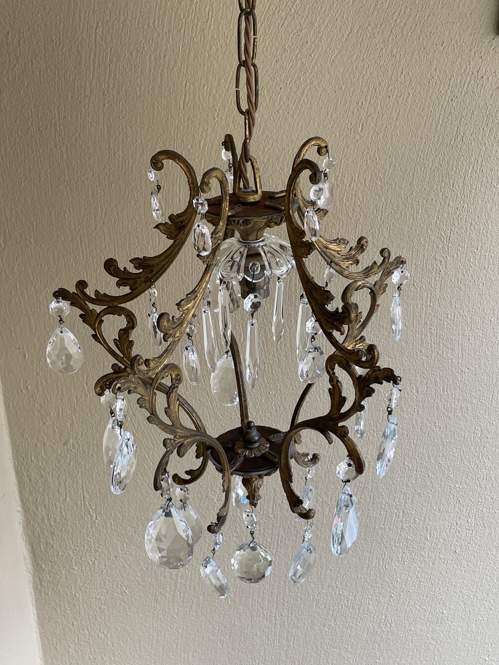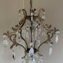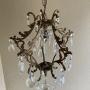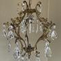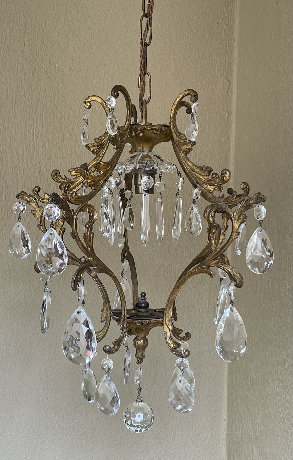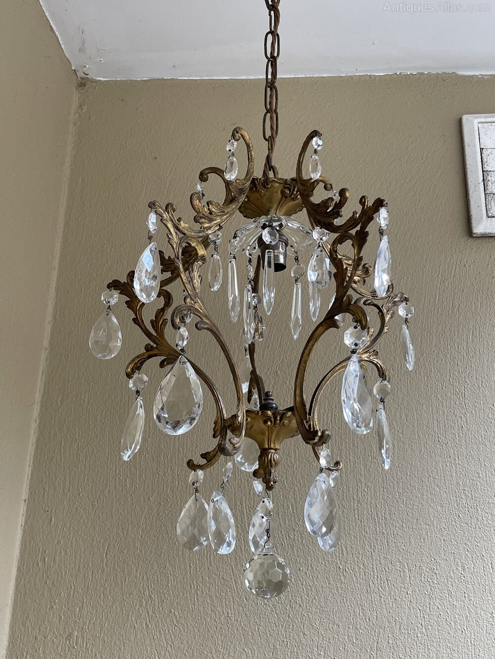A very pretty Italian early 20th century single light gilt antique bird cage chandelier, with single light and the frame extensively decorated with crystal faceted pendants, complete with chain and original ceiling rose. Fully rewired in period style braided flex and PAT safety tested.Excluding the chain and ceiling plate the dimensions are as follows: