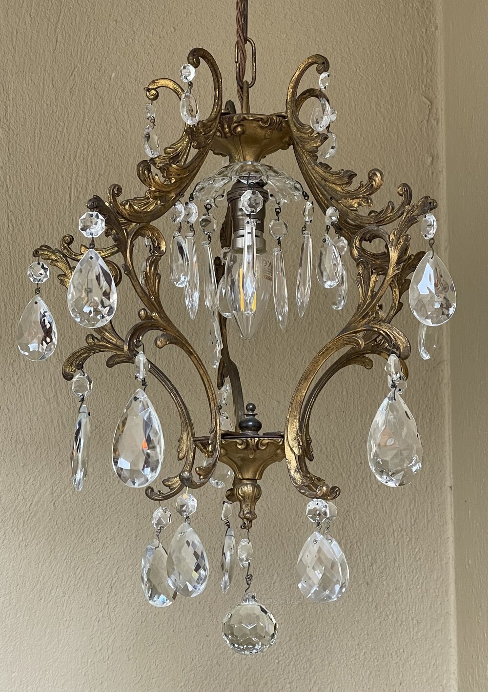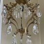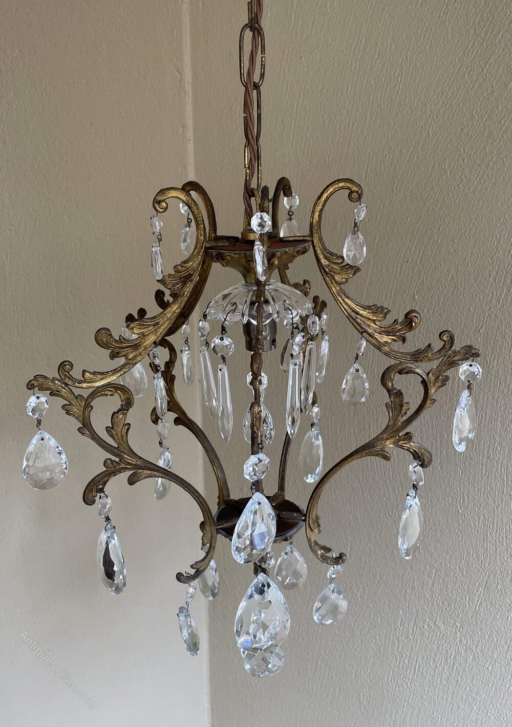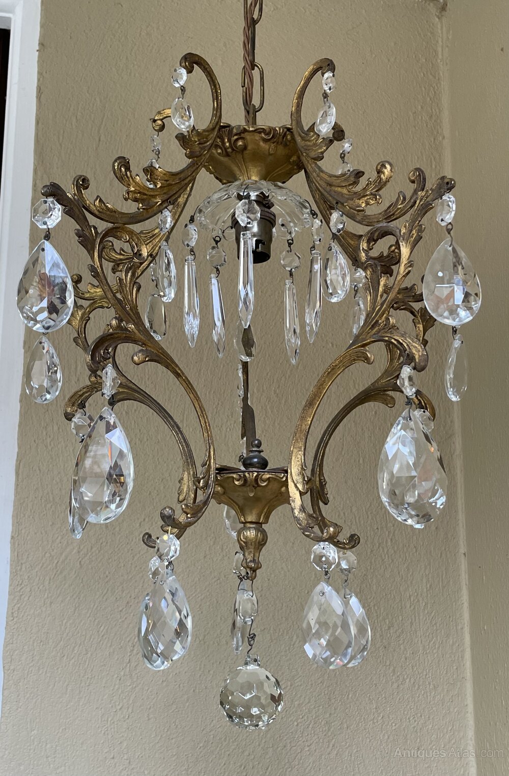 A very pretty Italian early 20th century single light gilt antique bird cage chandelier, with single light and the frame extensively decorated with crystal faceted pendants, complete with chain and original ceiling rose. Fully rewired in period style braided flex and PAT safety tested.Excluding the chain and ceiling plate the dimensions are as follows: